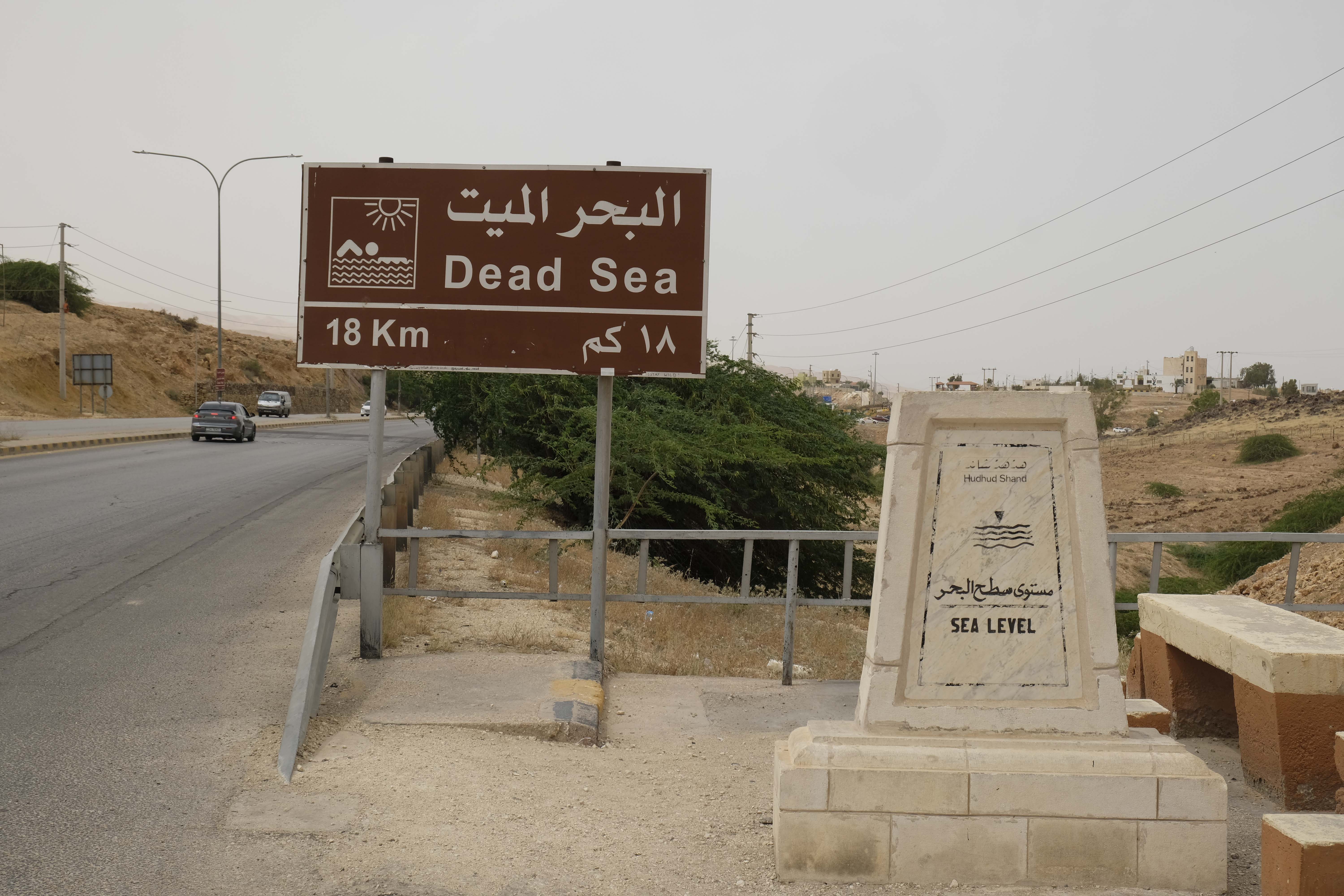 Auf dem Weg passieren wir den Level Zero, d.h. wir befinden uns auf dem Level des Meeresspiegels und fahren ab jetzt in die Tiefe hinunter zum Jordan, der ca. 400 m unter dem Meeresspiegel liegt.