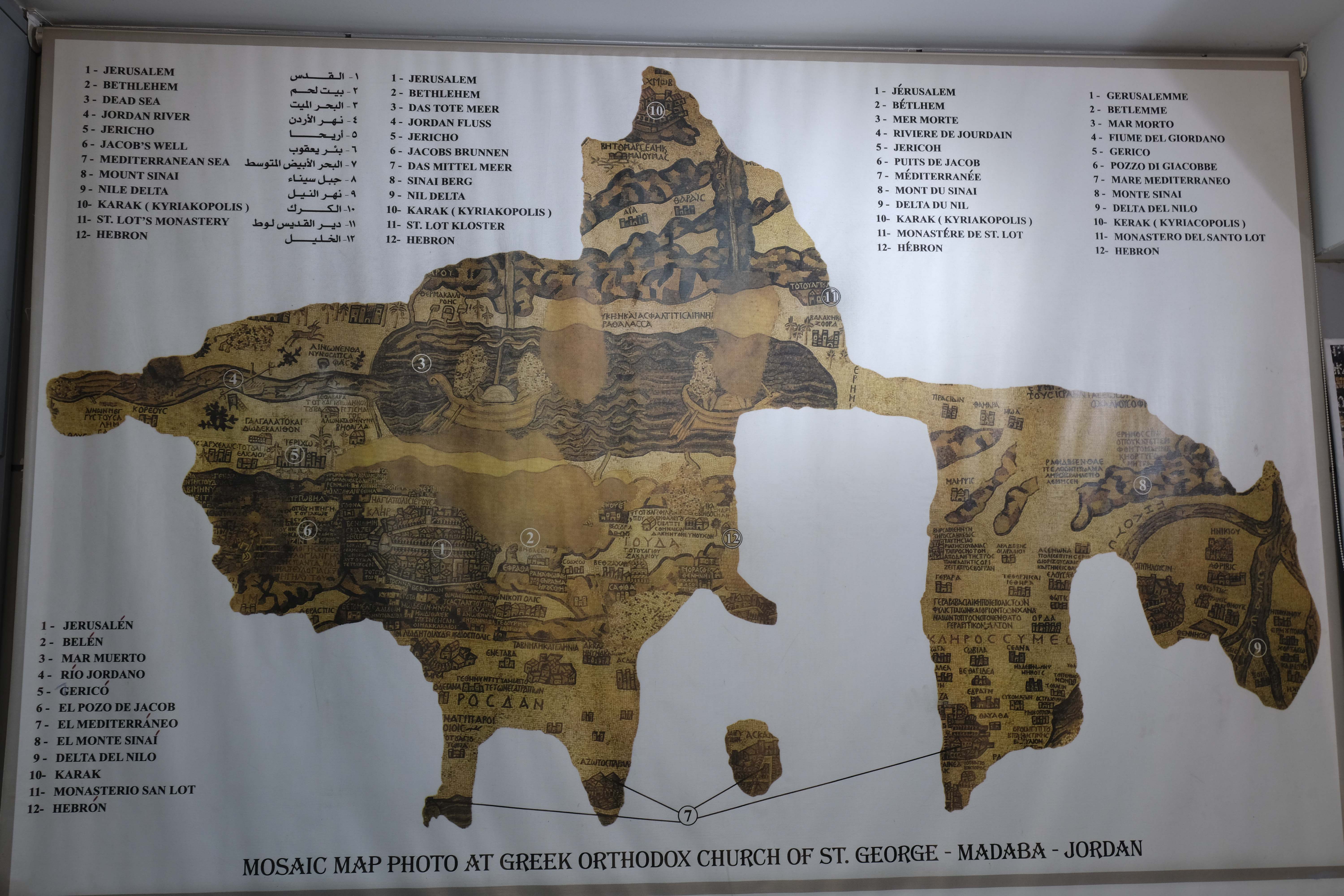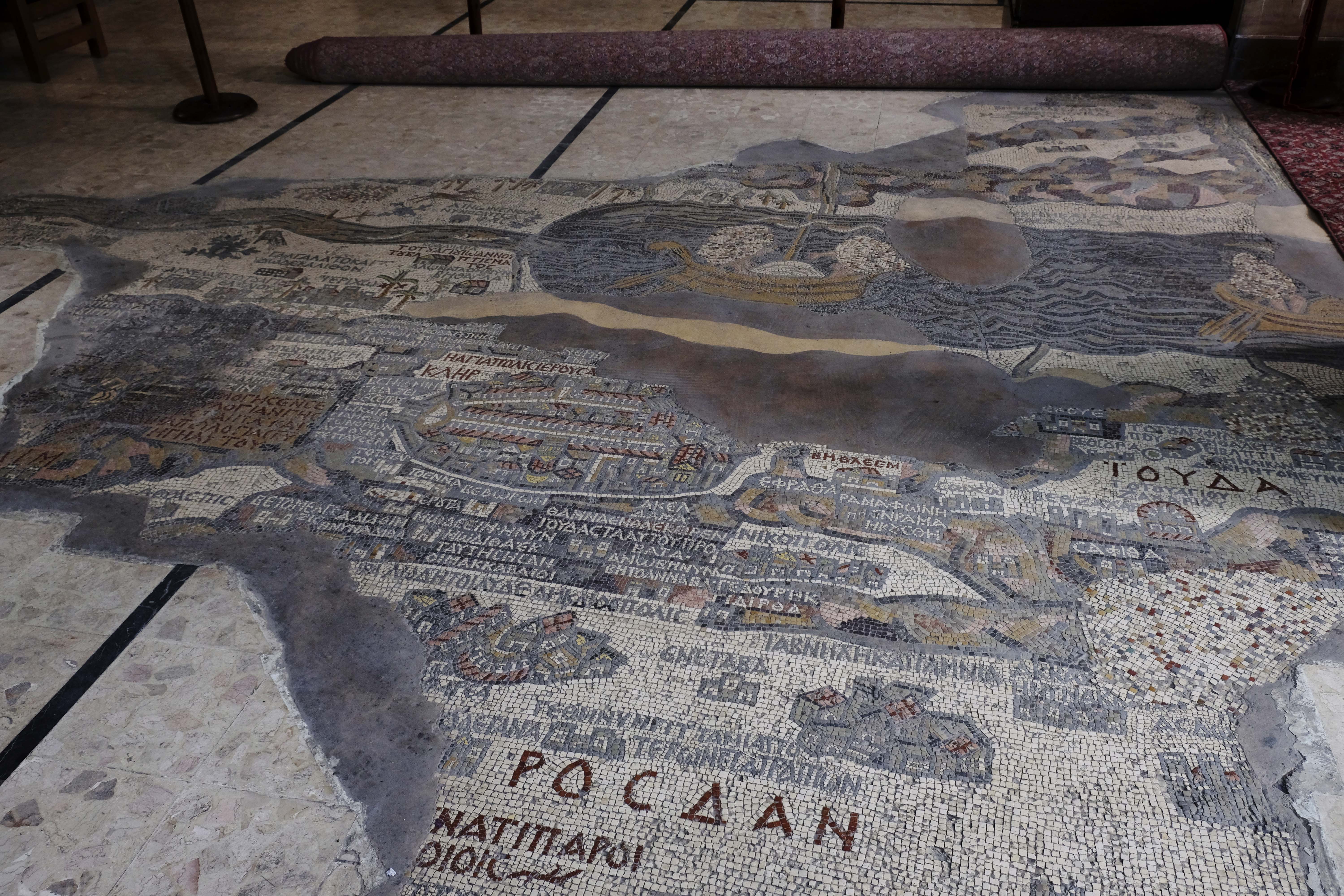 Die berühmte byzantinische Mosaiklandkarte von Palästina stammt aus dem 6.Jhd und befindet sich noch heute an ihrem ursprünglichen Platz auf dem Boden der griechisch-orthodoxen St. Georgs-Kirche. Diese Landkarte zeigt das heilige Land zur byzantinischen Zeit.