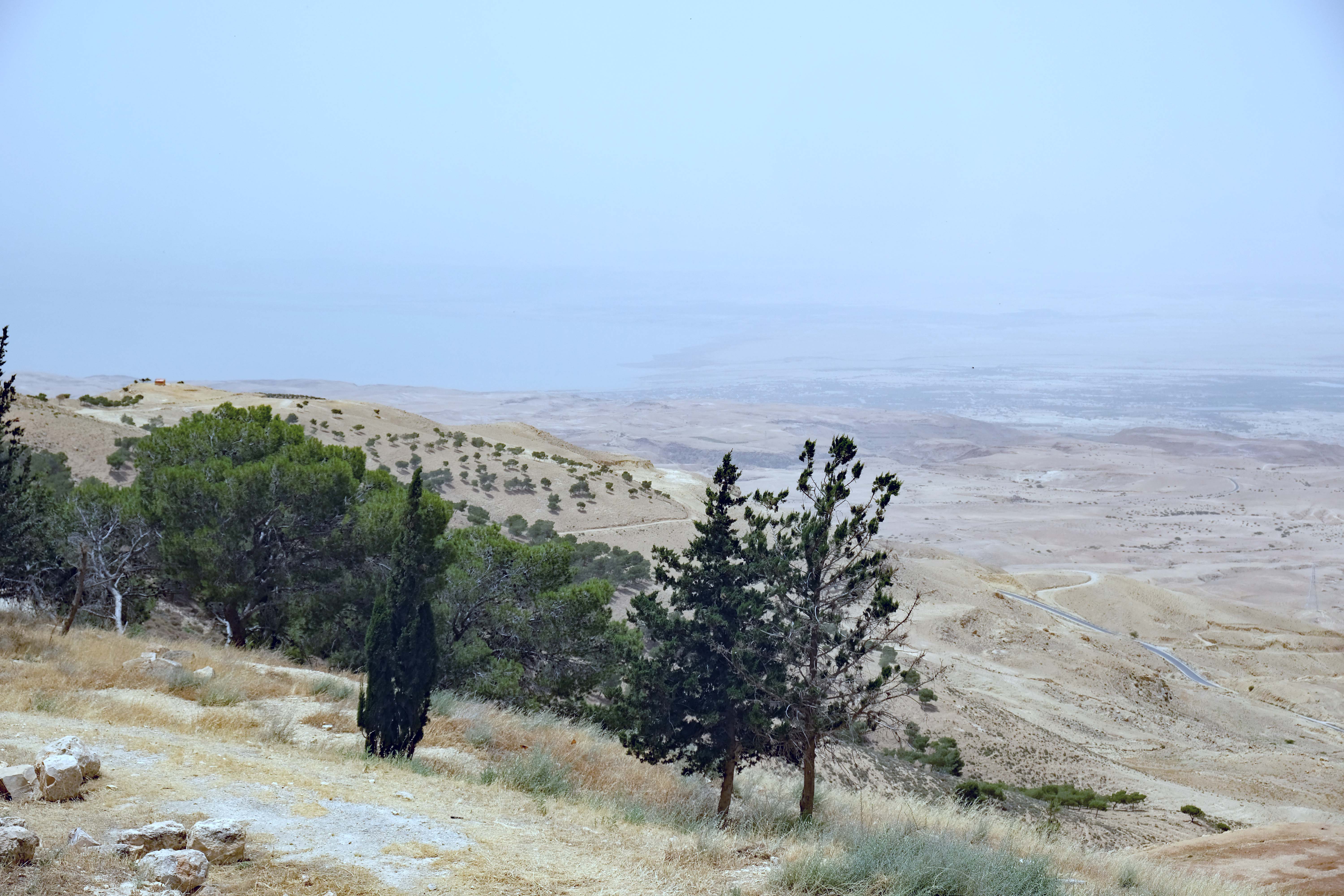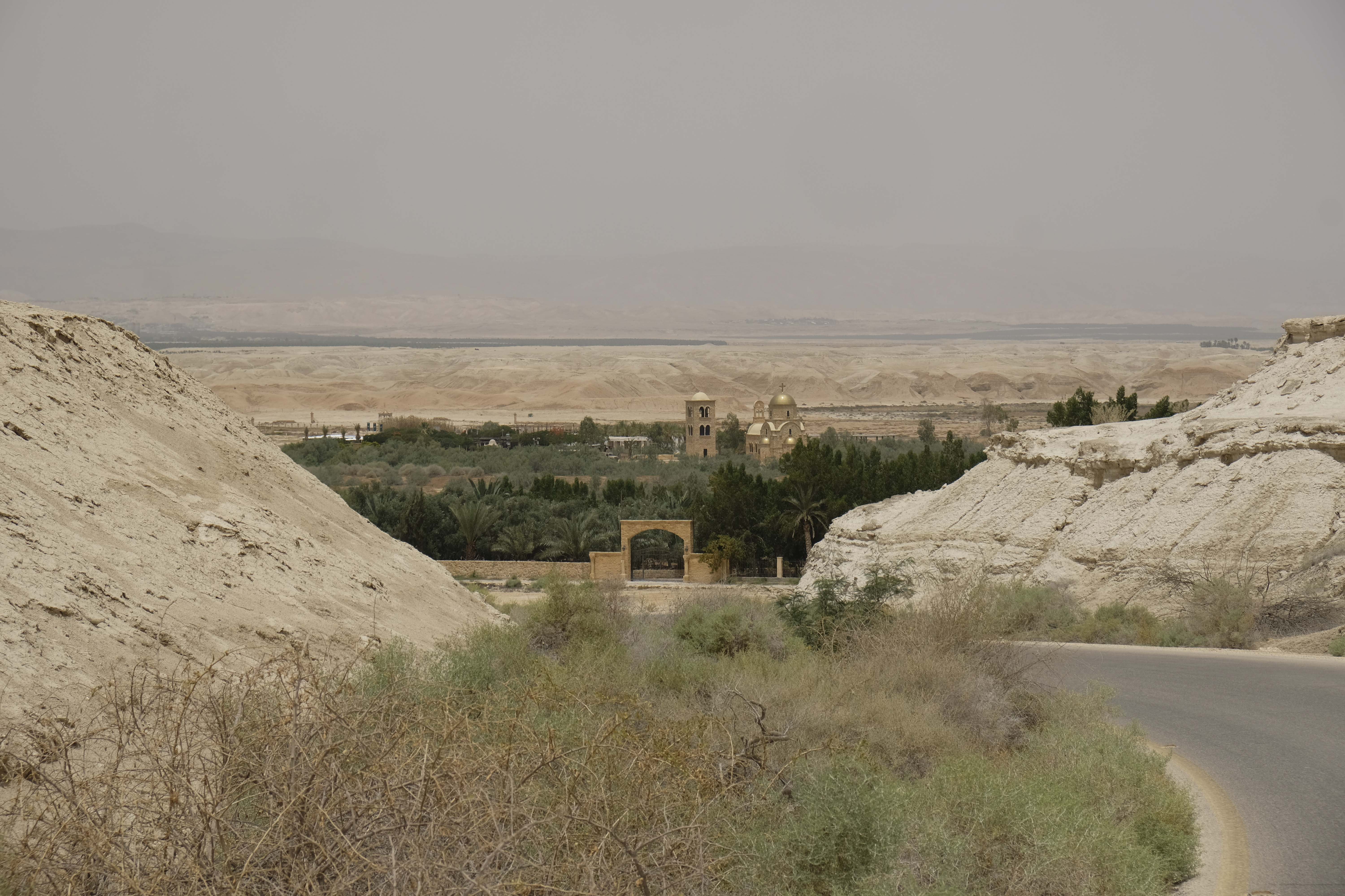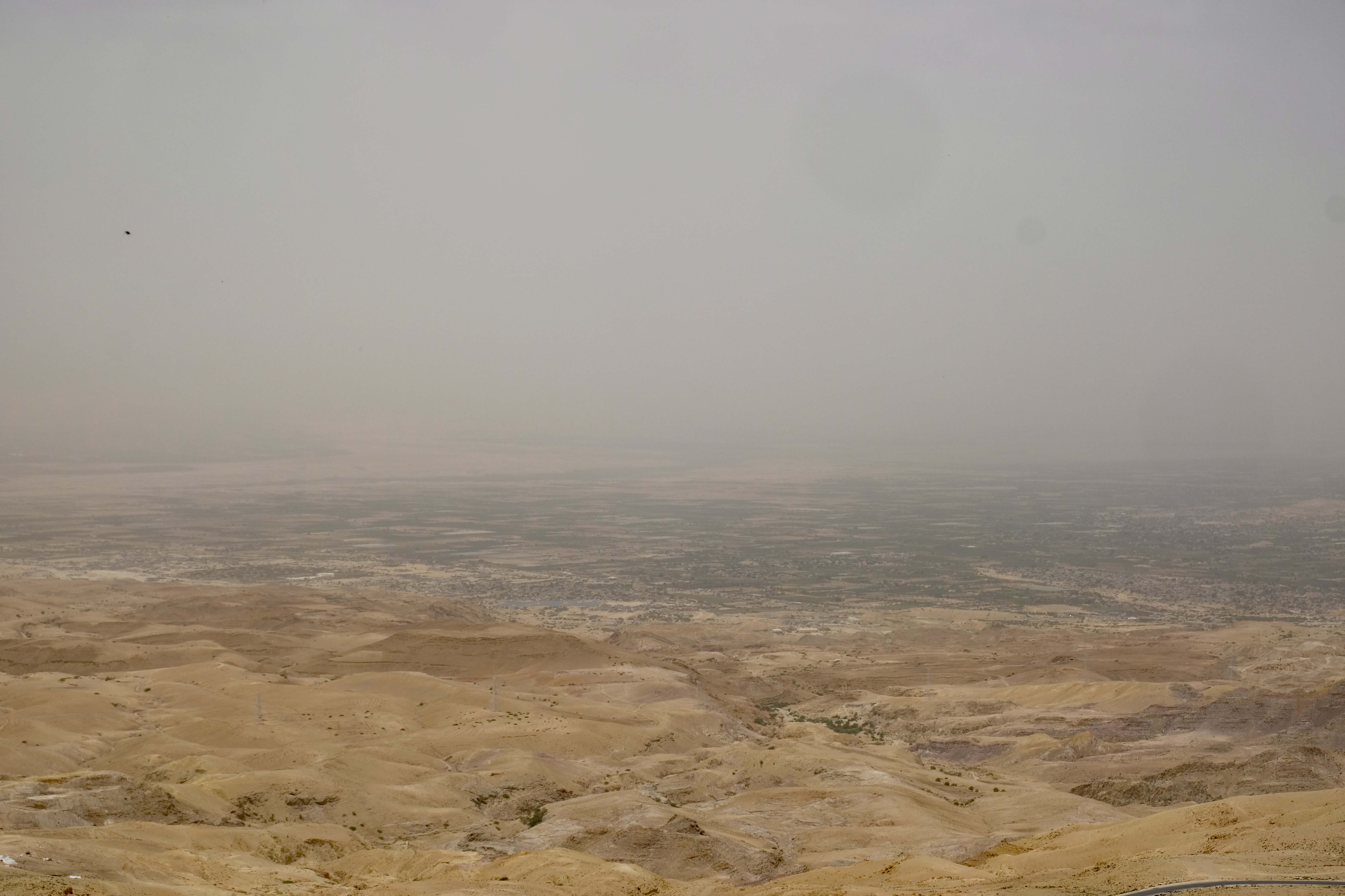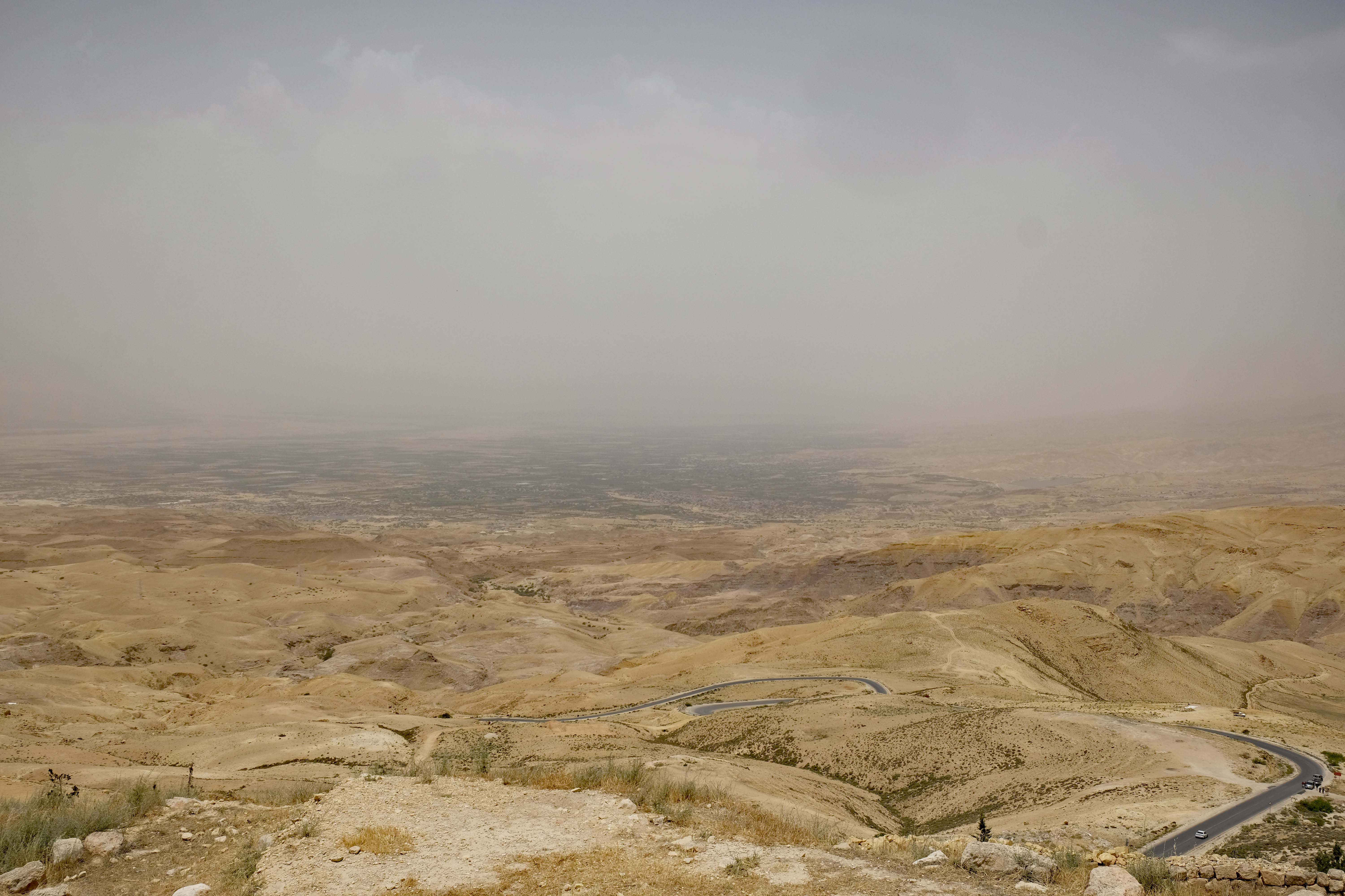 Der Blick vom 840m hohen Berg Nebo verspricht einen großartigen Blick auf das Jordantal und die Abhänge des Jordangrabens, der Teil des African Rift Valley ist und seine Fortsetzung im Roten Meer und Tansania bis nach Südafrika erfährt. Bei klarer Sicht kann man über das Tote Meer hinweg bis nach Jericho blicken. Wir haben allerdings aufgrund des Dunstes nur das Tote Meer gesehen. Wir hoffen, Moses hatte eine klarereSicht, als er den Berg Nebo bestieg.