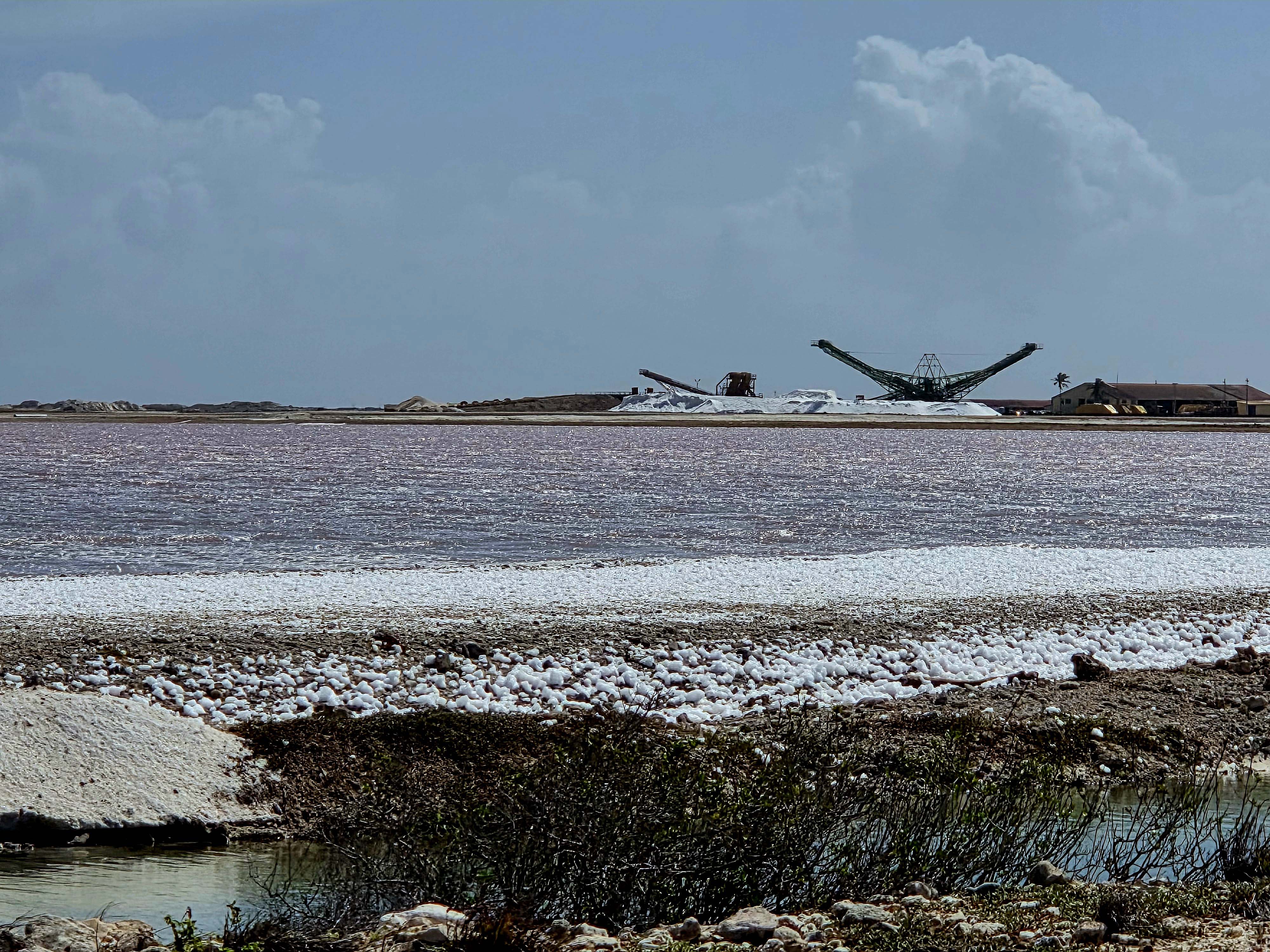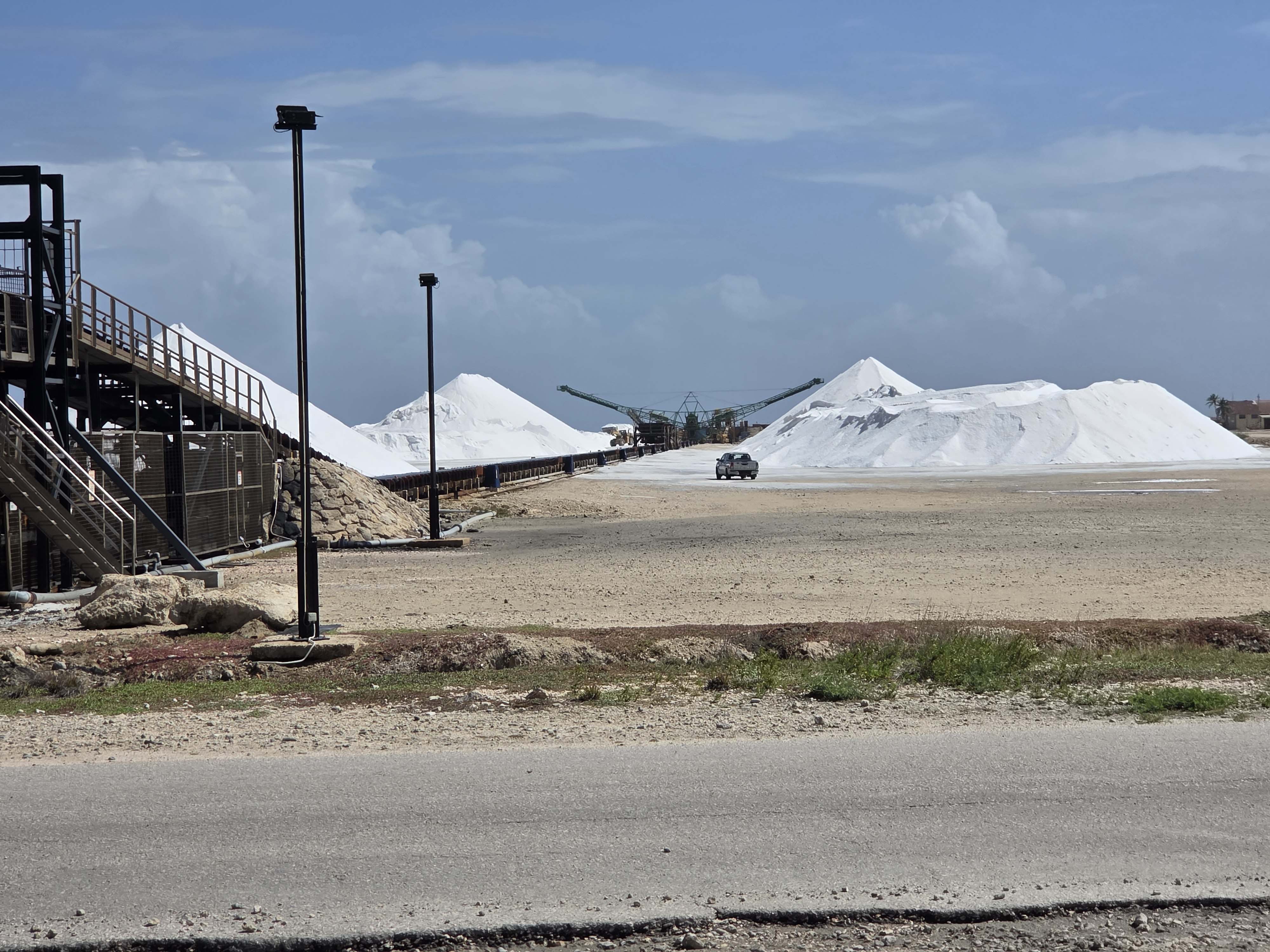 Am Ende besichtigen wir eine große Salzgewinnungsanlage. Das Meerwasser wird in riesigen Speichern getrocknet bis es rosa kristallin glänzt. Dann wird es „geerntet“ und über das große Förderband auf Schiffe verladen und zur Weiterverarbeitung gebracht.