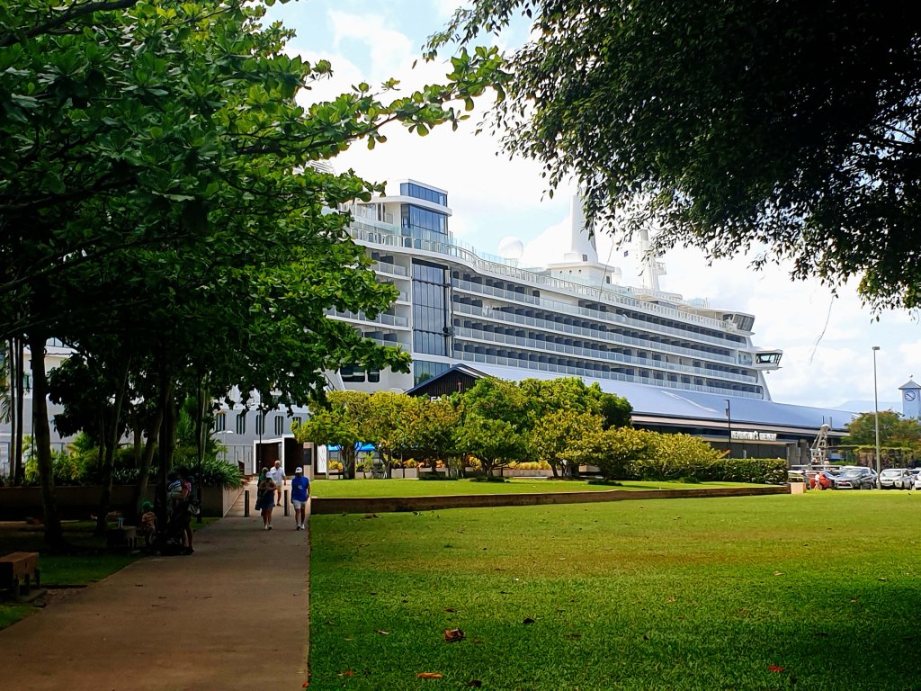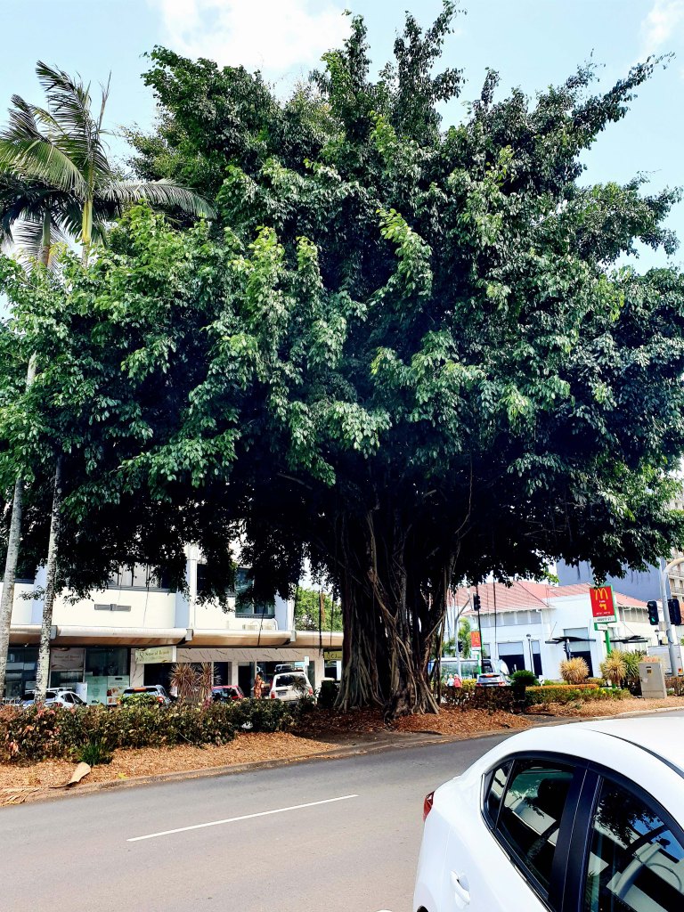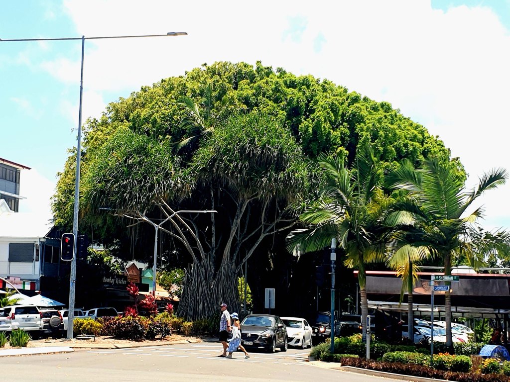 Cairns zeigt sich in der Stadt auch von seiner tropischen Seite durch viele kleine Parks und Grünstreifen zwischen den großzügigen Fahrbahnen. Selbst auf dem Mittelstreifen wachsen riesige Gummi- und Ficus-Bäume.