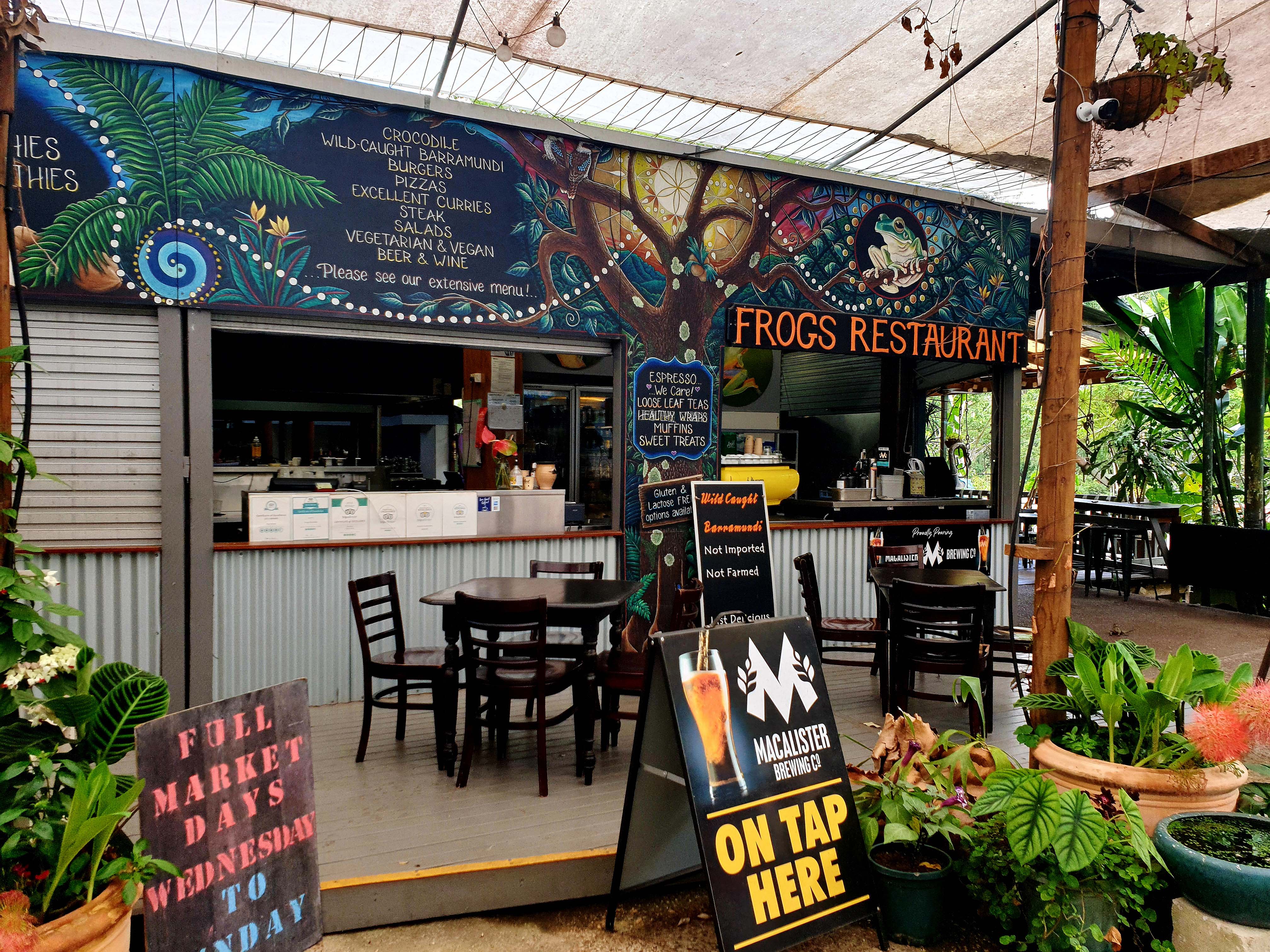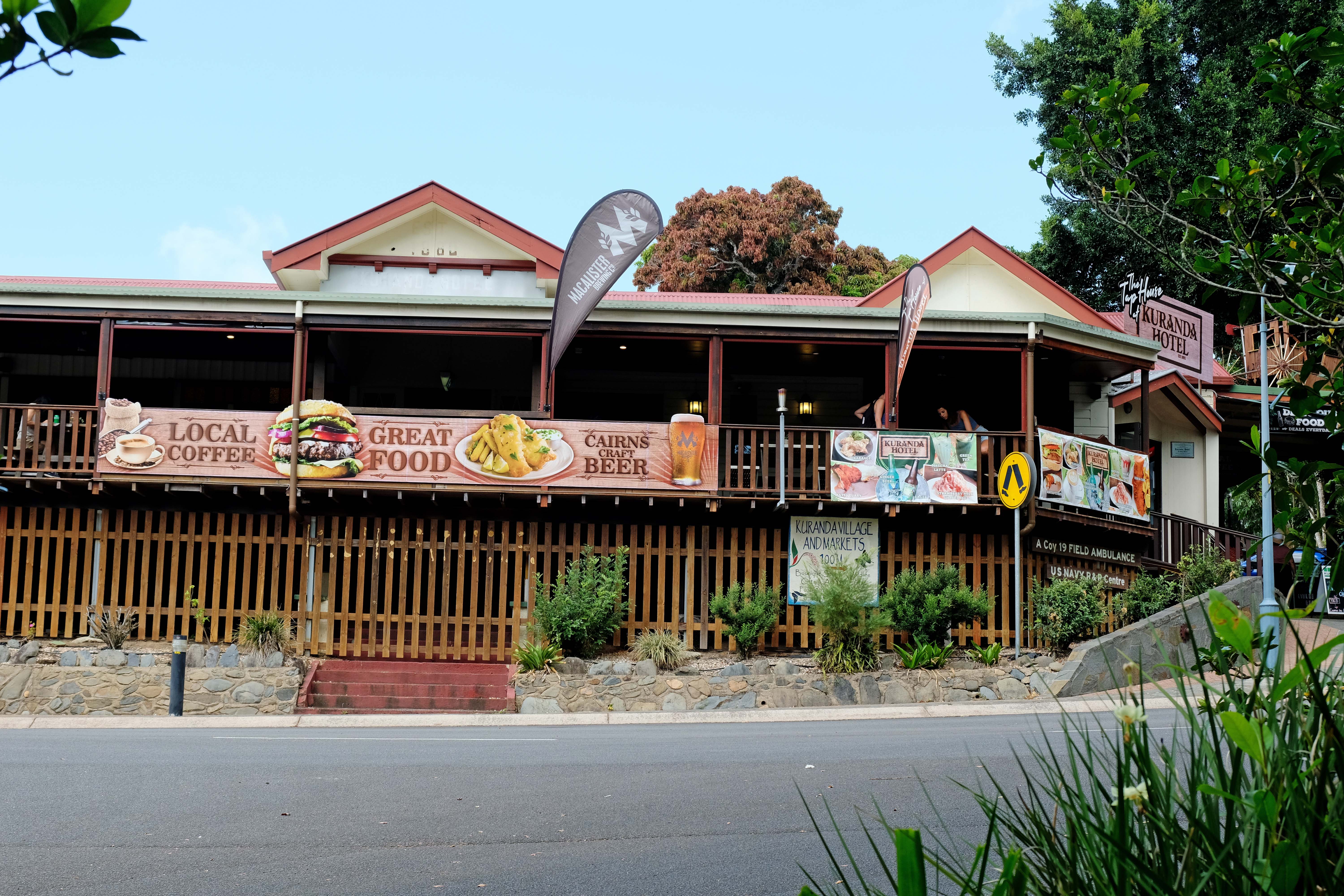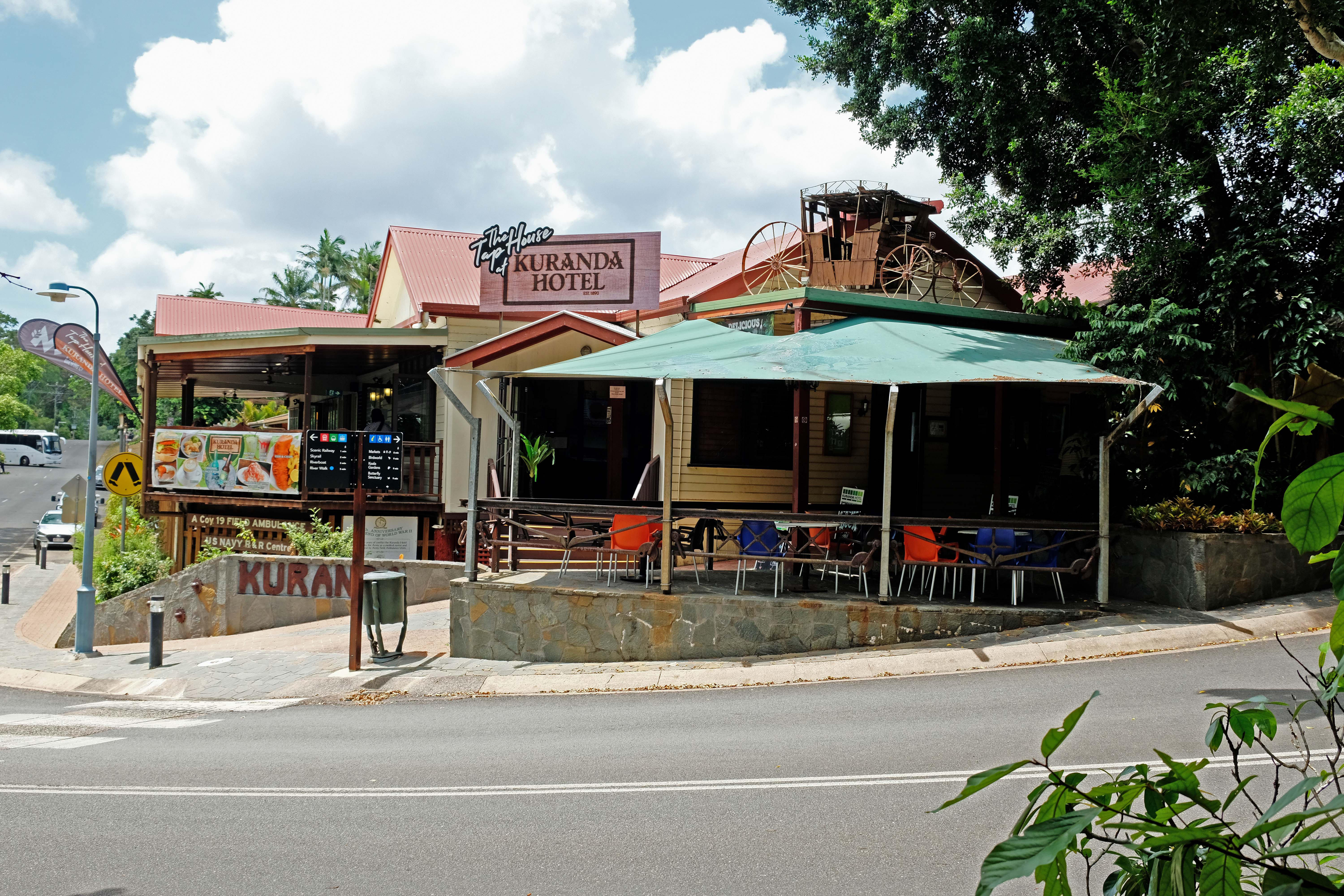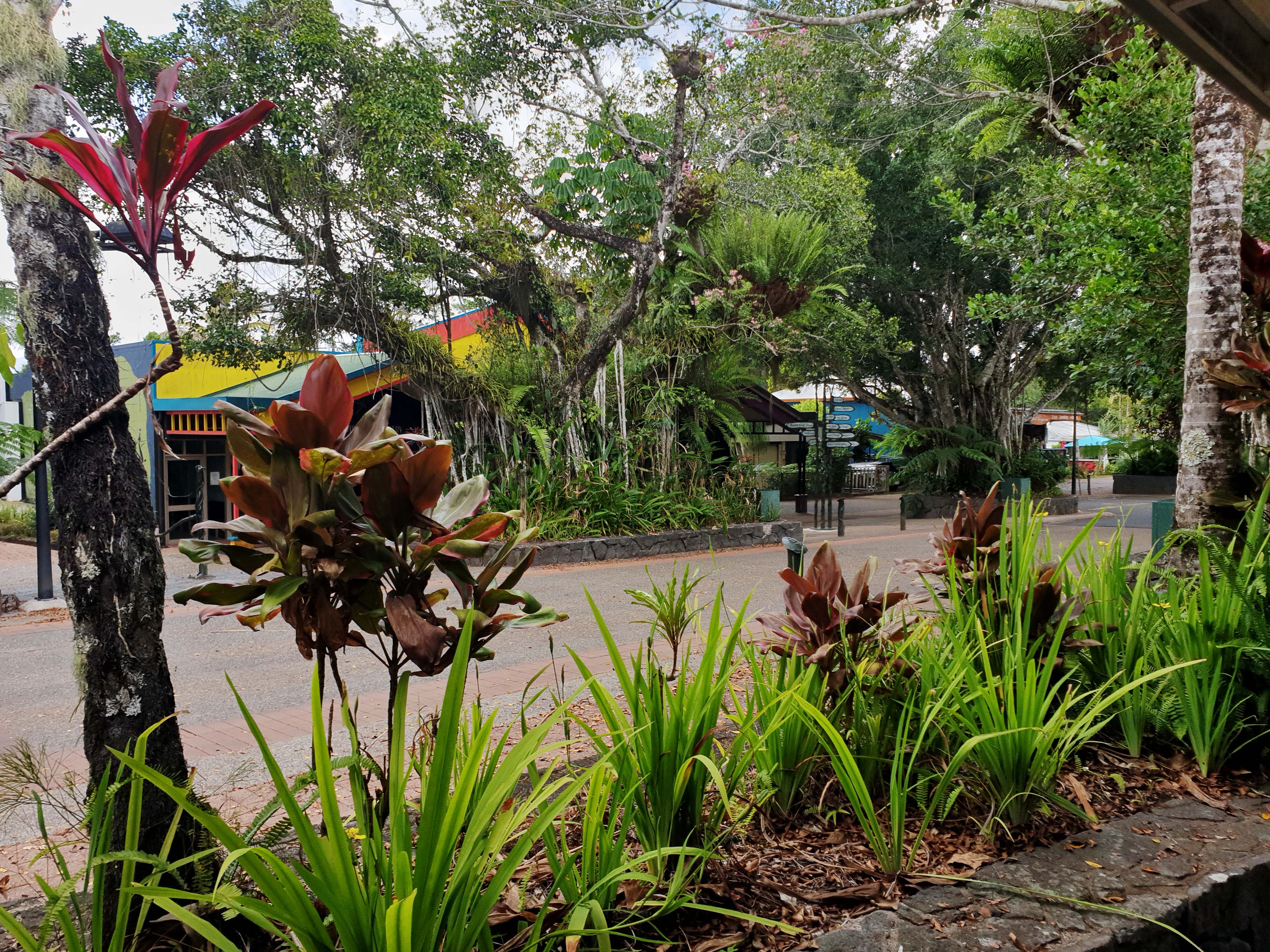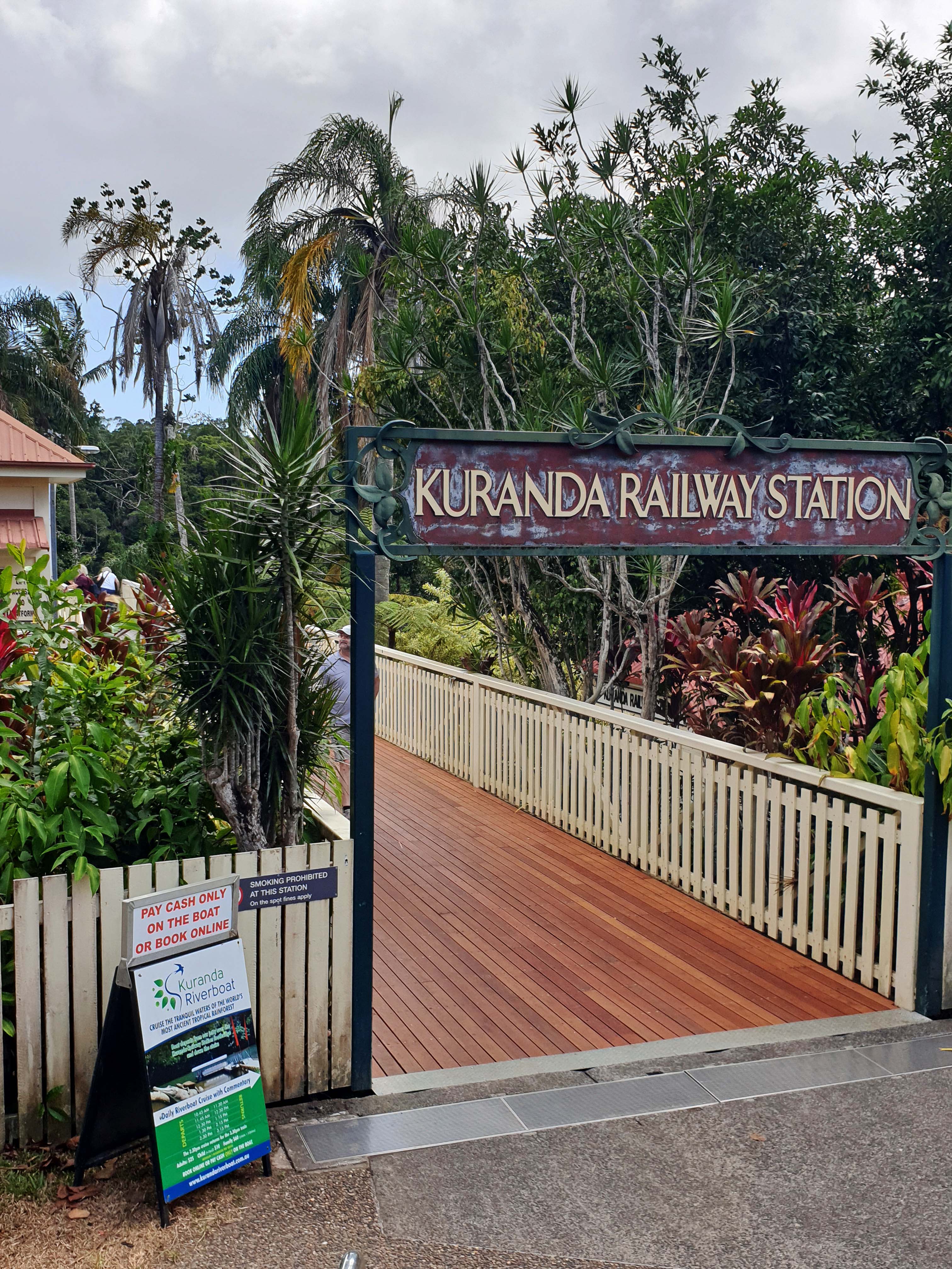 Von der Seilbahnstation aus laufen wir vorbei am historischen Bahnhof entlang der Hauptstraße von Kuranda. Glücklicherweise ist es dienstags nicht so überlaufen, da die meisten Geschäfts geschlossen sind. Das schont den Geldbeutel.