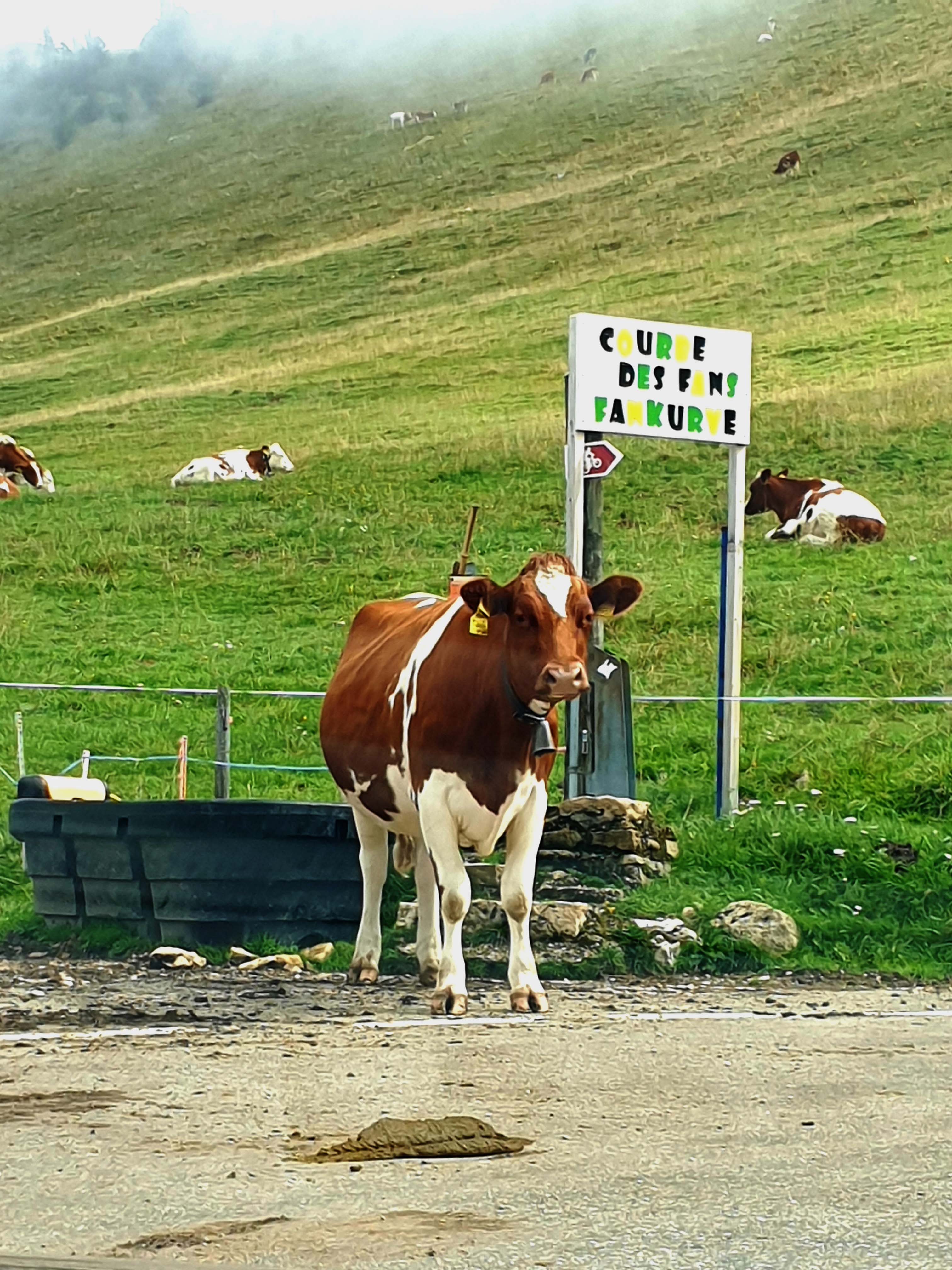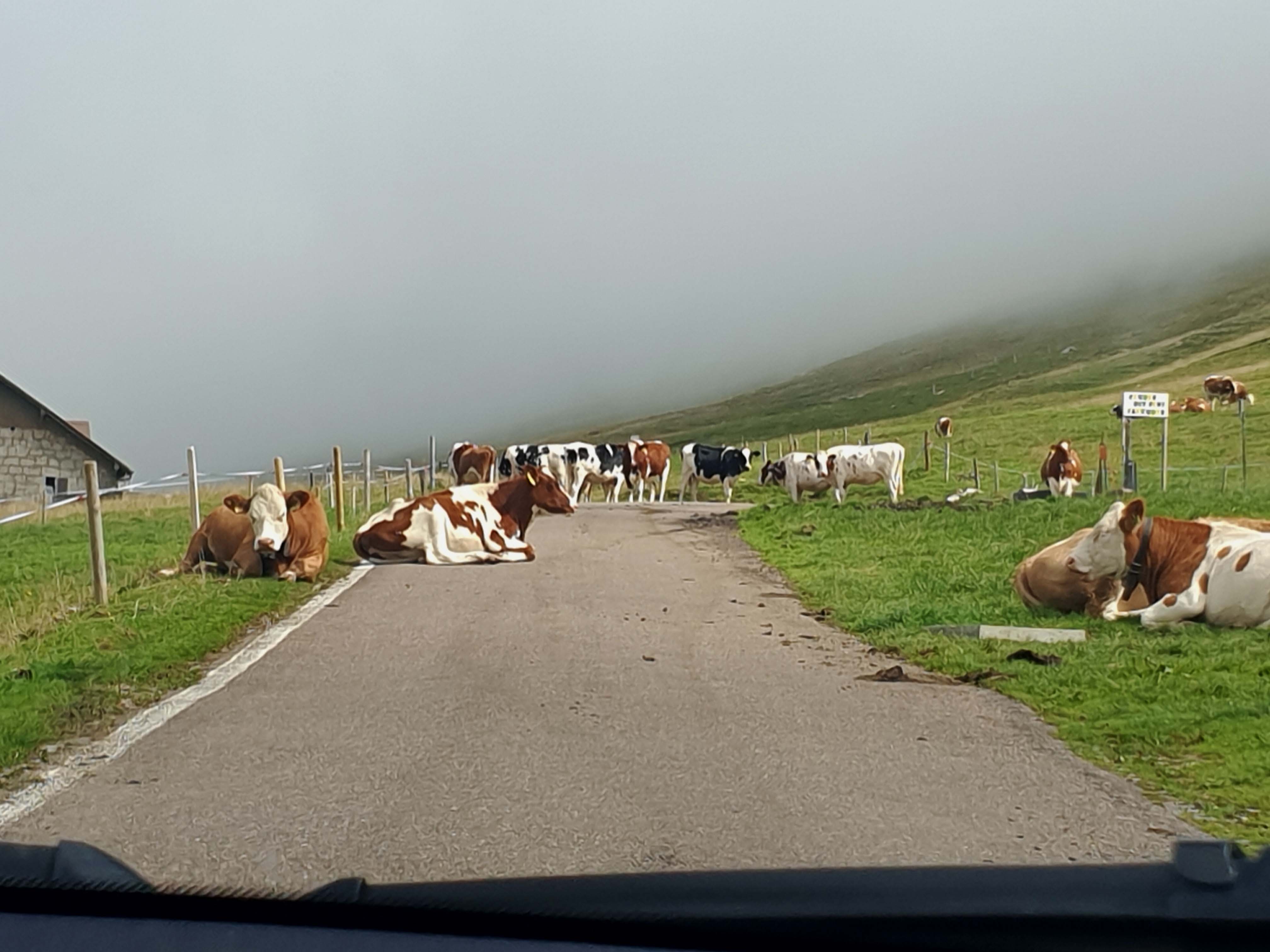 Doch schon bald wartet der erste Höhepunkt auf uns: der Col du Chasseral (1502m), eine einspurige Straße mit Ausweichbuchten und vielen „Fans“ an und auf der Straße.
