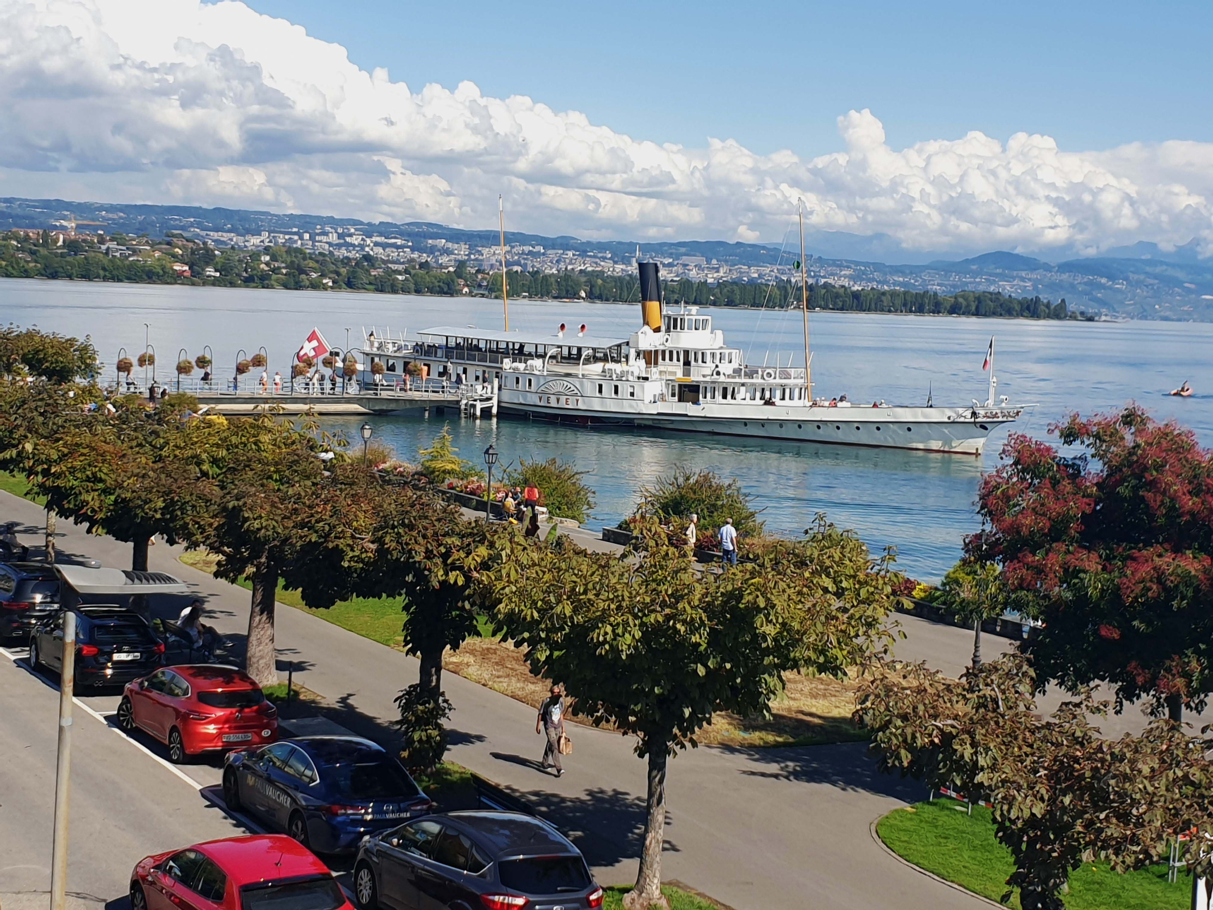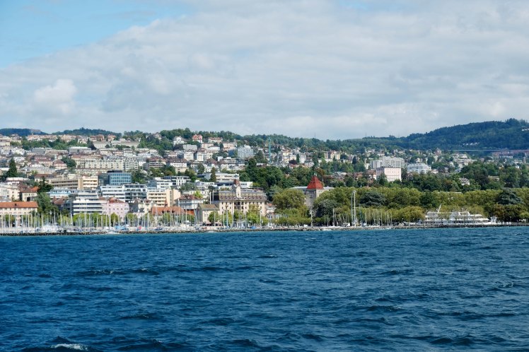 Heute ist es sehr windig. Trotzdem entscheiden wir wir uns, mit dem Schiff nach Lausanne zu fahren. Wir schwanken ordentlich, als wir quer zu den Wellen zur Seemitte herausfahren. Bärbel wählt sicherheitshalber einen Platz draußen an Deck.