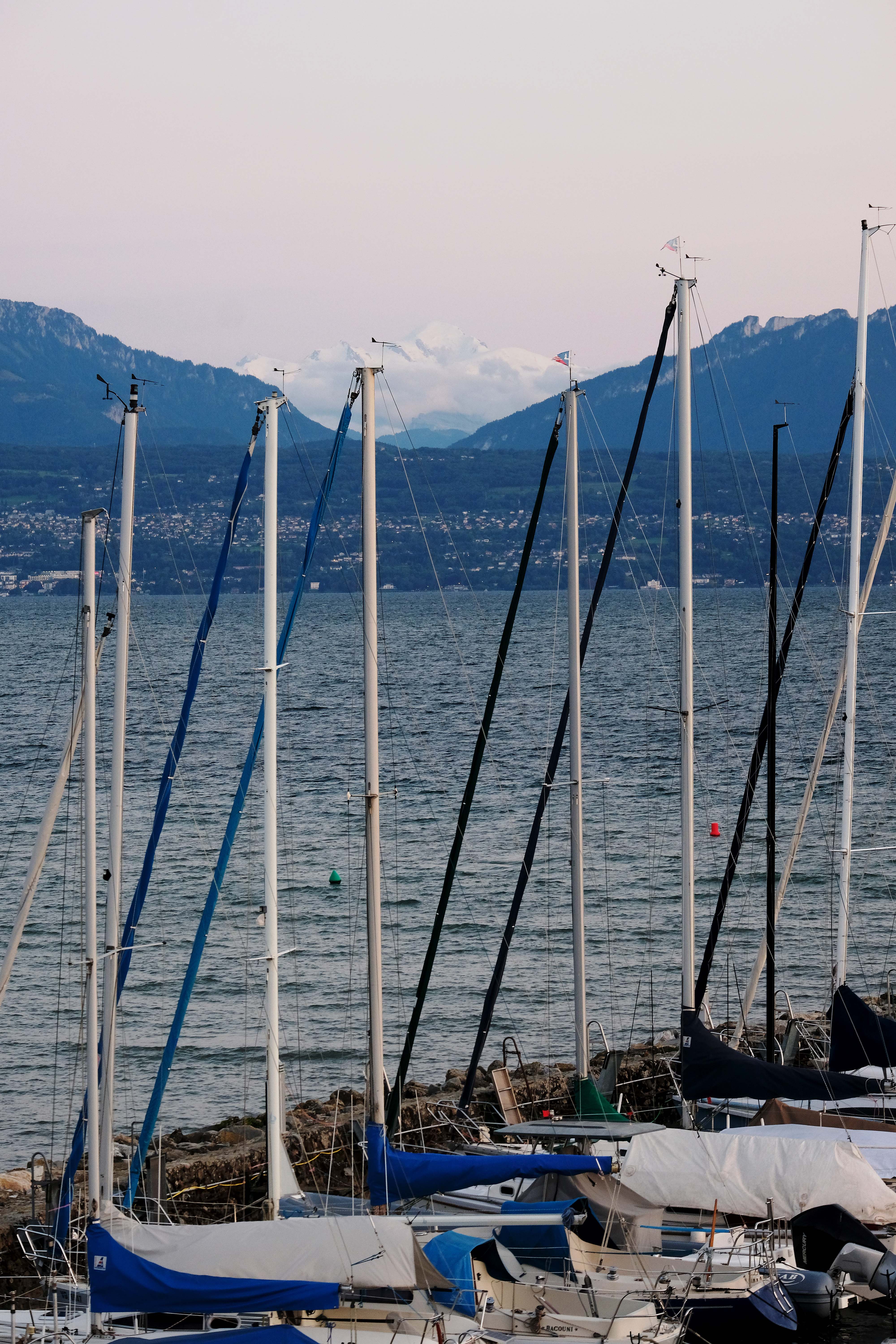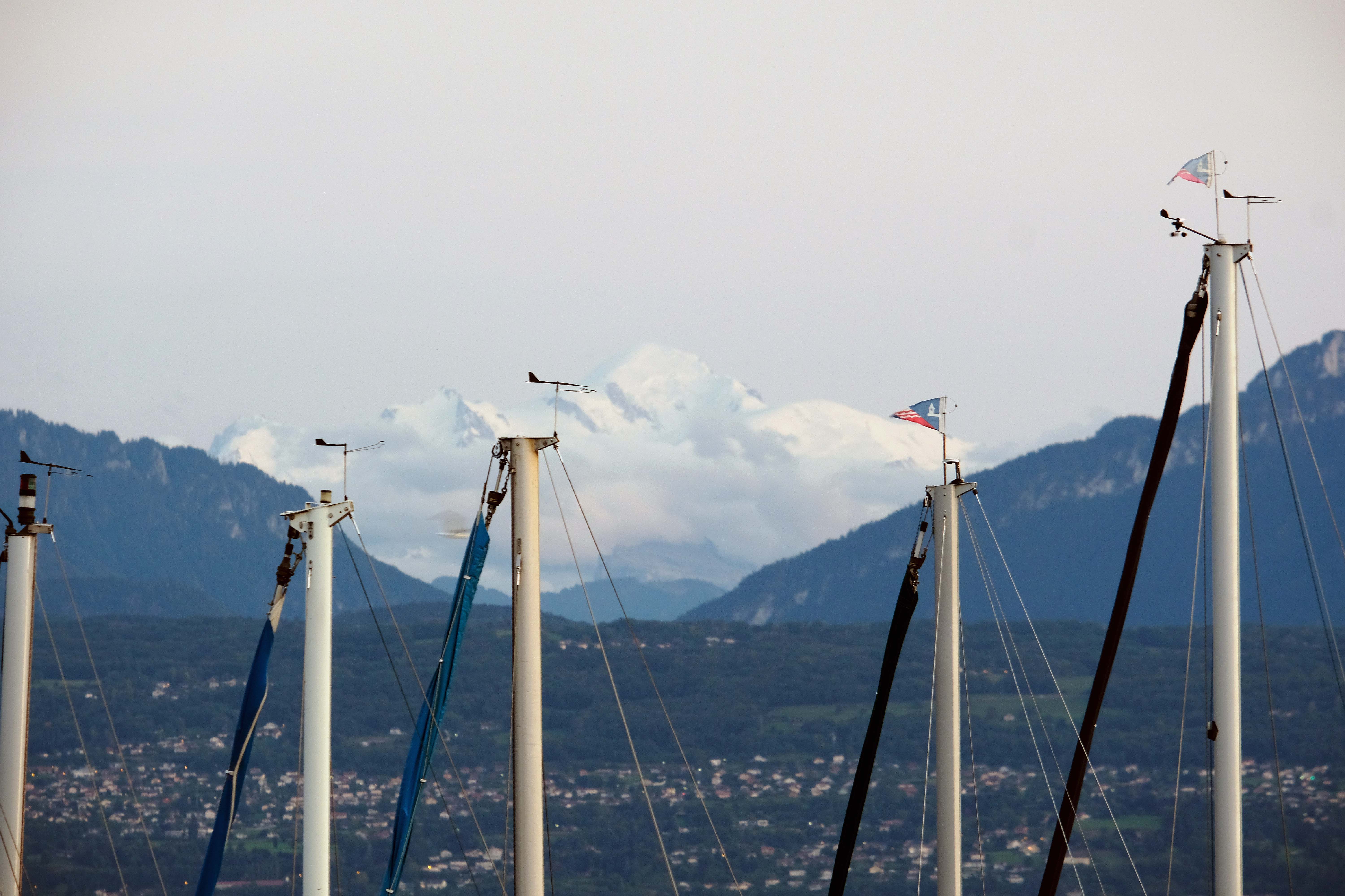 Unser Hotel Mont-Blanc au Lac liegt sehr zentral direkt an der Promenade. Wir haben ein sehr schönes Zimmer mit einem kleinen Balkon zum See. Von unserem Zimmer haben wir eine phantastische Aussicht auf den See, den Sporthafen und die Savoyer Alpen. Bei guter Sicht soll man dem Mont-Blanc sehen können. Auf entsprechend klares Wetter warten wir noch, auch wenn wir uns bisher über das Wetter nicht im geringsten beschweren können.