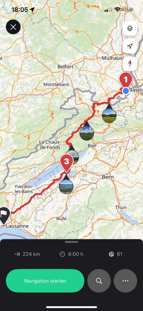 Und wieder ist regnerisches Wetter vorhergesagt. Da es am Nachmittag aber zeitweise aufklaren soll, starten wir erst etwas später. Unsere Tour führt uns durch das Berner Jura über Neuchâtel nach Morges. 224 km warten auf uns. Geplante Fahrzeit 4 Std. Die Kurvigkeit wird vom Routenplaner mit 62 bewertet – Bärbel freut sich schon.
