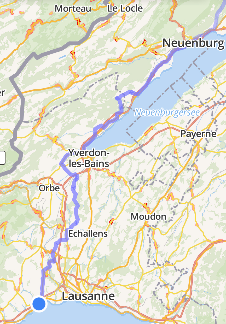 Danach geht es am Bieler See vorbei nach Neuchâtel. Insgesamt brauchen wir aber deutlich länger, als von der App berechnet. Motoradfahrer sind eben einfach erheblich schneller unterwegs als wir.