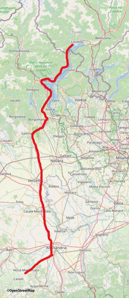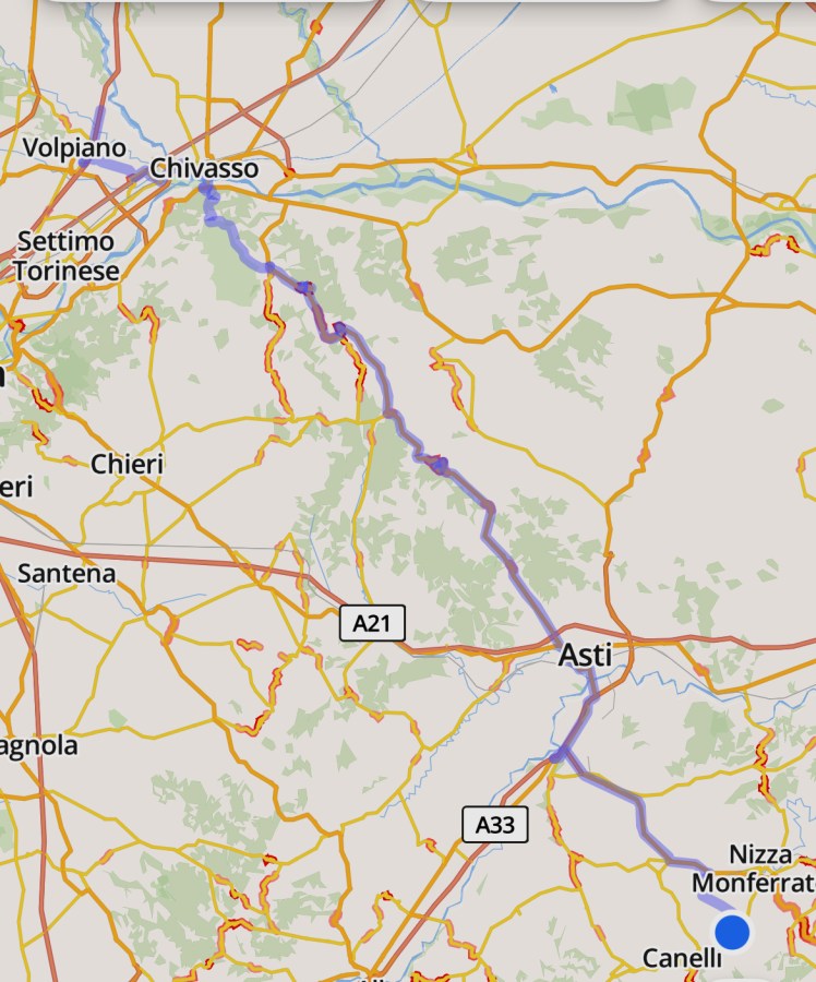 Die Zeit ist schon fortgeschritten und so kürzen wir die Weiterfahrt ein wenig ab. Unsere Calimoto-App hatte zwar wieder schöne kleine Straßen für uns ausgesucht, aber wir wollen ja auch einmal im Hotel in Calamandrana, in der Nähe von Canelli, ankommen. Wir wählen deshalb einen möglichst direkten Weg und sind ein wenig überrascht, dass selbst die offiziell größeren Straßen doch recht klein sind.