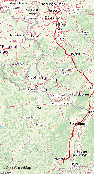 Wir wollen zunächst über die A61 bis Ludwigshafen und dann über die A65 zur A35 in Frankreich fahren. Über Straßburg geht es dann durch’s Elsass über Colmar nach Mülhausen und von dort nach Hegenheim.