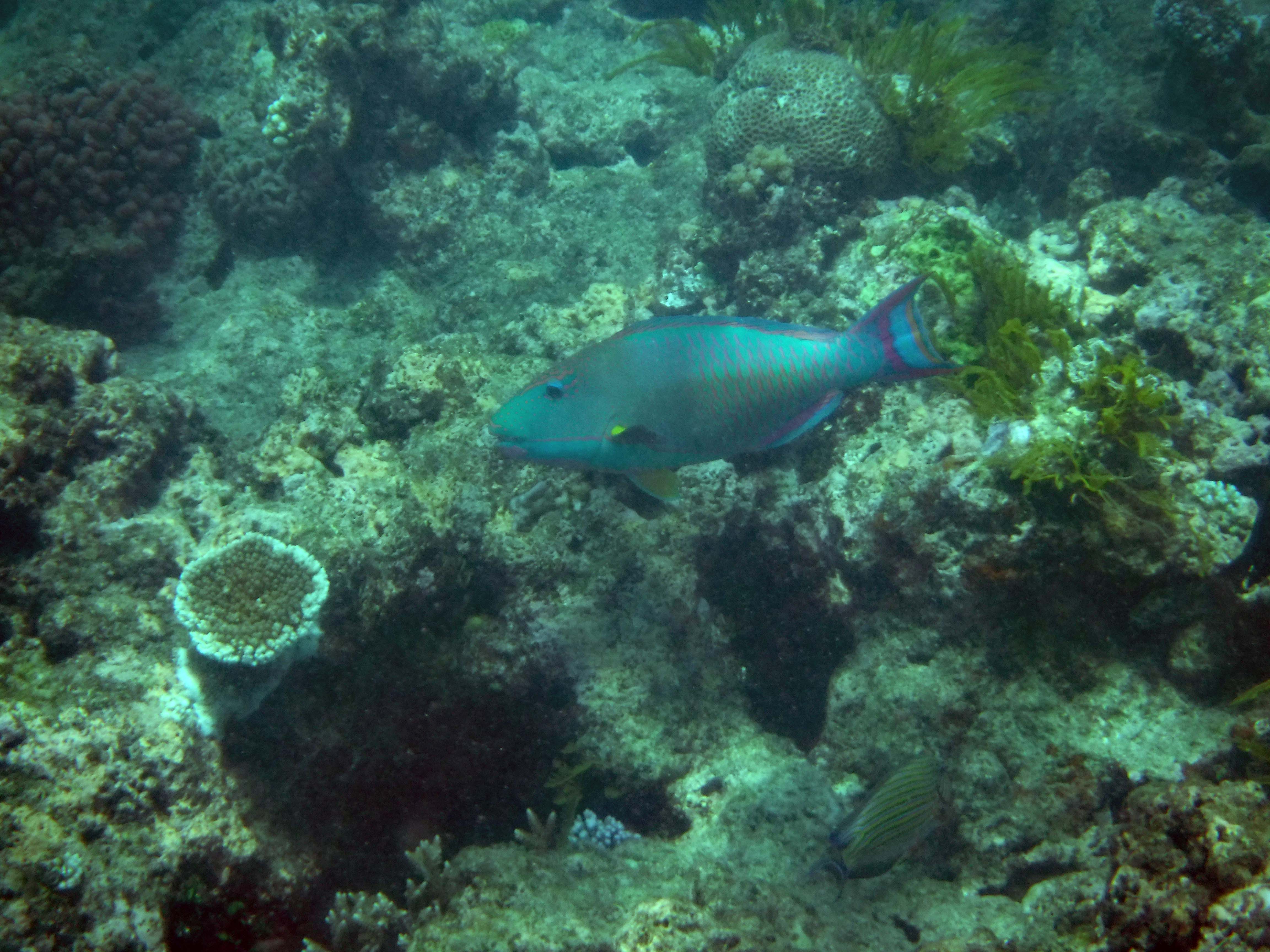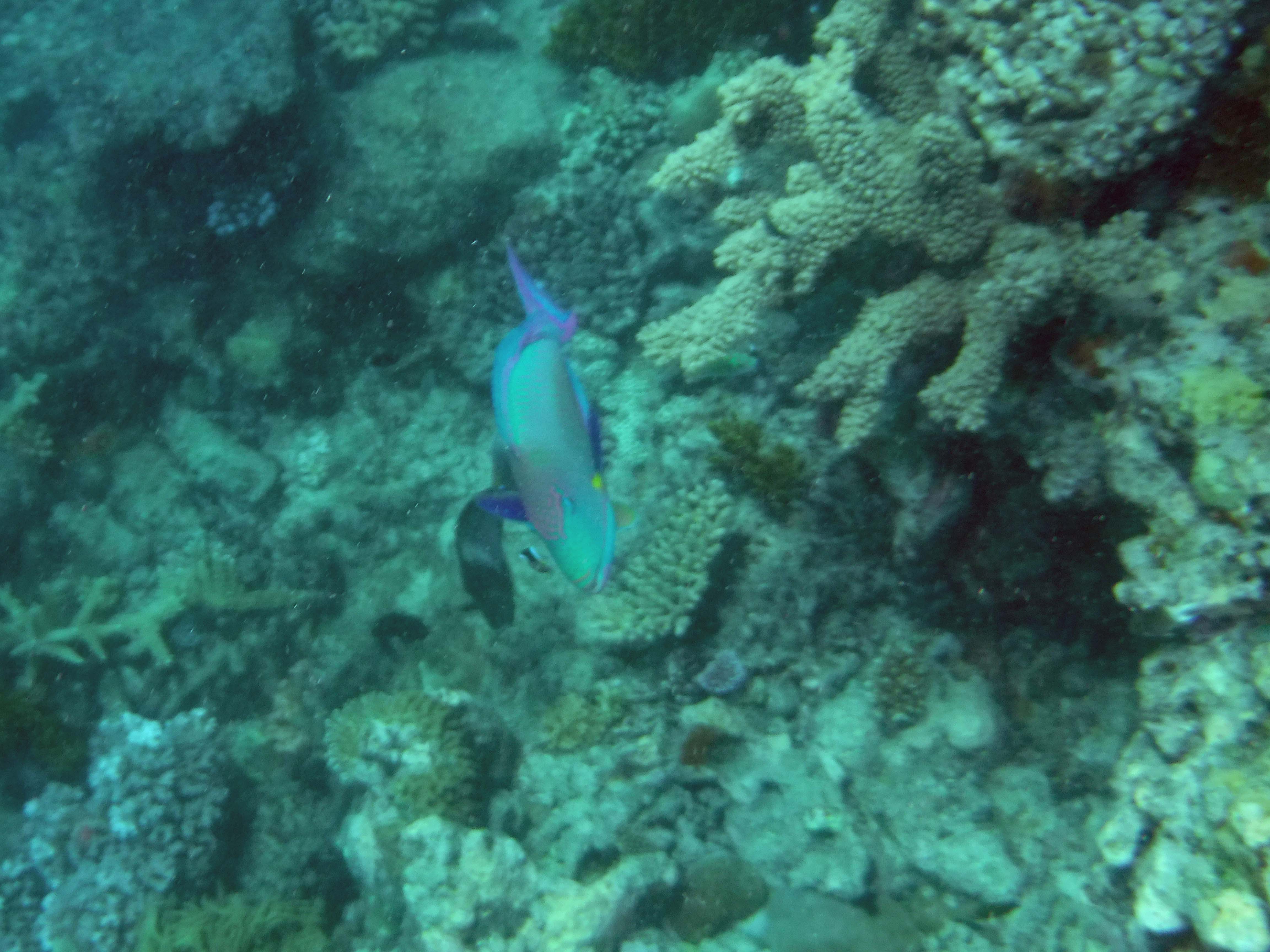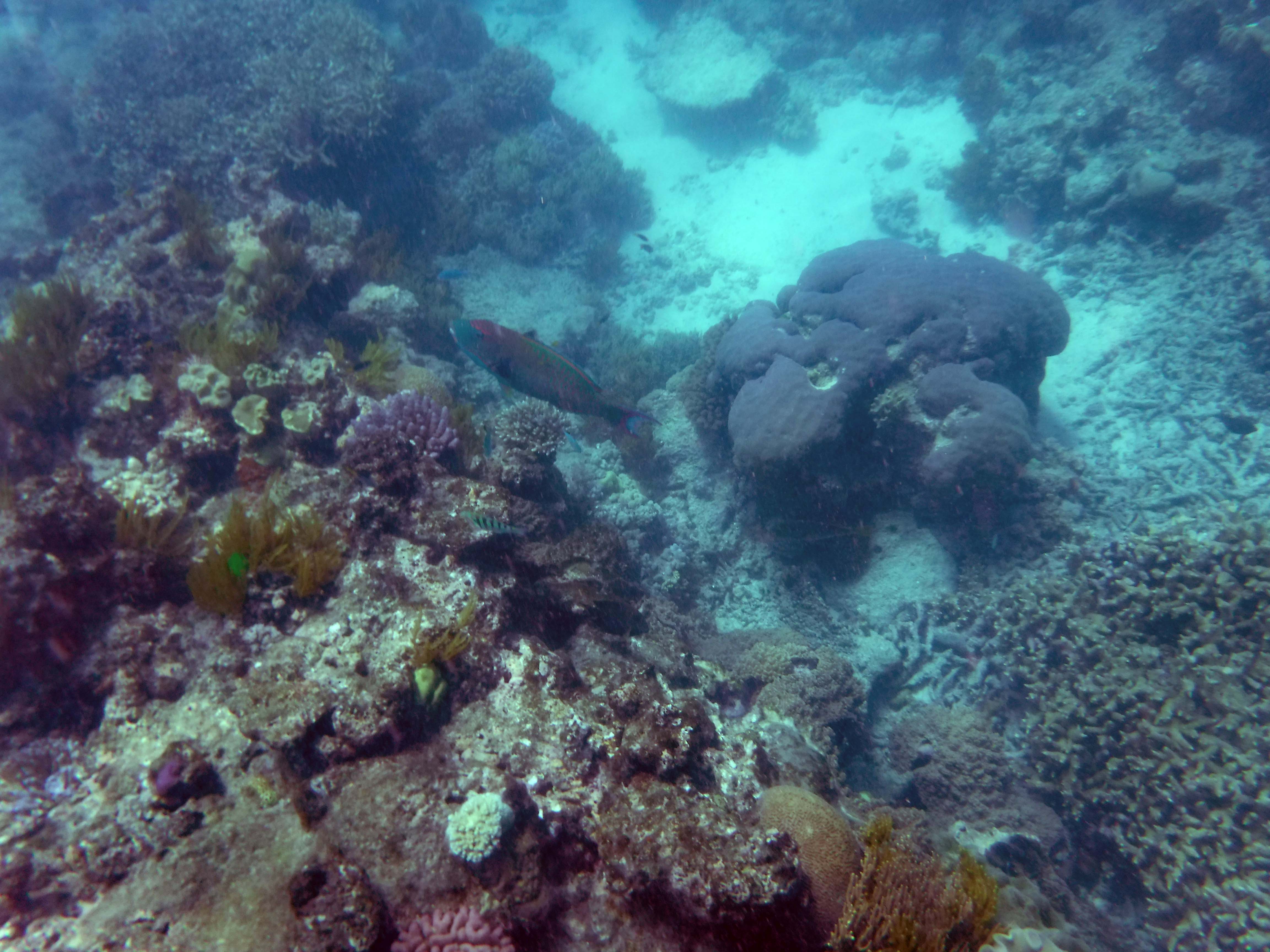 Nur 100m weiter erwartet uns eine fantastische, sehr farbenprächtige Korallenlandschaft, die schönste, die ich bisher gesehen habe. Leider ist das Wasser durch den starken Wellengang nicht so klar wie erhofft.