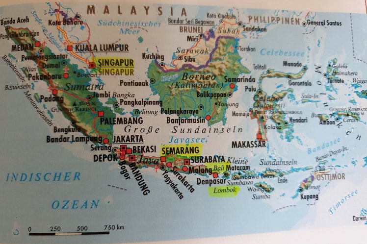 Indonesien bildet beiderseits des Äquators eine Inselbrücke zwischen dem südostasiatischen Festland und Australien mit einer enormen Ausdehnung von ca. 2000 km Nord-Süd und ca. 5000 km West-Ost. Die größten Inseln sind Borneo im Osten – geteilt mit Malaysia – und die großen Sundainseln Sumatra, Java mit der Hauptstadt Jakarta sowie die spinnenförmige Insel Sulawesi (vormals Celebes) und in Richtung Australien Papua (geteilt mit Papua Neuguinea). Der Inselarchipel wird dann Richtung Australien folgend durch die kleinen Sundainseln ergänzt, von denen wir Bali, Lombok und Komodo sehen werden. Die Inselkette endet mit dem ebenfalls geteilten Timor.