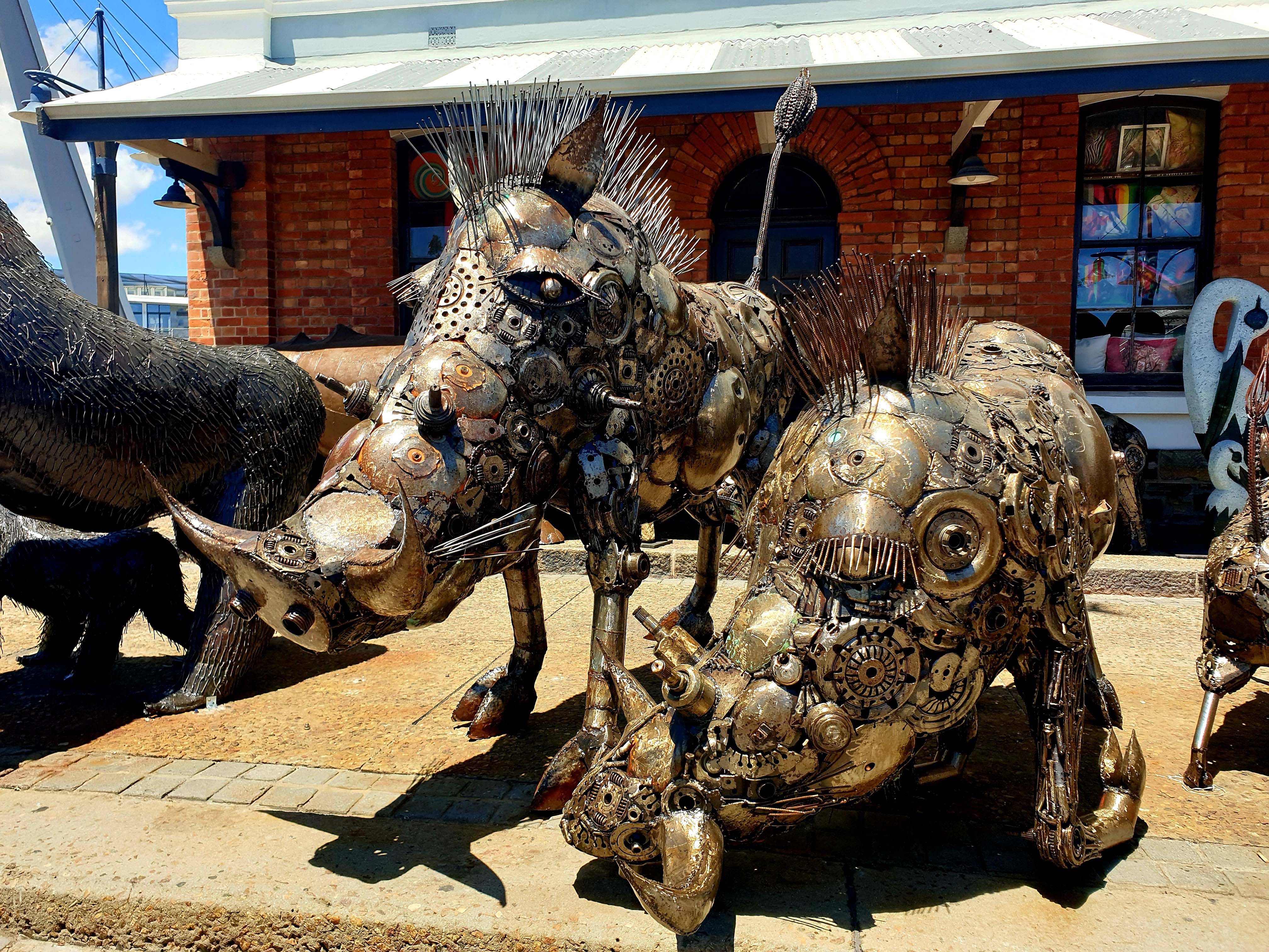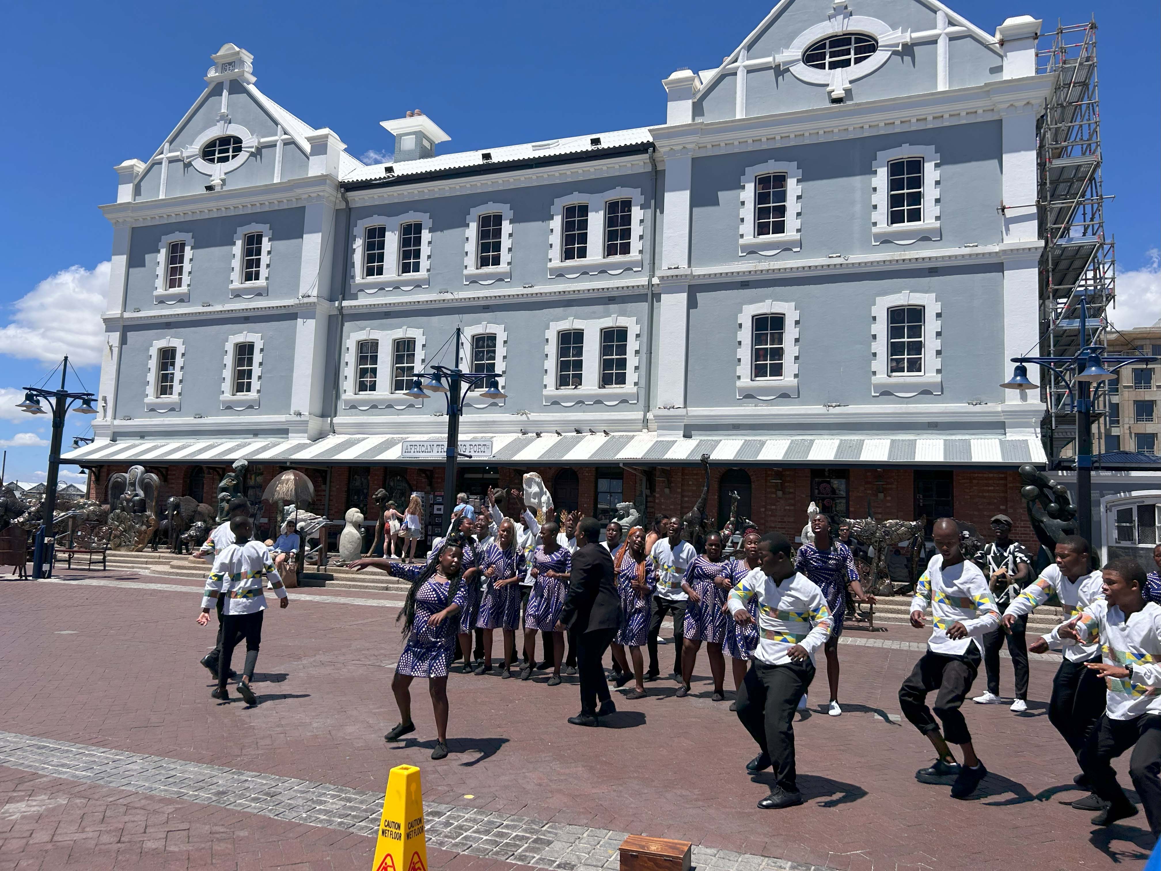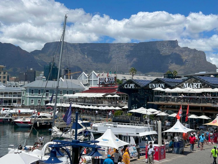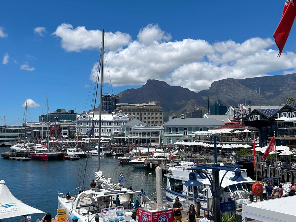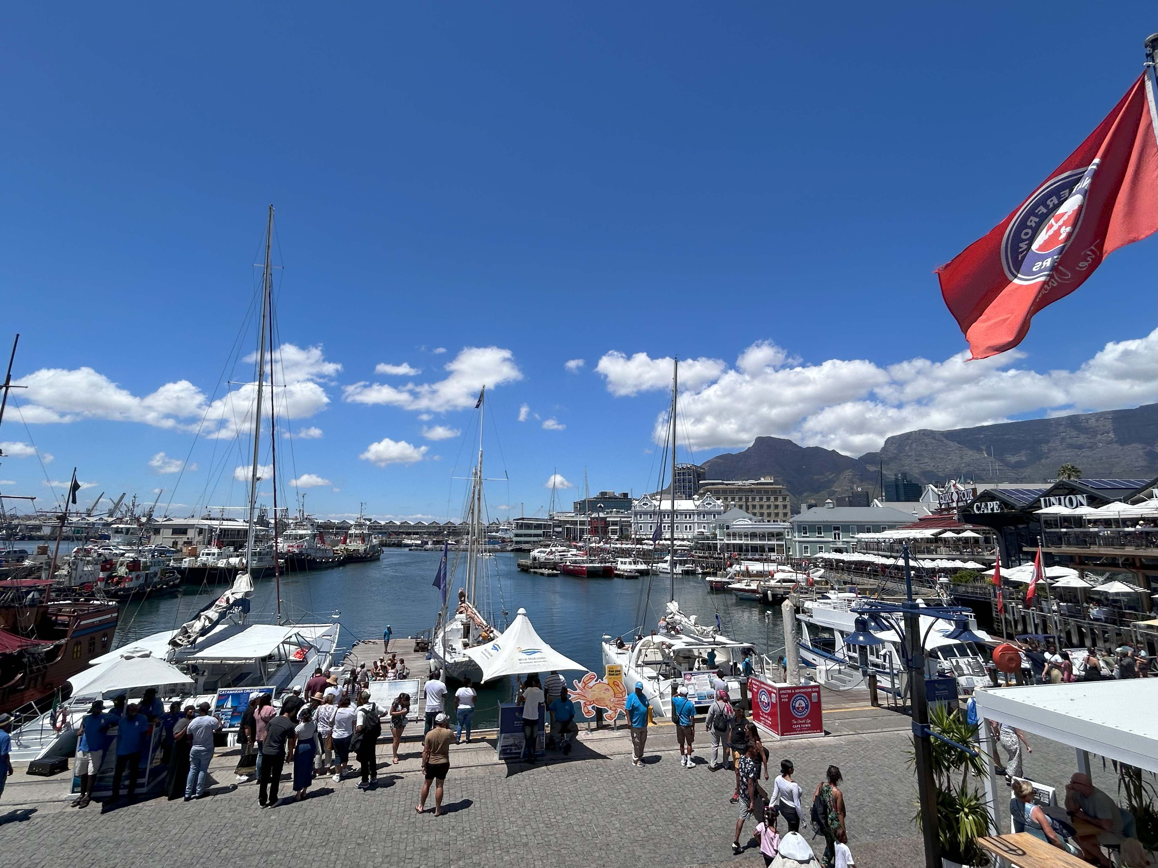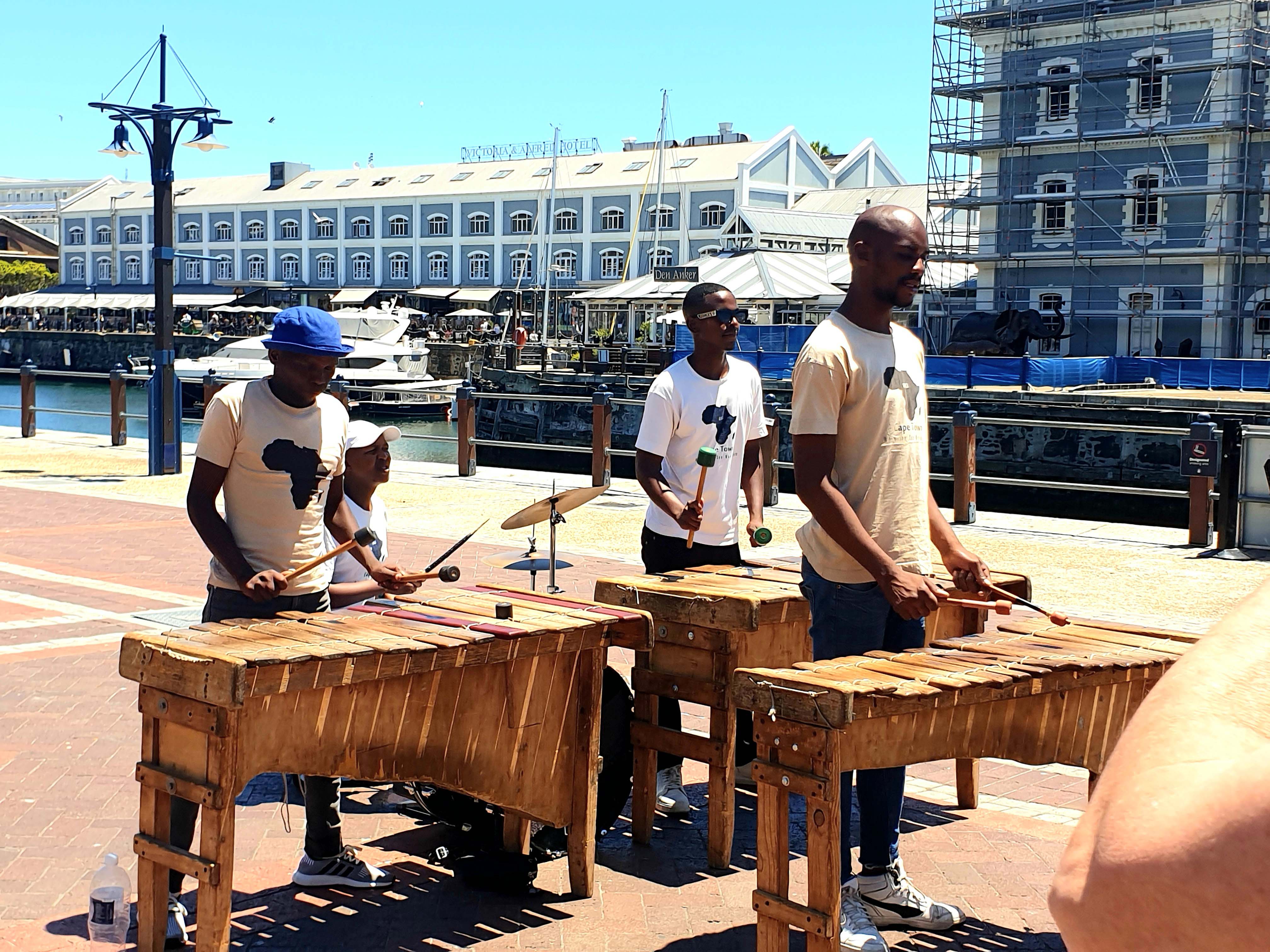 Wir ziehen ein paar Meter weiter weiter zur Waterfront. Das einst heruntergekommende Hafenviertel wurde aufwendig und vollständig renoviert und zeigt sich heute unter Victoria und Alfred Waterfront als elegantes Einkaufs- und Ausgehviertel. In Sichtweite befinden sich weiterhin der Containerhafen und die Trockendocks.