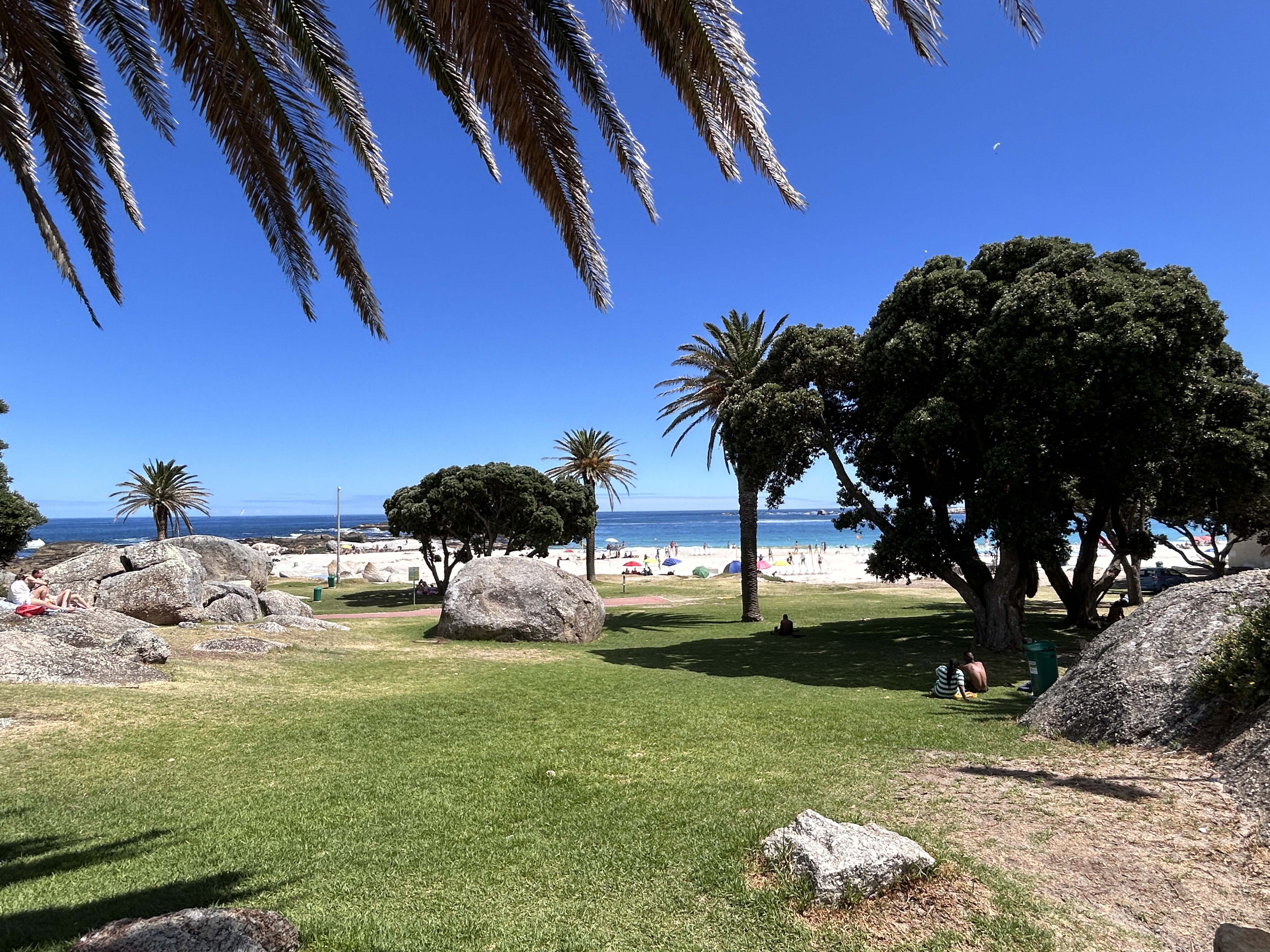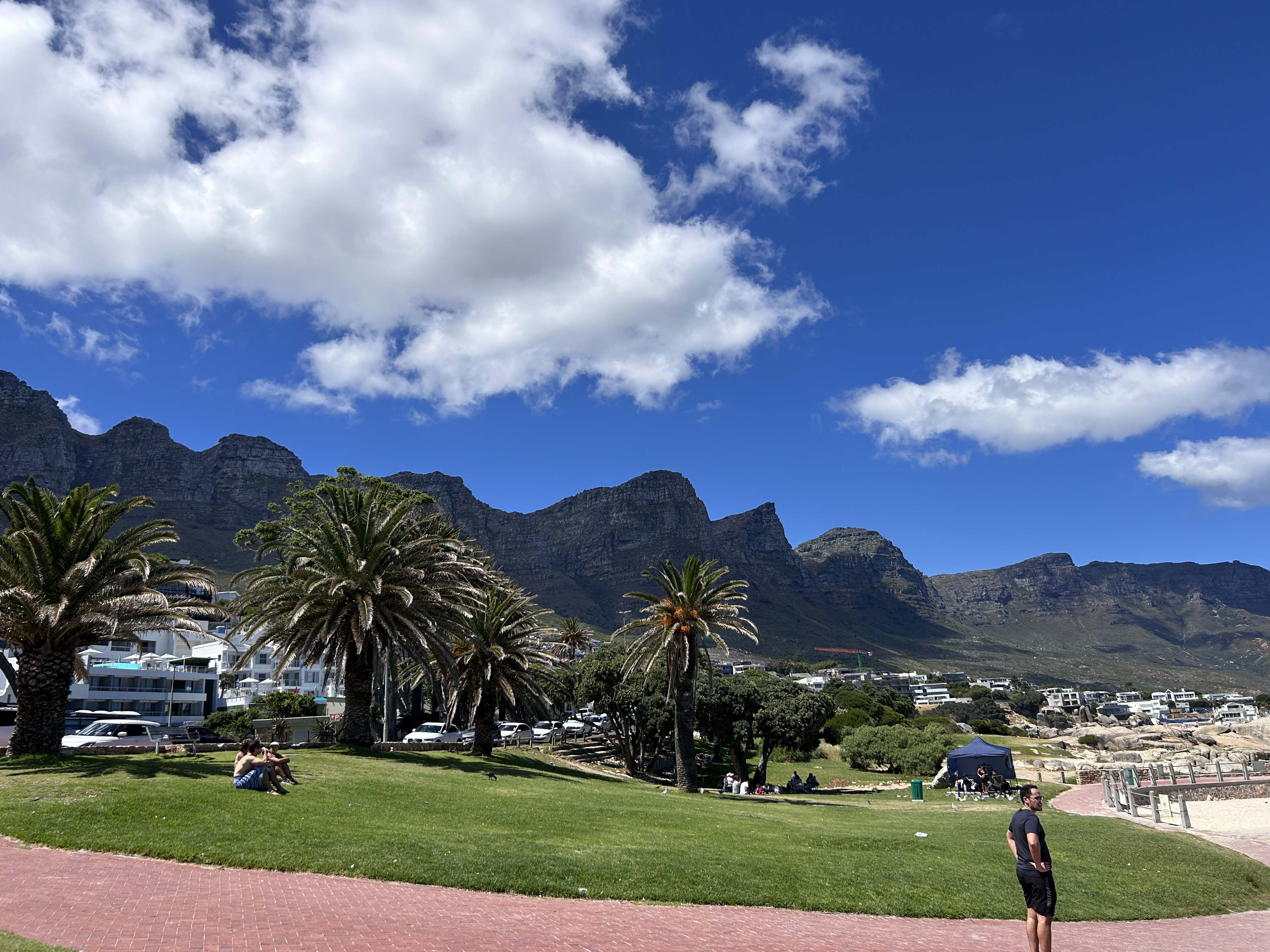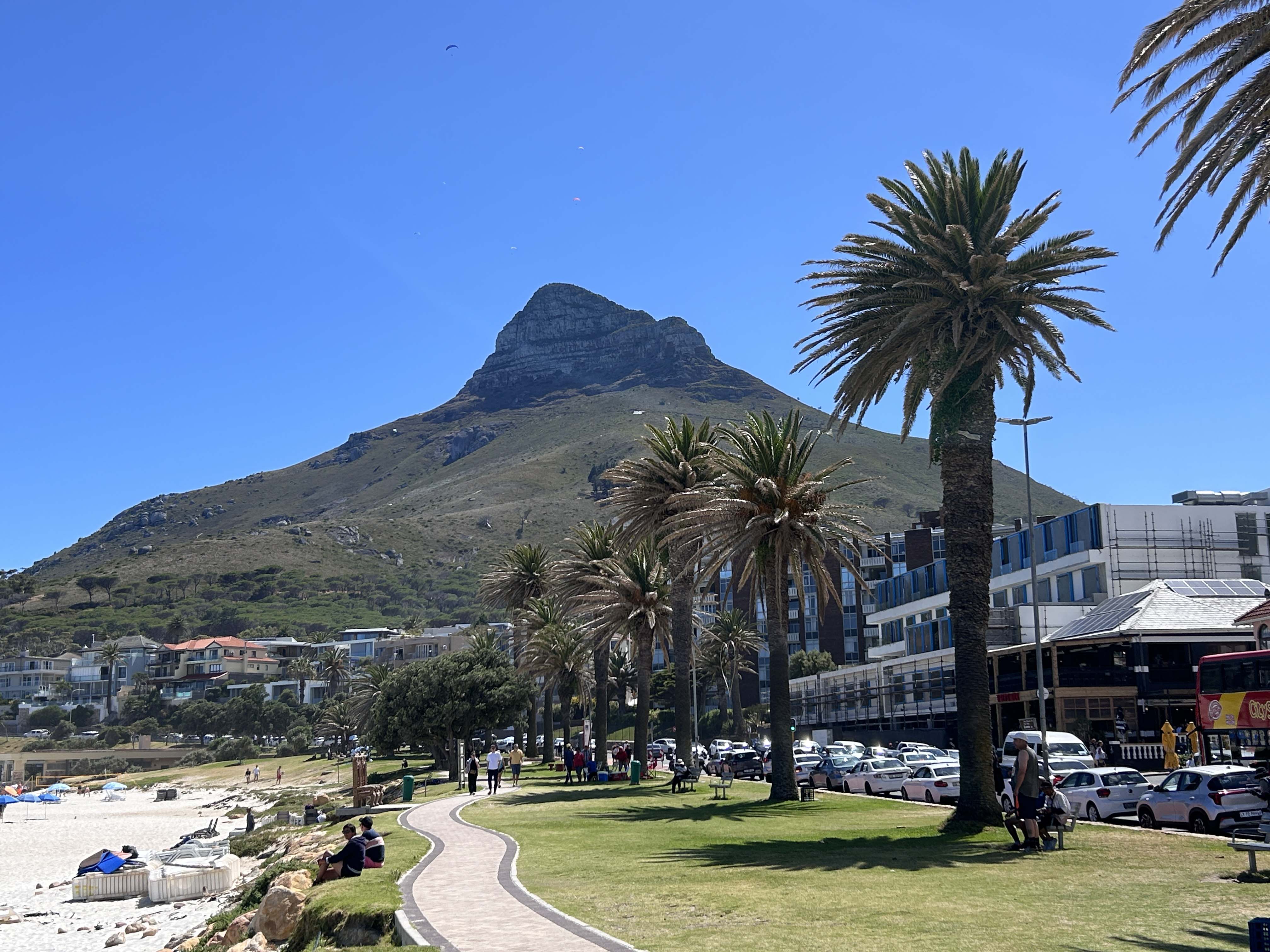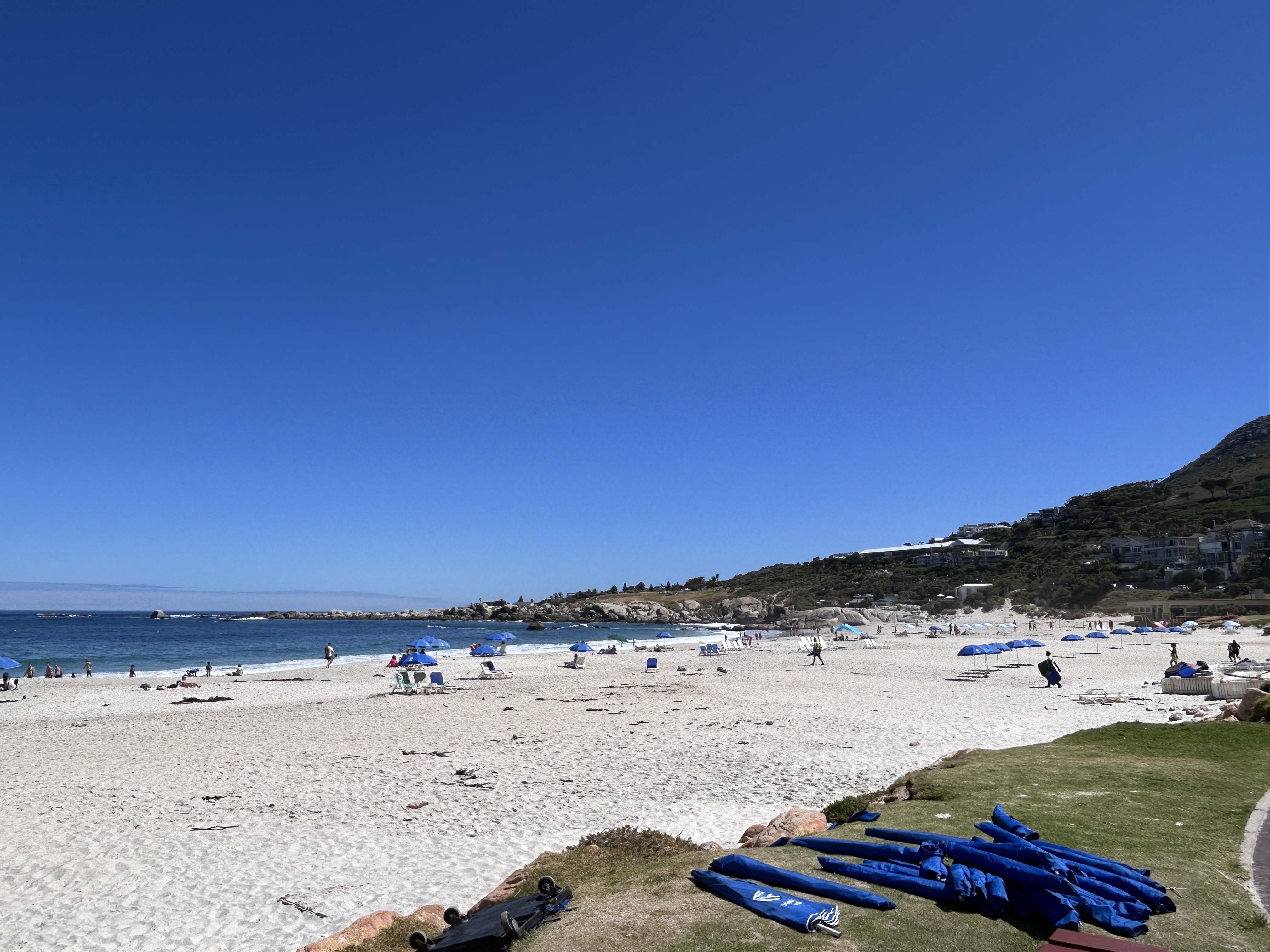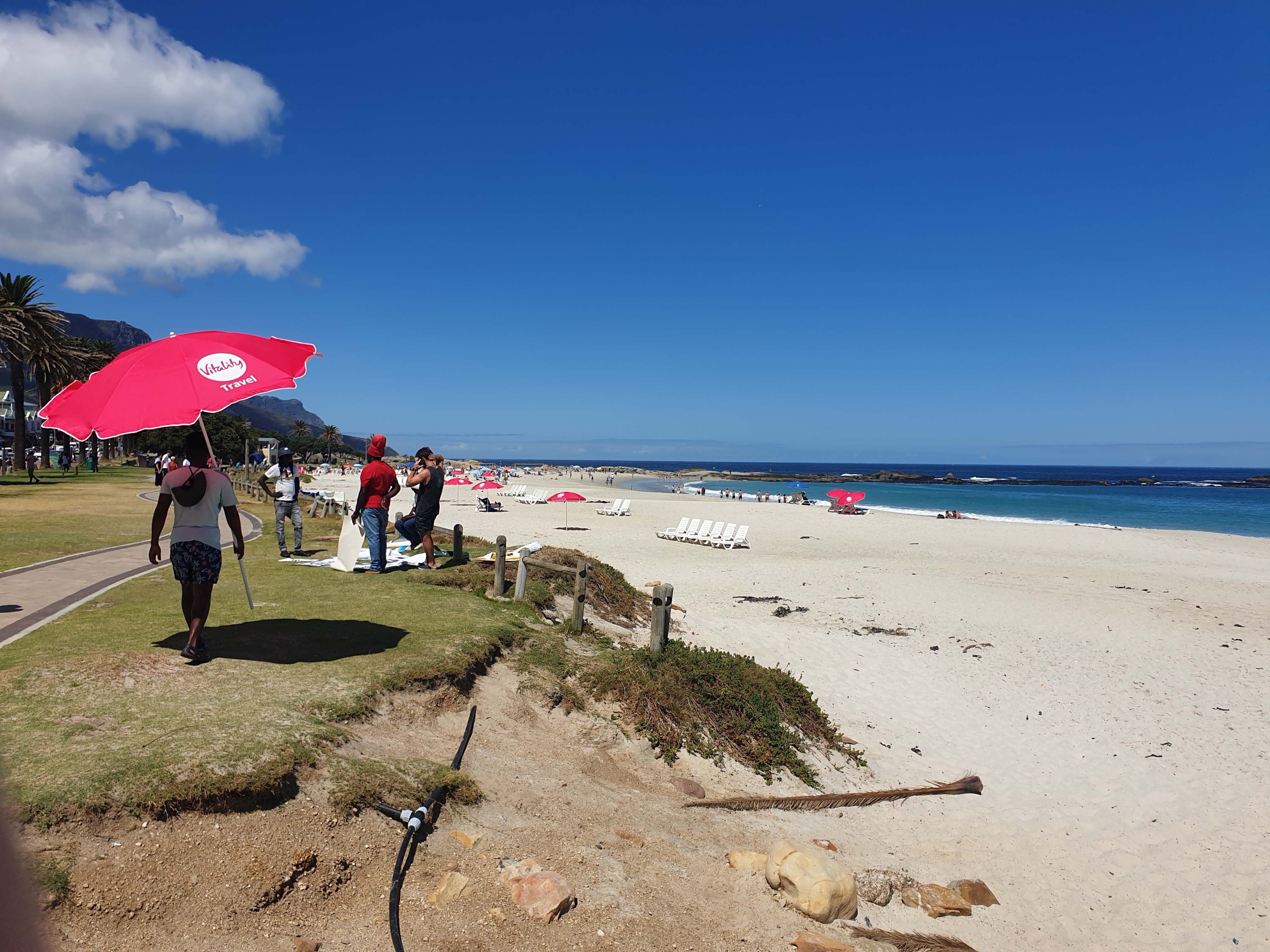 Unser erster Stop ist in Camps Bay, einem gehobener Vorort von Kapstadt. Er ist vor allem für den wunderschönen, weißen Sandstrand und den Ausblick auf die Bergkette Zwölf Apostel bekannt. Schöne Restaurants, gemütliche Cafés und Cocktailbars mit Terrasse bieten einen herrlichen Blick auf die Strandpromenade.
