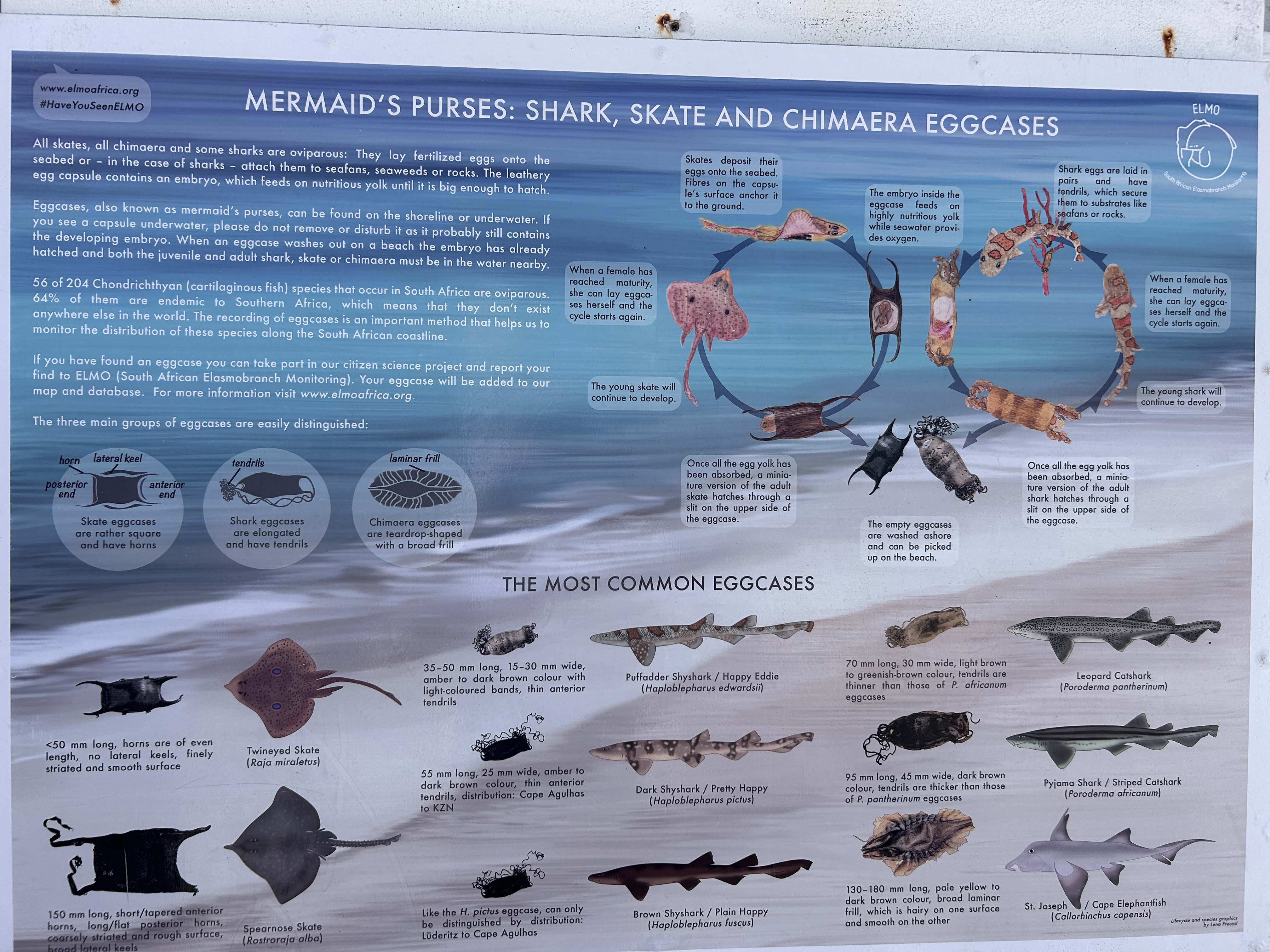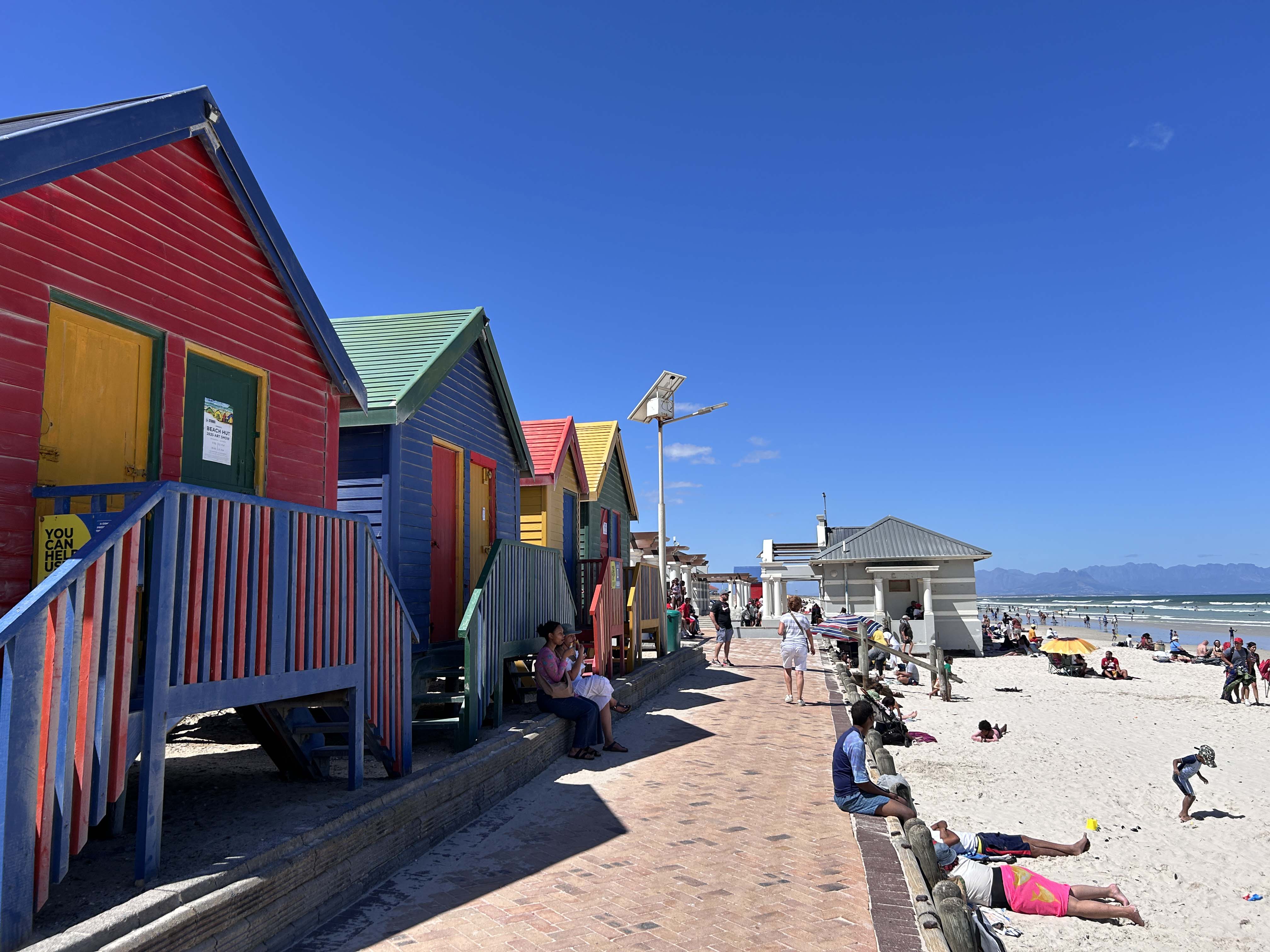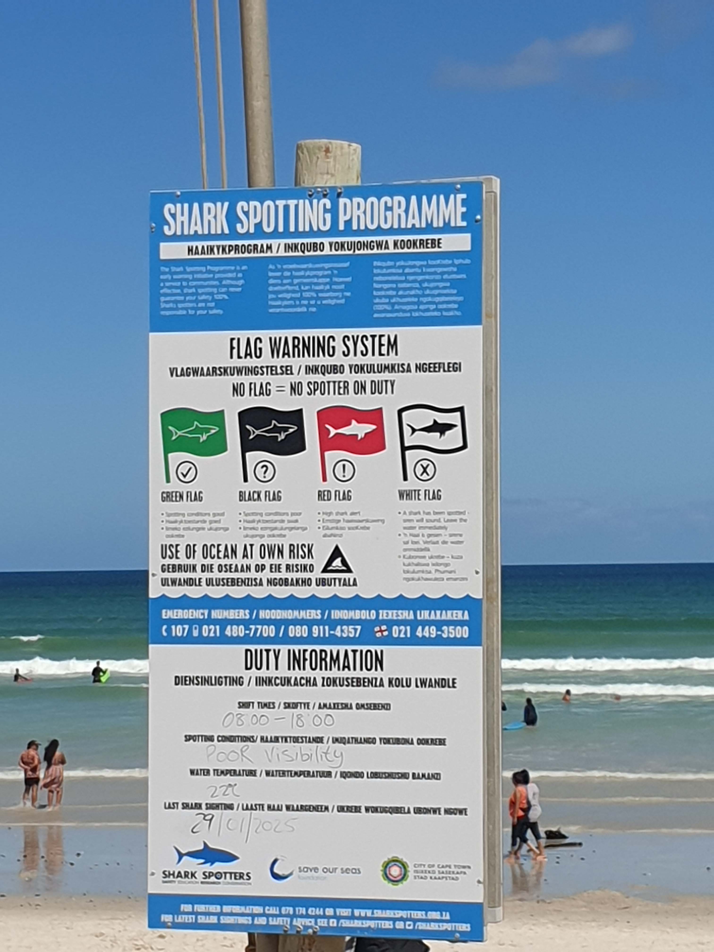 Unseren letzten Stop machen wir in Muizenberg, einem schönen Ort mit einem langen, weißen Sandstrand. Hier, auf der pazifischen Seite, wird deutlich mehr gebadet und gesurft. Deshalb gibt es hier auch viele Warntafeln.