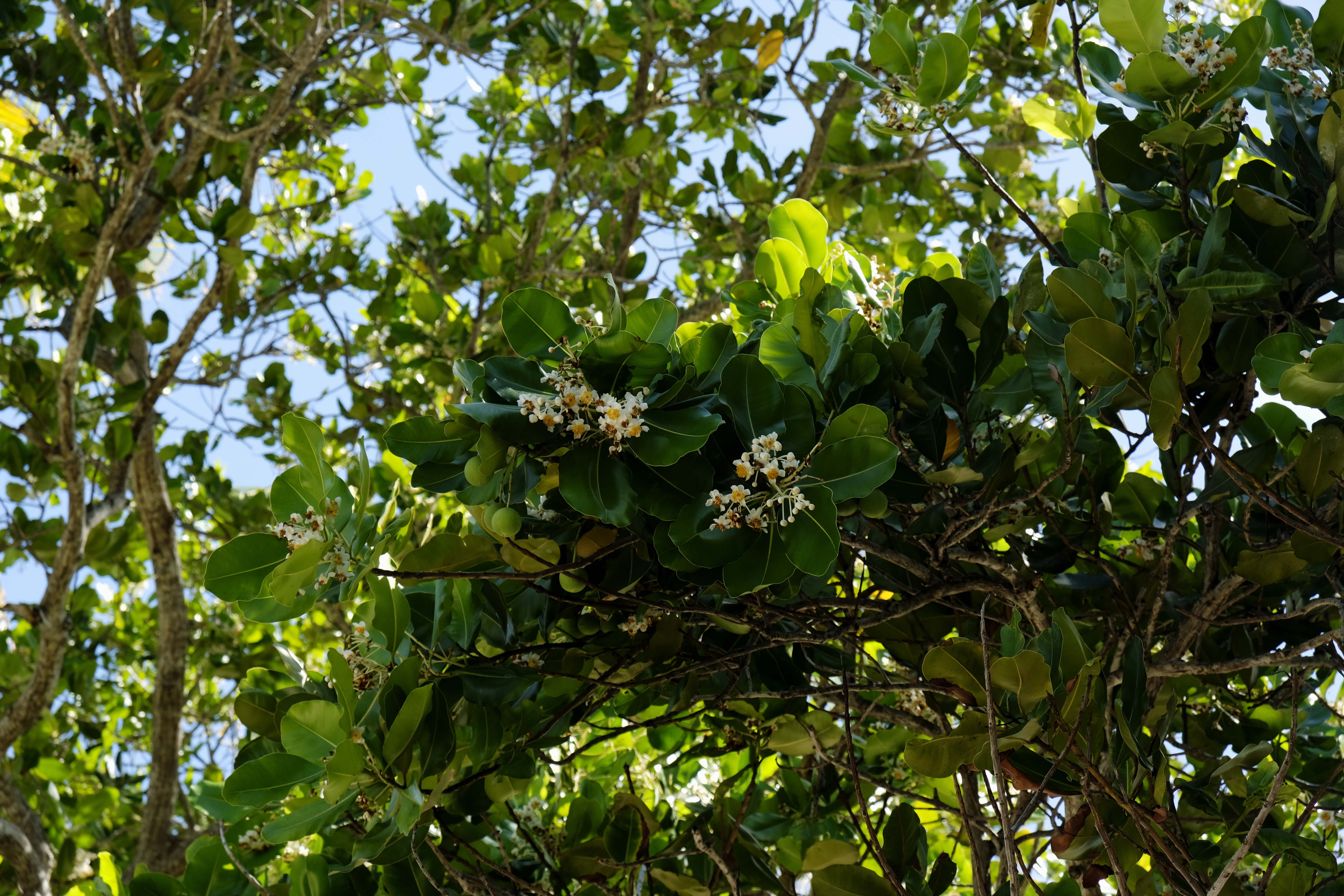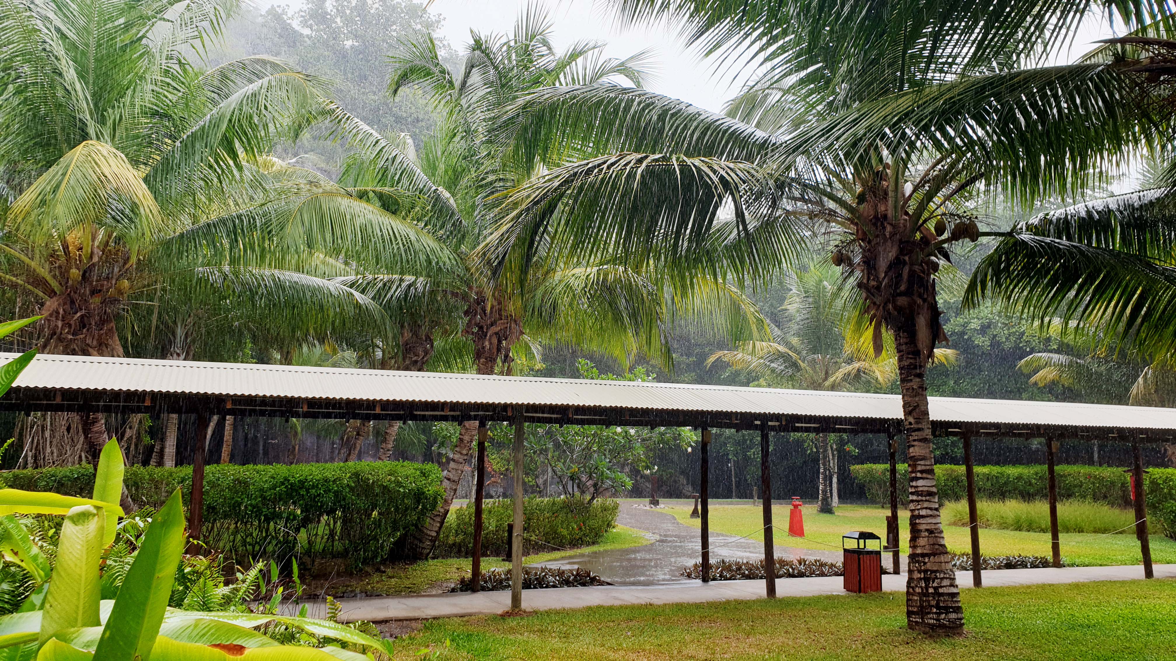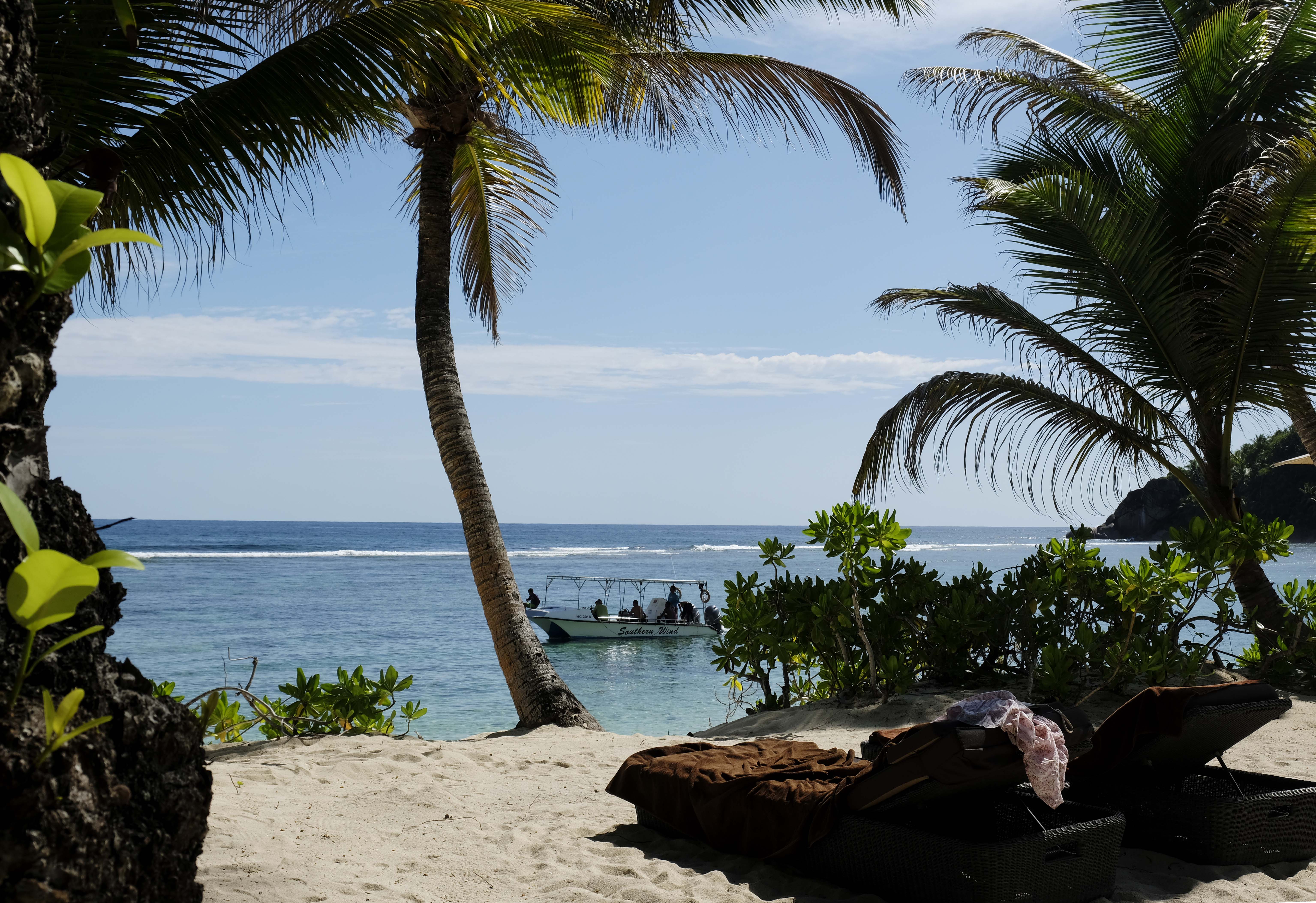 Nur wenige Meter trennen uns vom Strand. Palmen und Takamaka-Bäume sorgen für einen angenehmen, natürlichen Schatten. Der Blick auf das Meer ist grandios, auch wenn hier richtig schönes Baden durch das vorgelagerte Riff maximal bei Flut einigermaßen möglich ist.