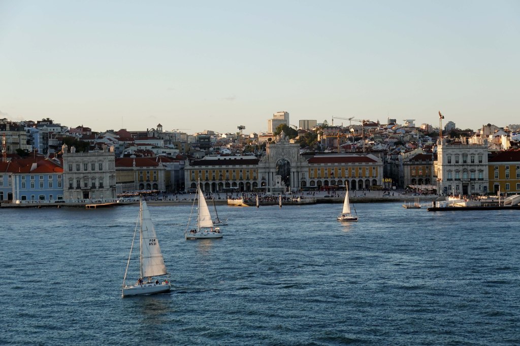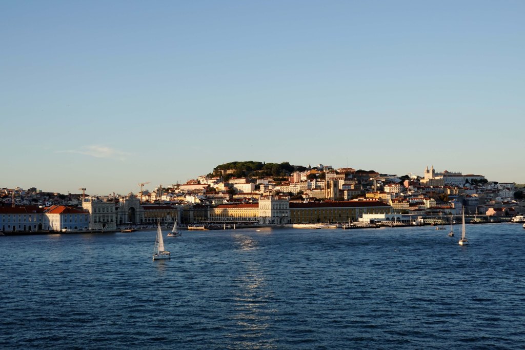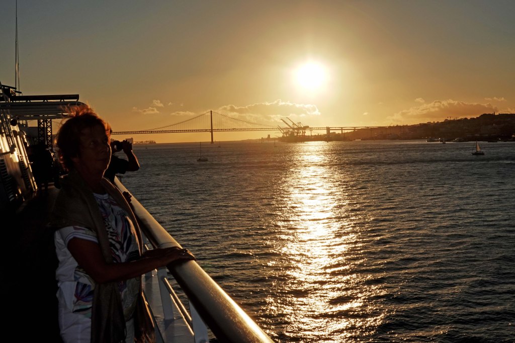Abends laufen wir aus und genießen noch einmal den Blick auf Lissabon bei Sonnenuntergang vom Rio Tejo aus.