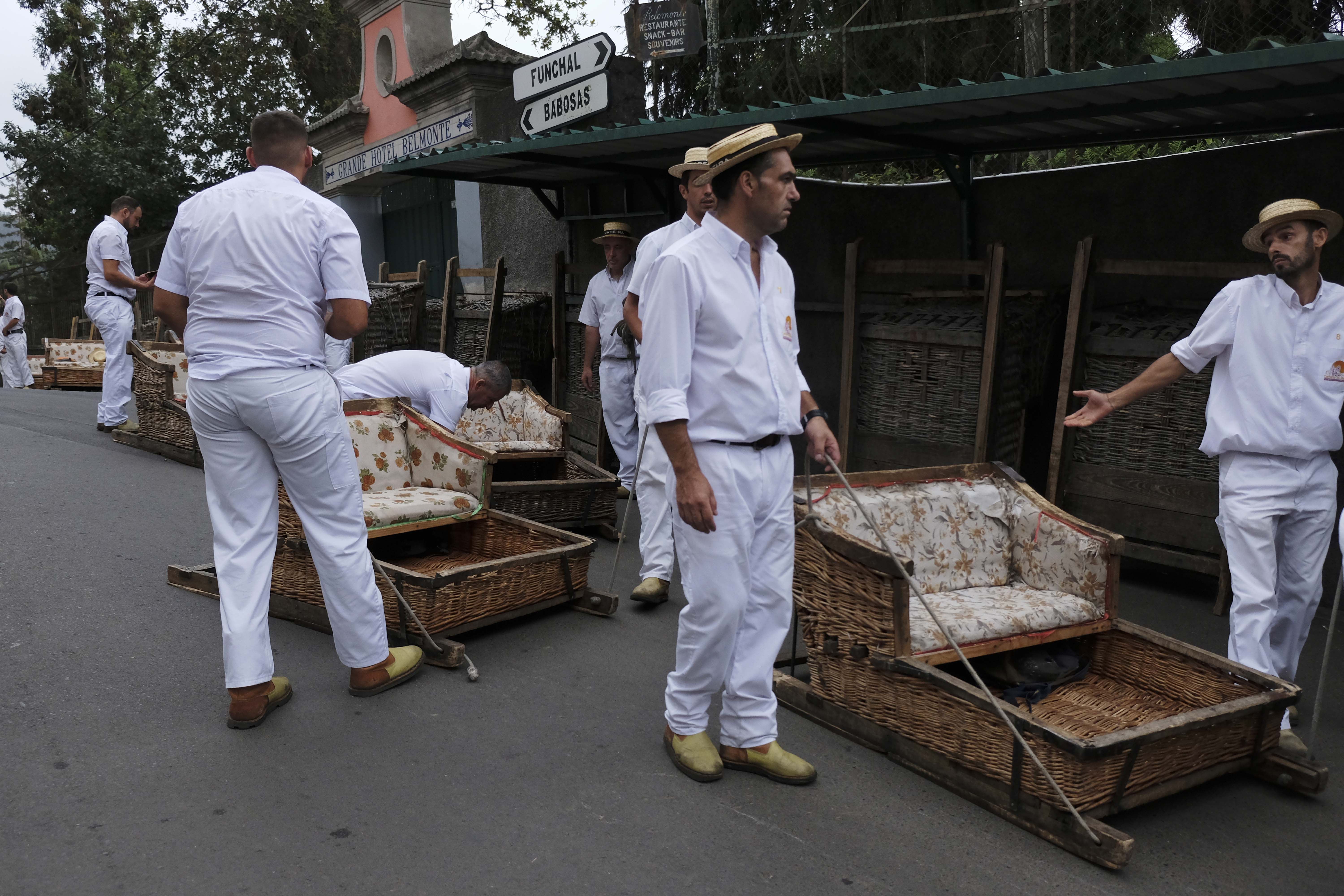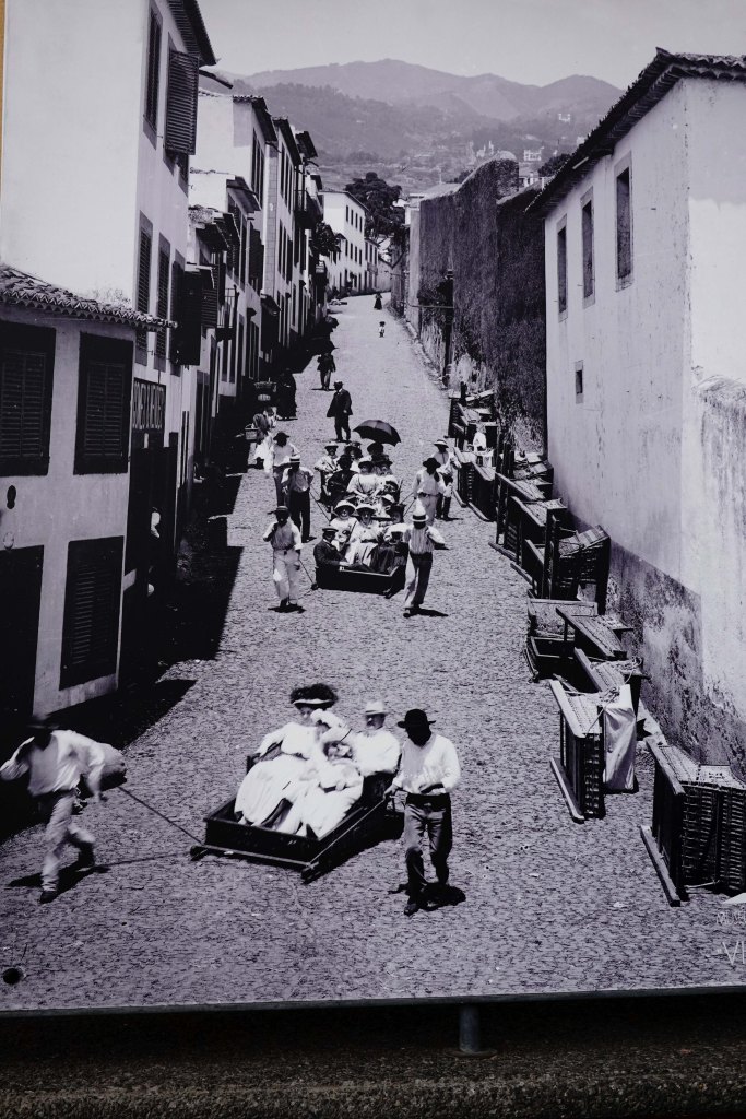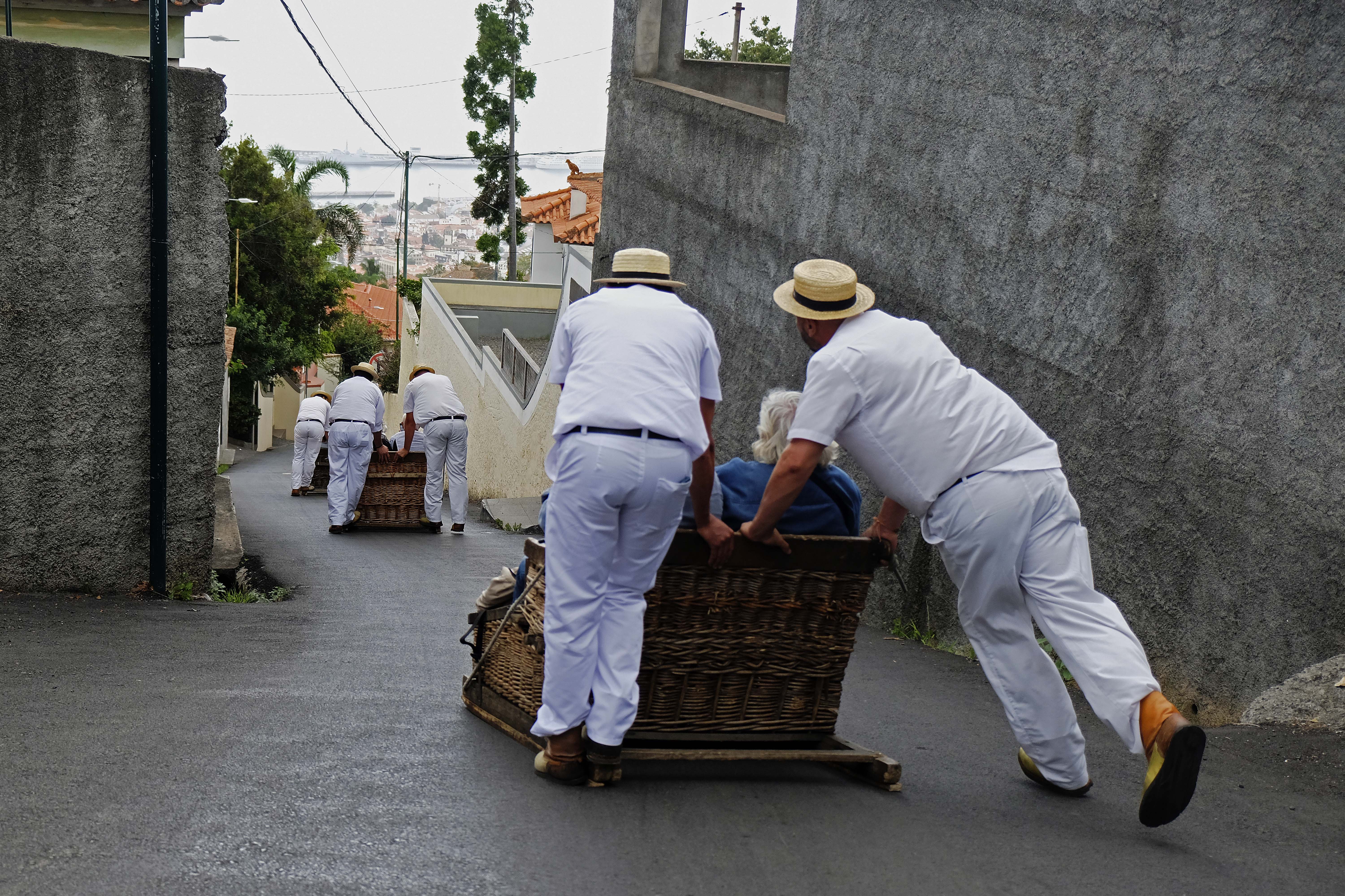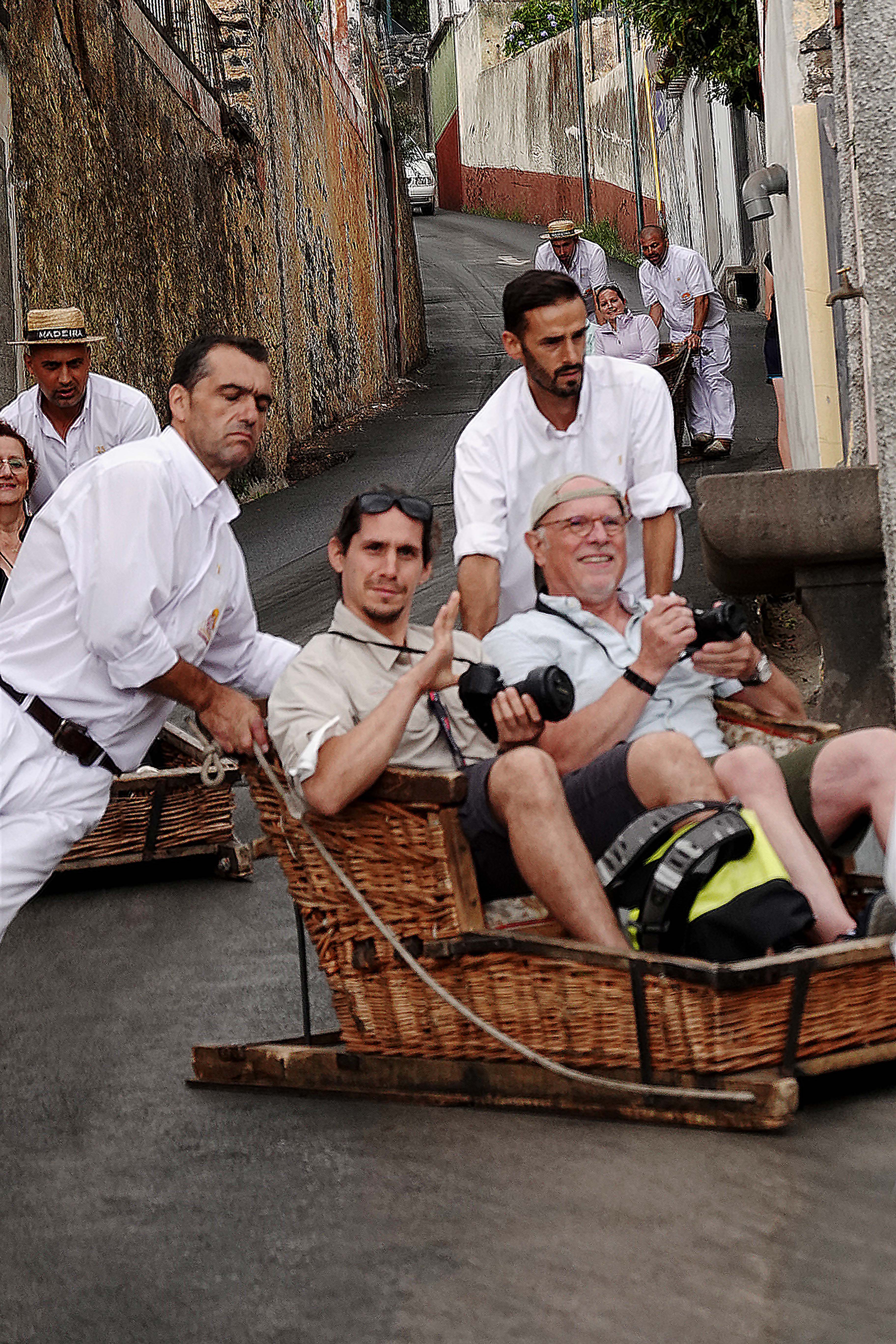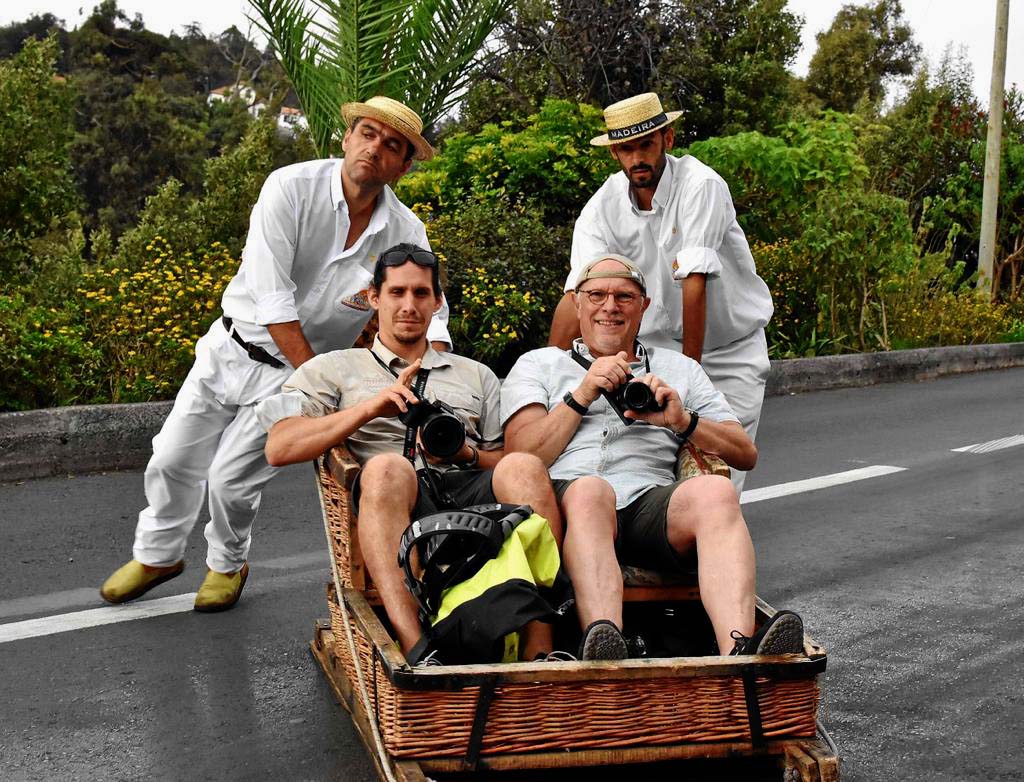 Für die Abfahrt wählt Rüdiger den Korbschlitten. Mit diesen Schlitten hat man früher Güter und Menschen transportiert, da Funchal steil an den Bergen liegt und viele Wege aus Treppen bestanden, die mit Lasttieren nicht bewältigt werden konnten. Die Abfahrt ist 2 km lang und gilt als eine der 7 aufregensten Fahrten der Welt. Für die Strecke braucht man ca. 10 Minuten. Bärbel brauchte mit dem Bus die doppelte Zeit.