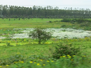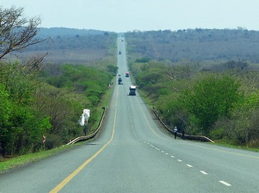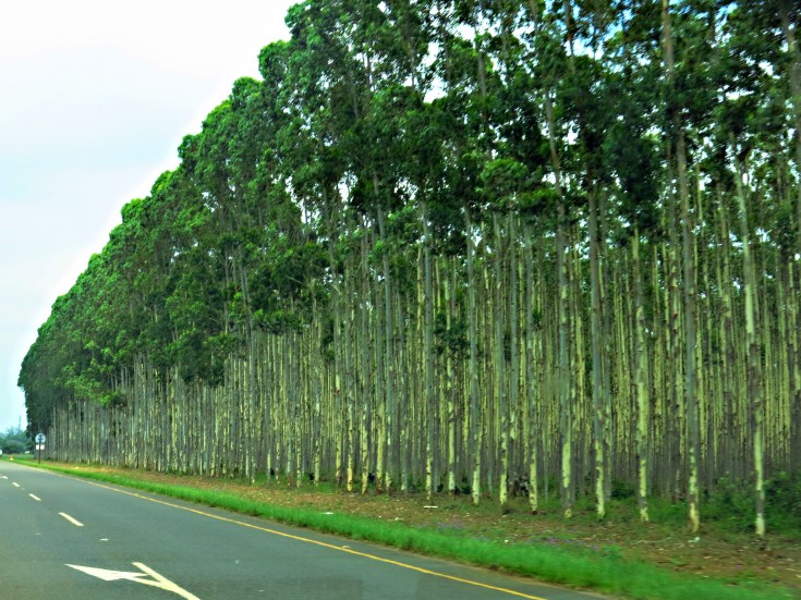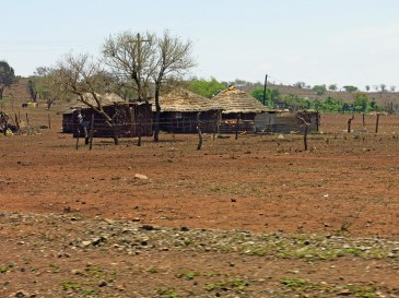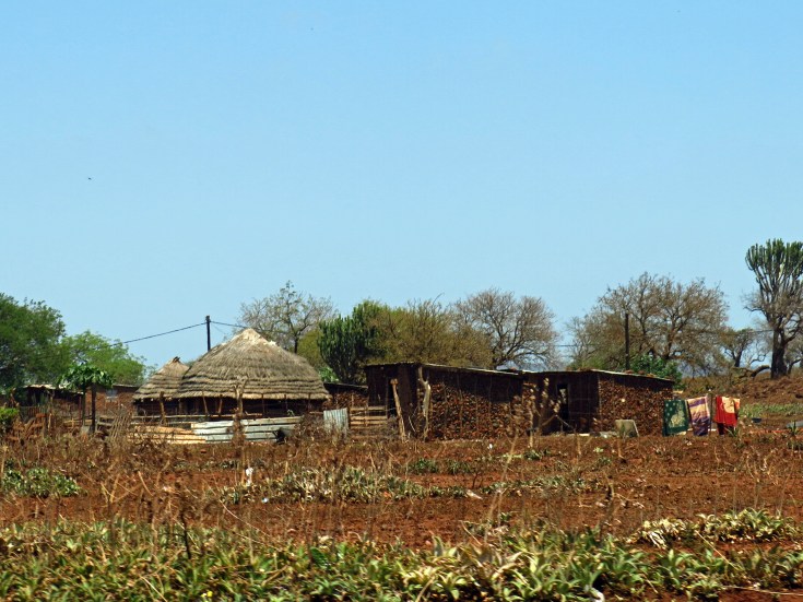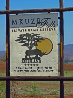 Die Fahrt zur Mkuze Falls Game Lodge führt uns mitten durchs Zululand. Zunächst durchqueren wir Zuckerrohrfelder und riesige Plantagen mit Holzanbau. Anschließend geht es weiter über die N2 bis keine Wolke mehr am Himmel steht und es so richtig heiß ist. Um ca. 20 Kilometer zu sparen fahren wir bereits vor Pongola von der N2 ab und nehmen eine Abkürzung auf unbefestigter Straße quer durch das Buschland. Jetzt sind wir alleine auf der Straße und hoffen, dass unser Auto durchhält – denn geländegängig ist es ja nicht unbedingt. Nach spannenden 30 km erreichen wir unbeschadet wieder eine geteerte Straße und kurz darauf das Gate zu unserer neuen Lodge.