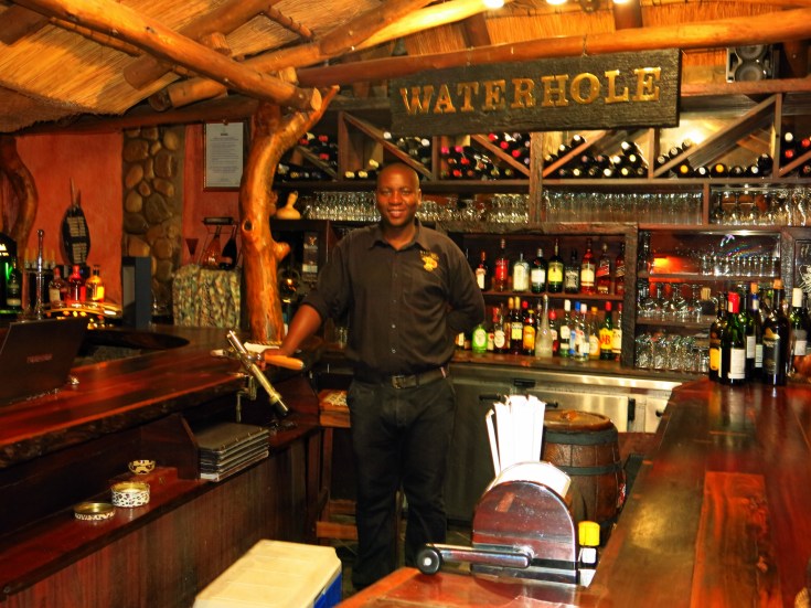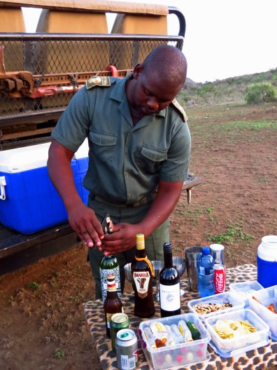 Lunch-time ist wieder auf der Aussichtsterrasse und nach einem kurzen Mittagsschlaf wartet High-Tee in der Lounge auf uns. Danach geht es direkt zum Afternoon-Drive. Nach vielen Fotostopps mit Erklärungen, Flussdurchquerungen, Berg- und Talfahrten erreichen wir spätestens nach zwei Stunden einen Aussichtspunkt. Hier genießen wir unter Geparden-Beobachtung den Sonnenuntergang mit Gin-Tonic, Wein oder Bier sowie Biltong und Chips. Jetzt geht es aber mit Tempo zurück, denn wir werden bereits vor Lodge mit Sherry oder Portwein empfangen. Nach einem kurzen Refresh geht es zu Thulani in die Waterhole-Bar, wo bereits zwei frisch gezapfte kühles Pils (Castle) auf uns warten.