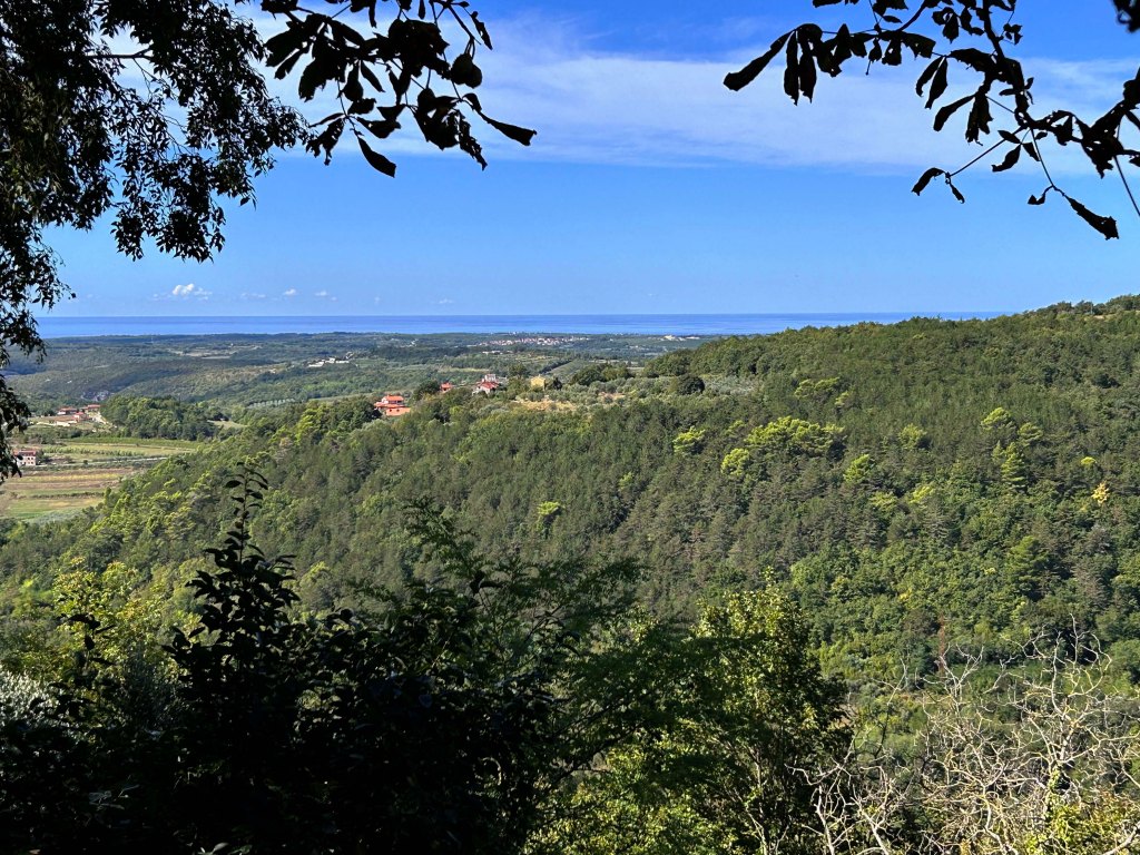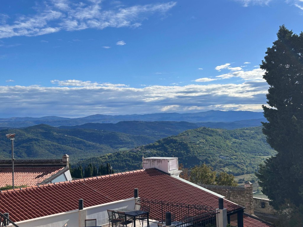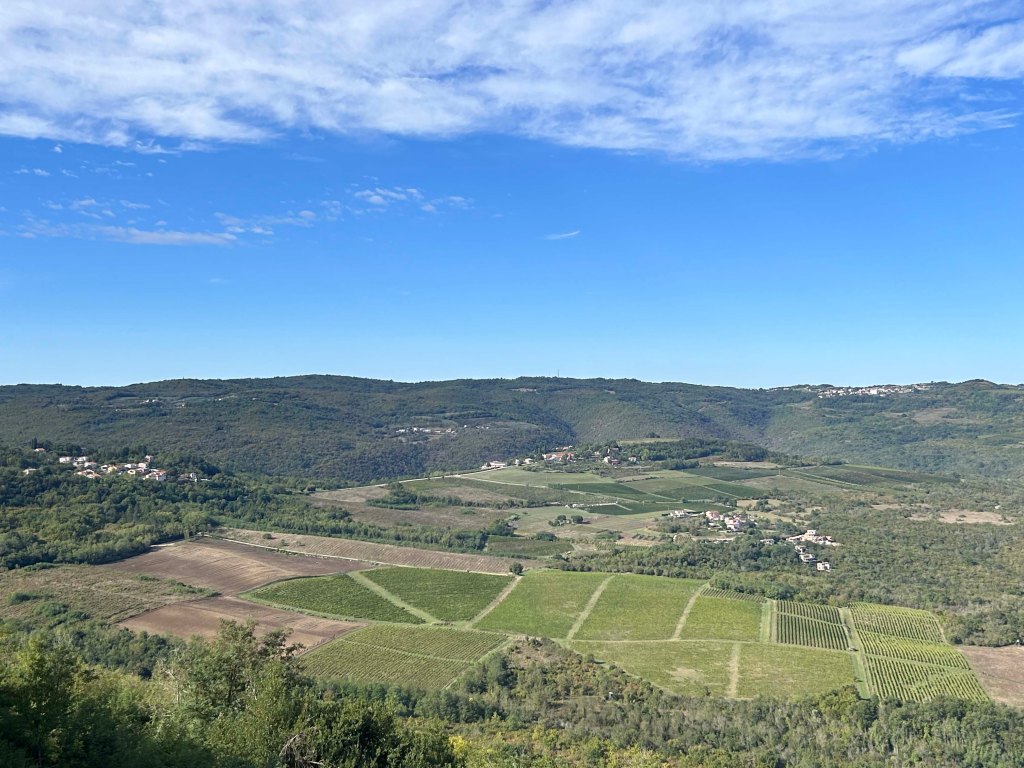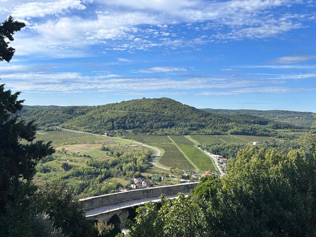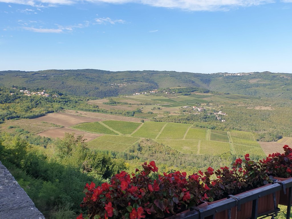 Von oben hat man – zumindest bei schönem Wetter – eine herrliche Aussicht über die hügelige Gegend und in das grüne Mirna Tal, welches zugleich als berühmte Trüffelregion bekannt ist. Die Mirma entspring in den slowenischen Bergen und fließt bei Novigrad in die Adria.