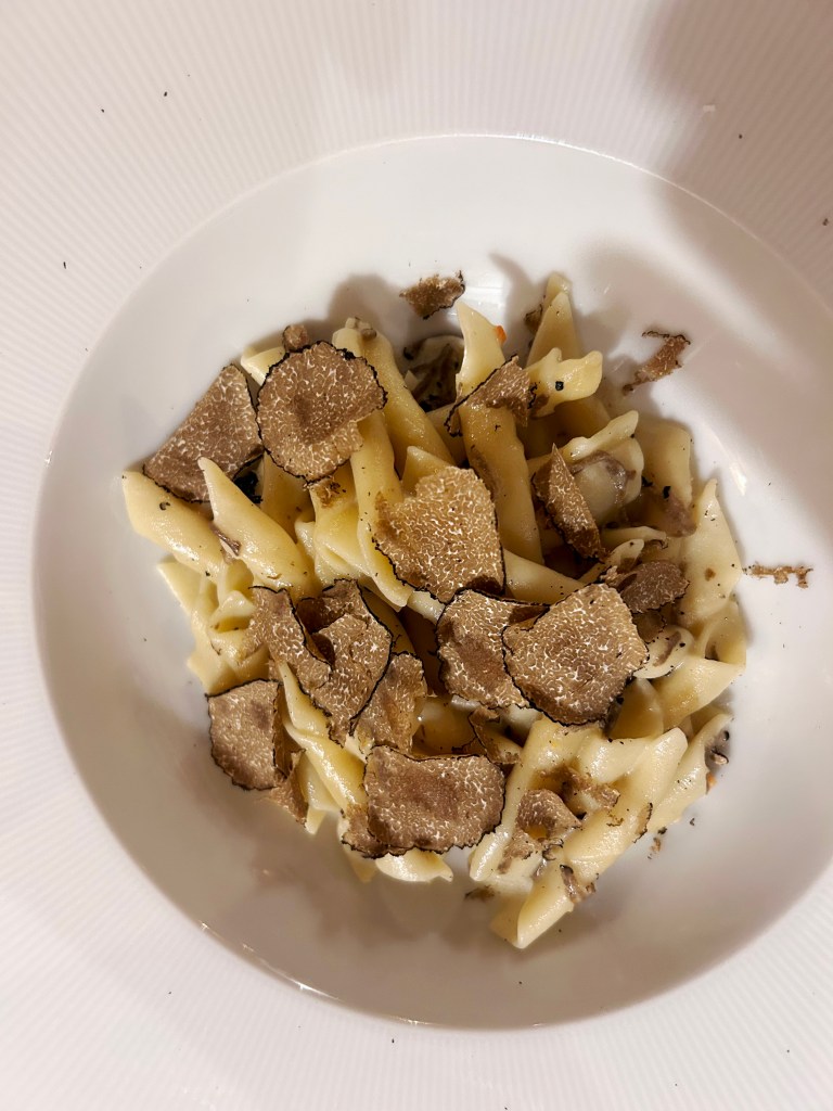 Leider hat uns das Genua-Tief, das die Alpen und Teile von Osteuropa unter Wasser setzt, nicht ganz verschont und uns trübes Wetter mit niedrigen Temperaturen geschickt. Wir beschäftigen uns von daher erst einmal intensiv mit den Trüffeln, denn Istrien ist nicht nur bekannt für seinen Wein und sein hervorragendes Olivenöl, sondern gilt auch als das Trüffelparadies. In den nordwestlichen Bergen zwischen Buzet und Motovun, vor allem entlang des Tals der Mirna, finden sich neben den schwarzen Trüffeln auch die seltenen weißen Trüffel. Die weißen Trüffel sind seltener und kostbarer – sie können im Gegensatz zu den Schwarzen nicht angebaut, sondern nur gejagt werden. Man spricht von Jagen und nicht Sammeln, da sie nur durch Hunde erschnüffelt werden können. Wir jagen zwar nicht, aber wir kosten …