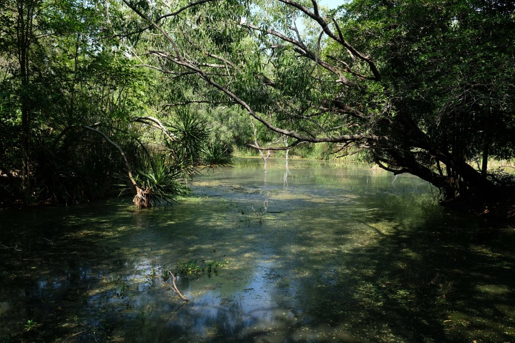 Wir starten beim Billabong, einem Wasserloch, mit vielen Vögeln und voller Schildkröten und Fischen. Auch finden wir einige interessante Spinnen.