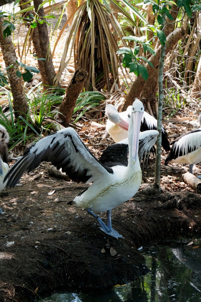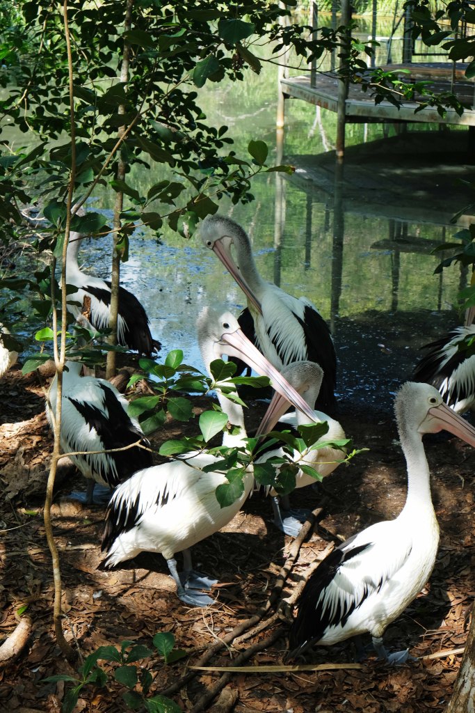 Die Pelikane warten schon im Schatten auf die Fütterung und werden ganz nervös als wir uns nähern.