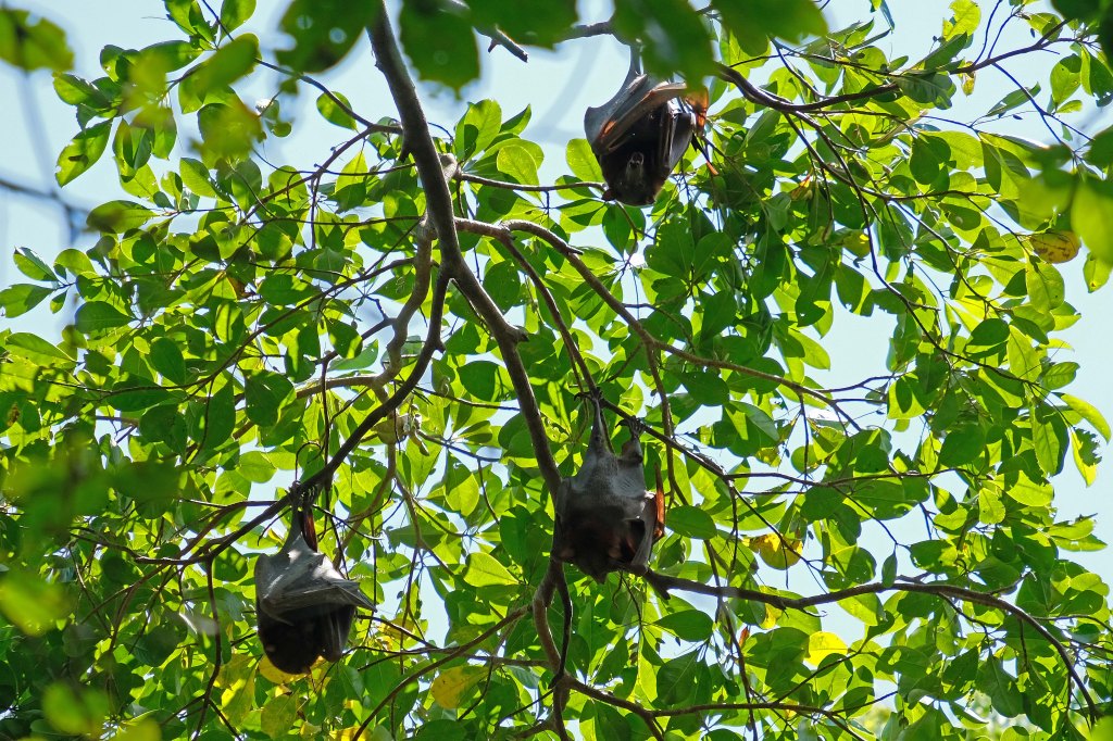 Unterwegs begegnen wir großen Flughunden, die enormen Lärm oben in den Bäumen machen.