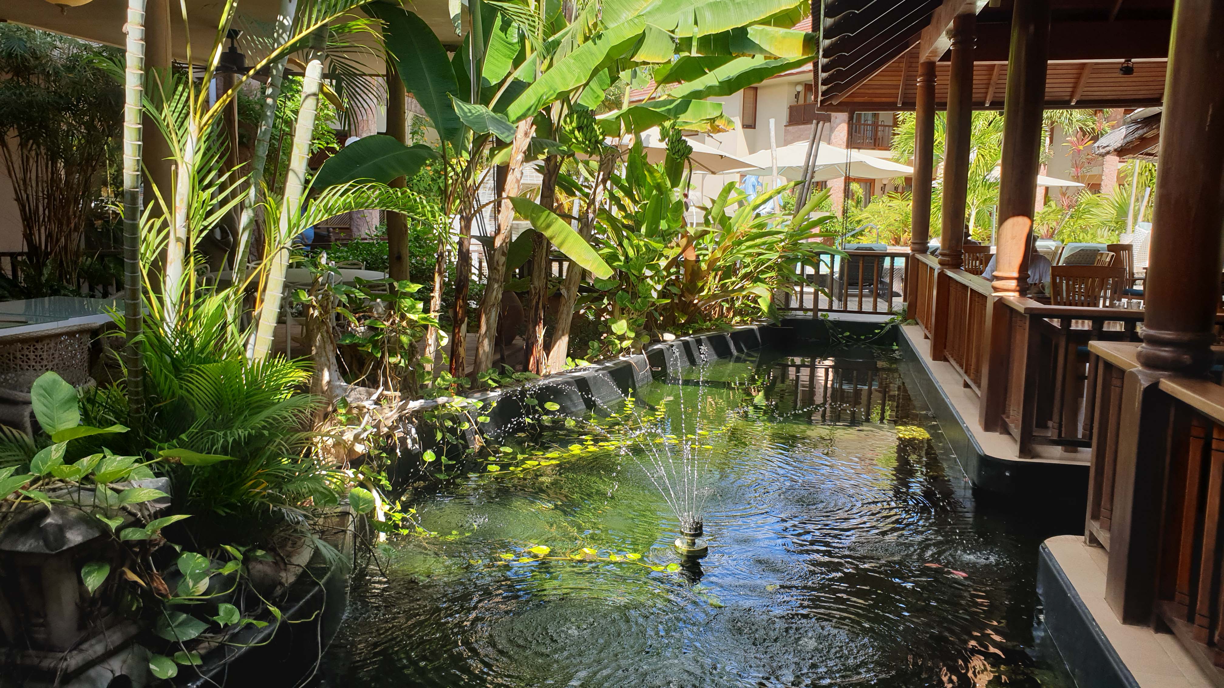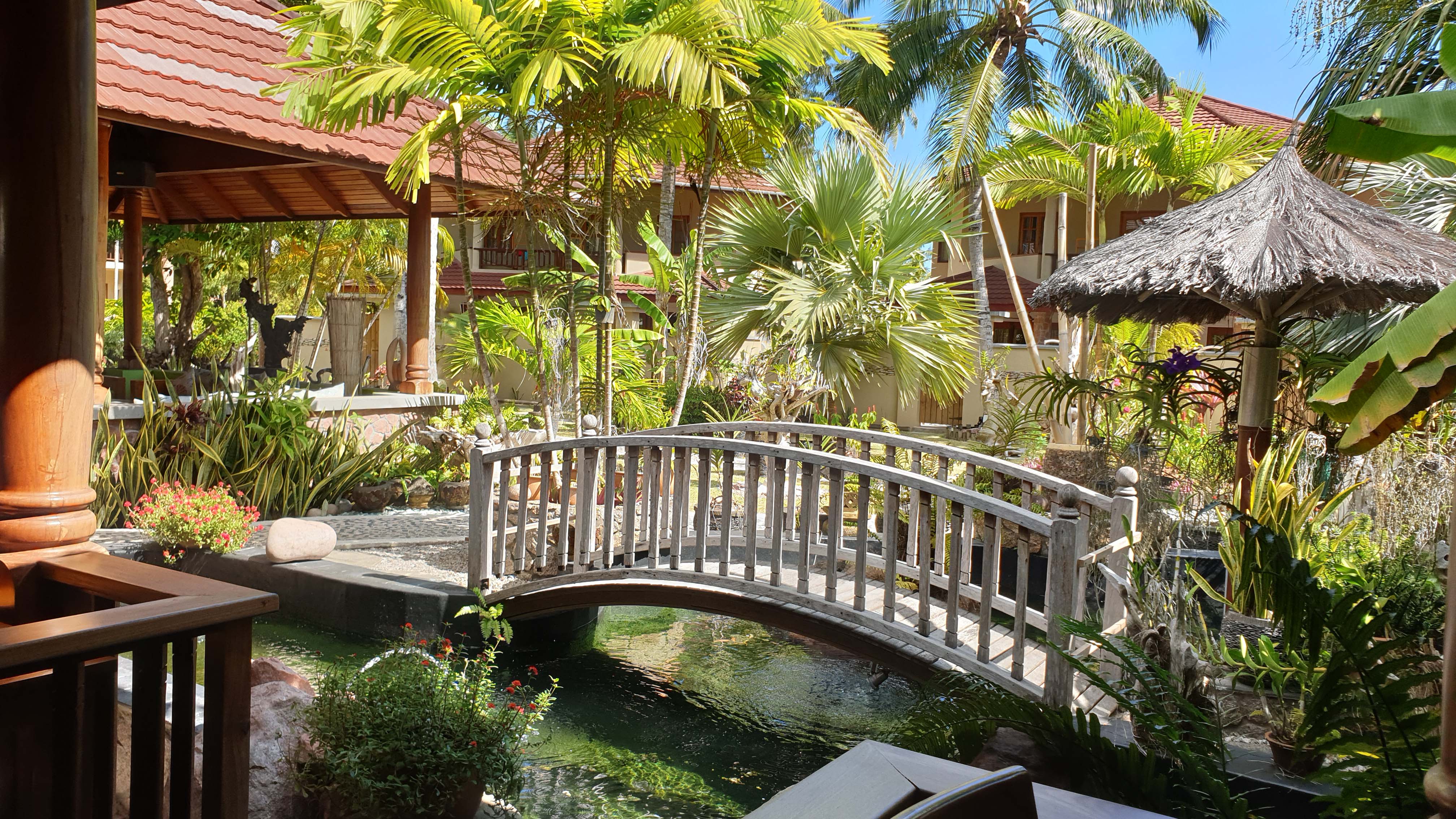 In den letzten sechs Jahren ist hier Einiges passiert. Der wunderschöne Garten mit vielen Teichen, Orchideen, Pool und Bar, umgeben von Gästehäusern aus dunklem Holz , ist soweit unverändert. Allerdings fehlen die wunderbaren Kois, da auch hier in den letzten beiden Jahren coronabedingt zurückgefahren werden müsste. Der Eigentümer versprach allerdings, um Nachwuchs zu sorgen. Inzwischen wurde ein Erweiterungstrakt errichtet, der ein absolut der Spitzenklasse angehörenden Wellnessbereich und einen Gym beherbergt. Ersteres haben wir getestet, in den Gym sind wir nicht gekommen.