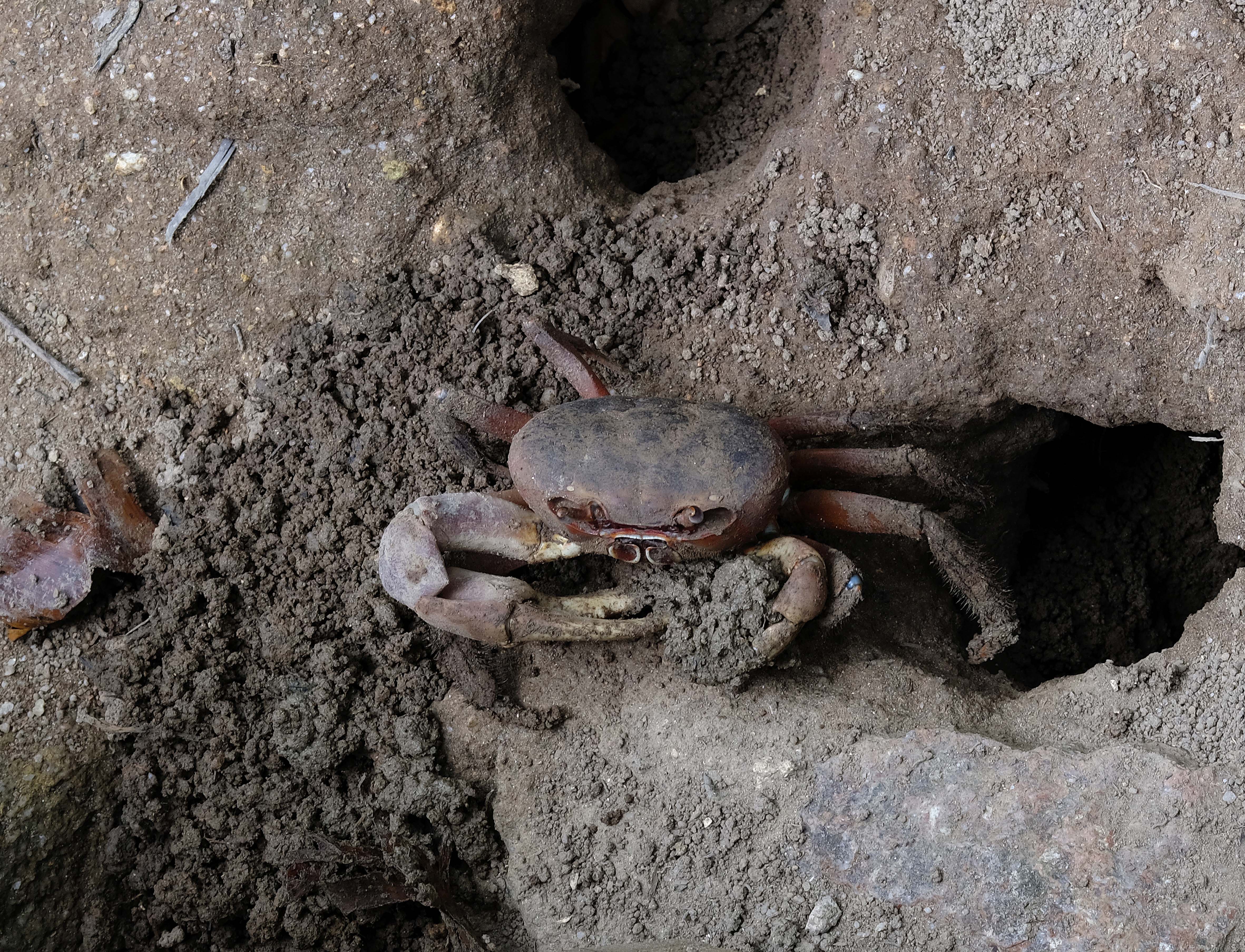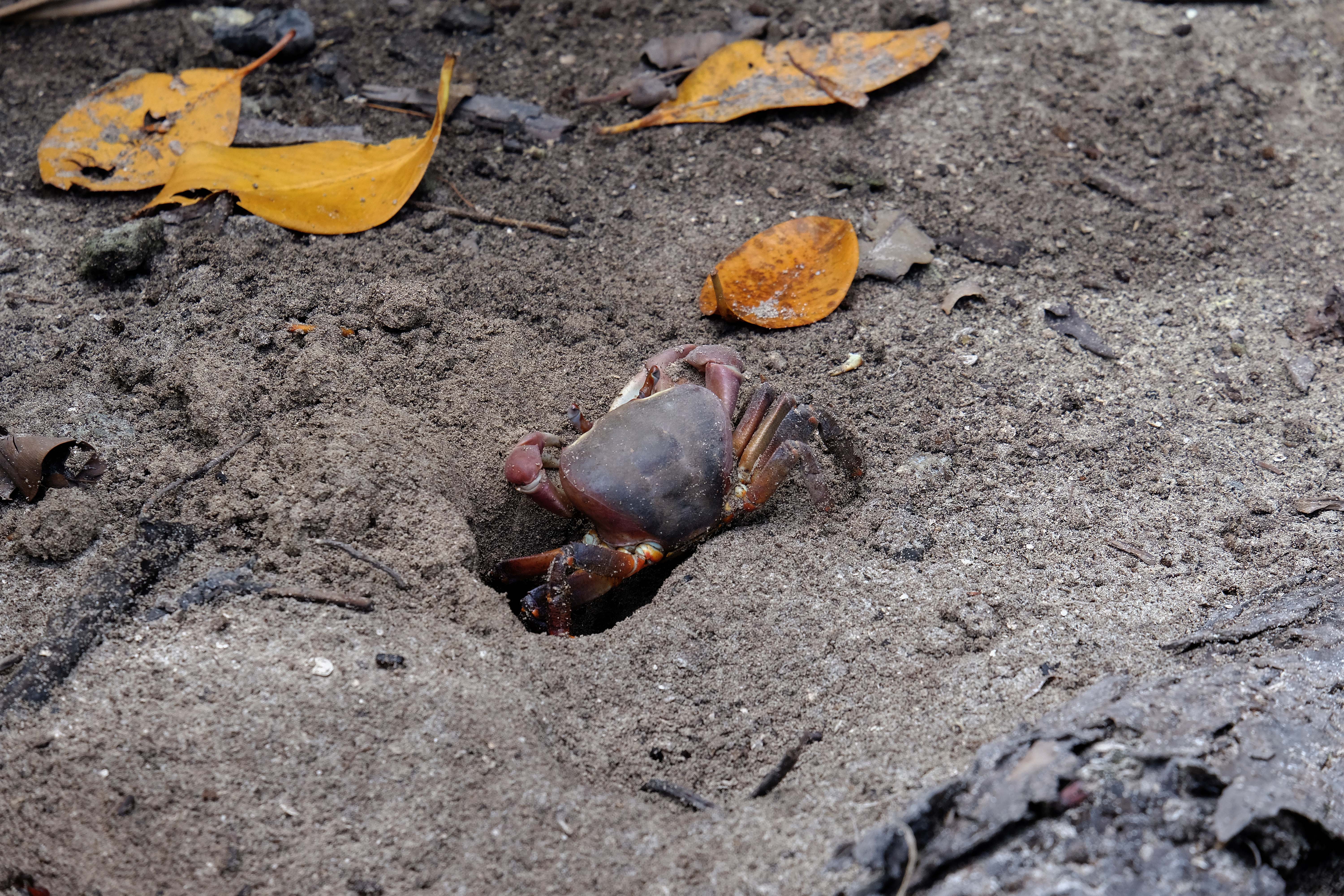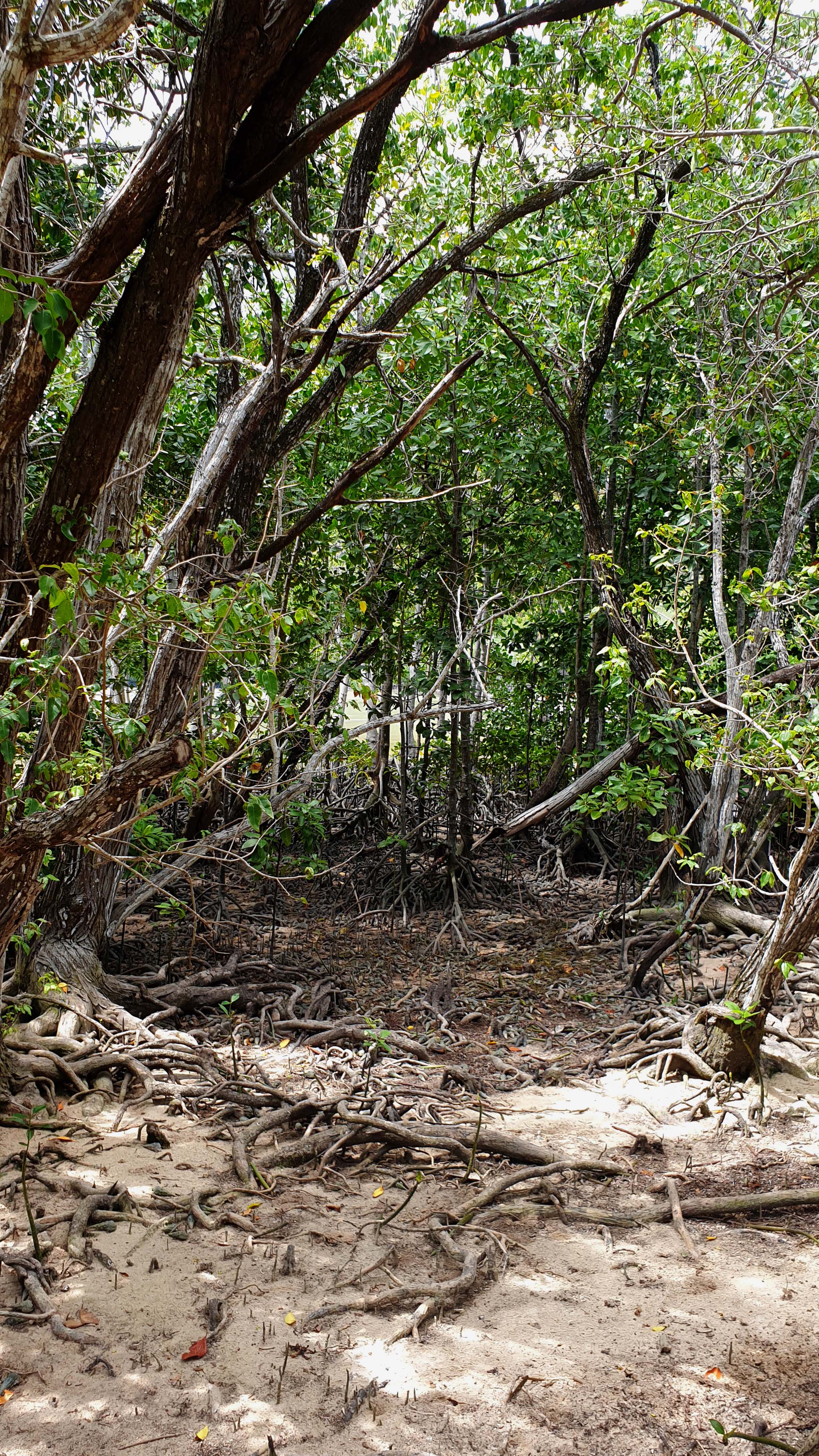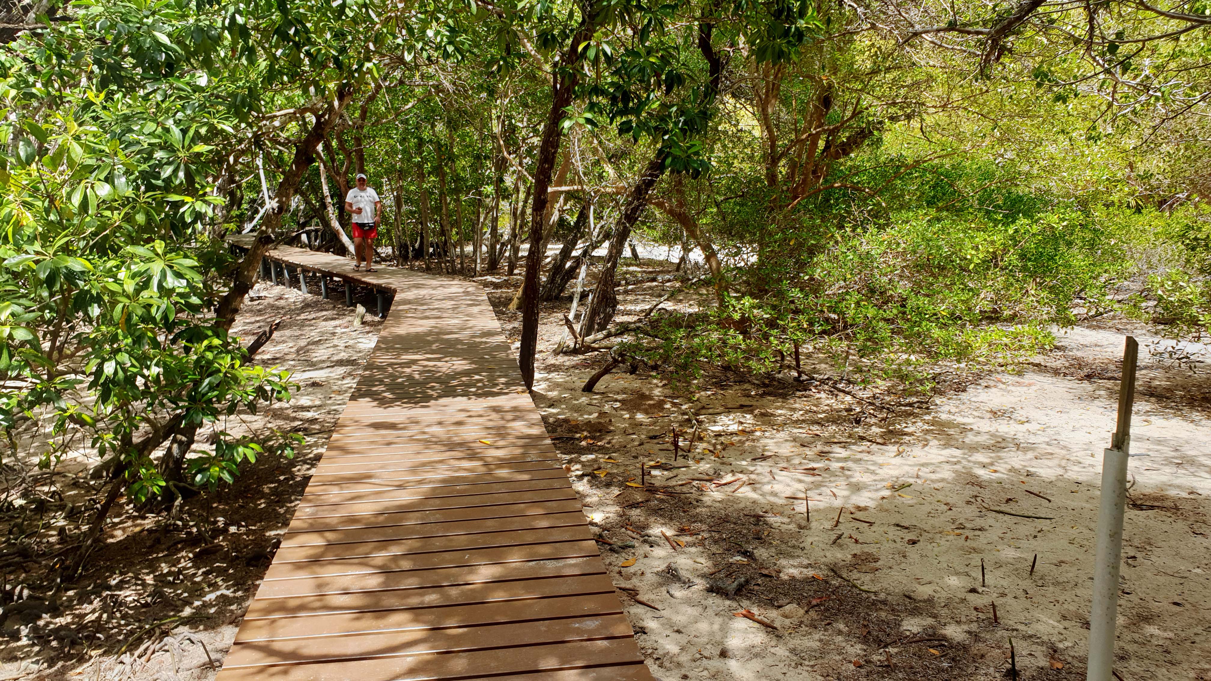 Ein 1,7 km langer Weg über die Insel führte uns u.a. über einen Holzsteg durch Mangrovenwälder zu einem anderen Strand. In den Mangroven können wir die Landkrabben beobachten, wenn auch nicht die großen, die die jungen Schildkröten gefährden.