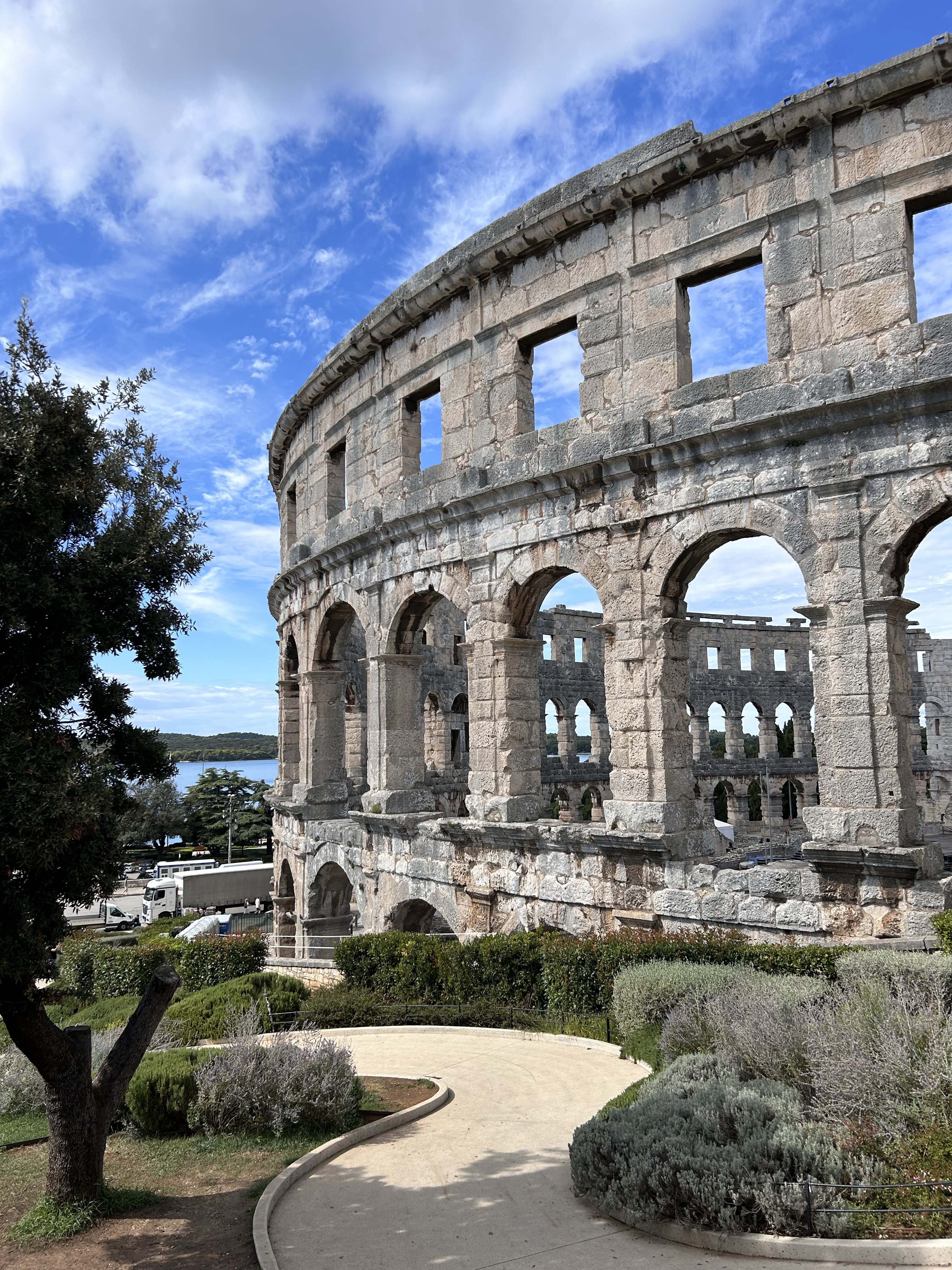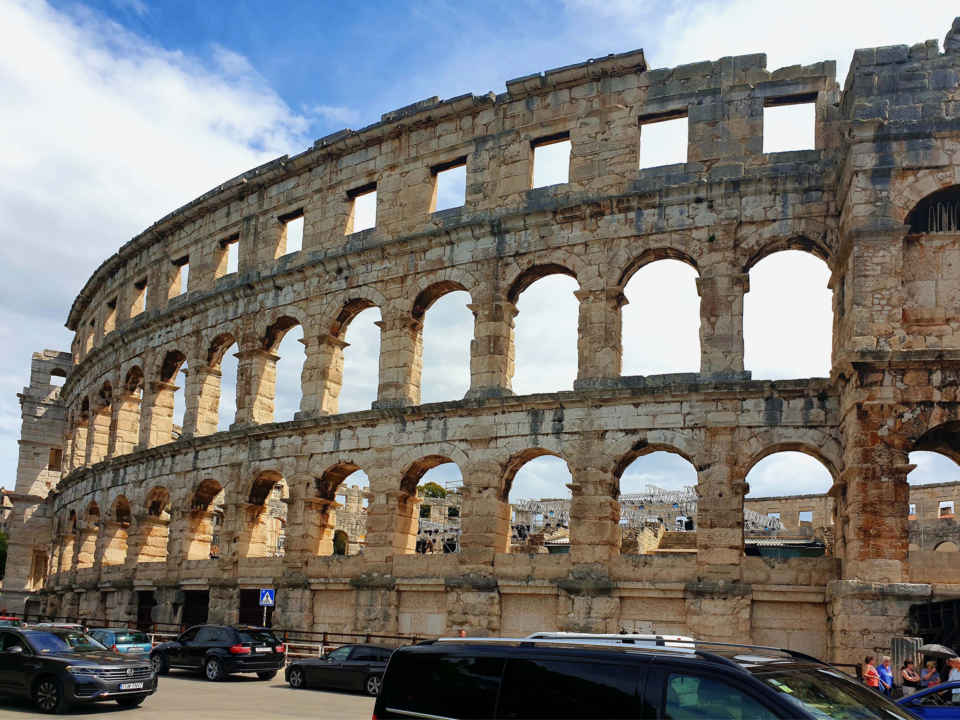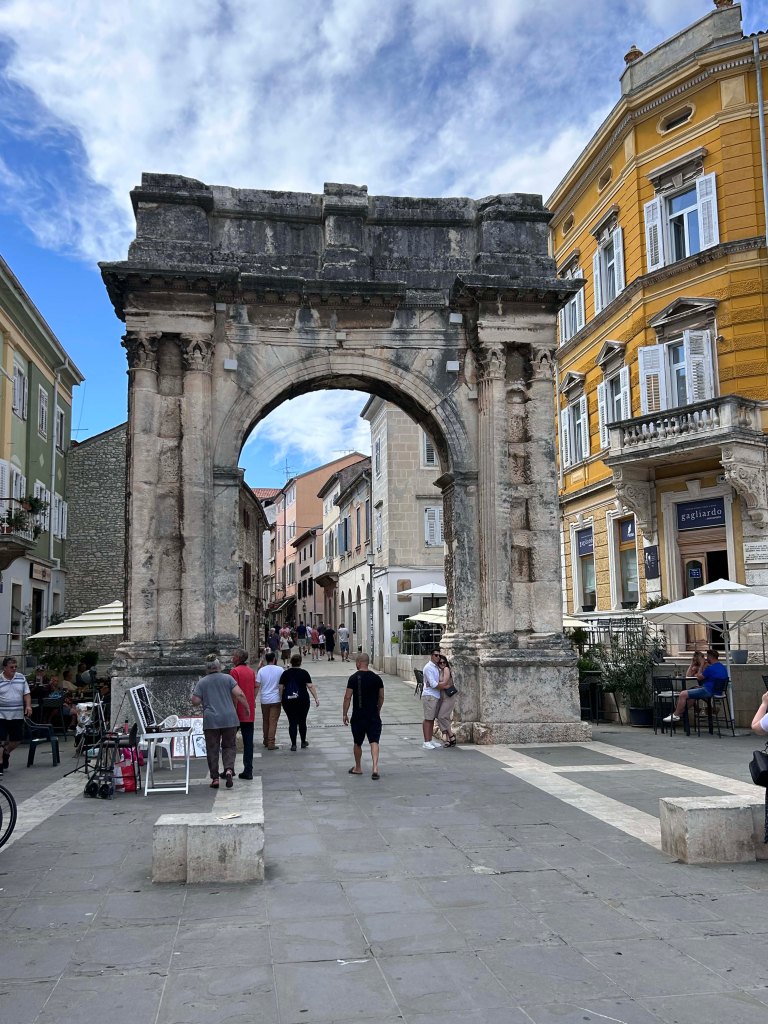 Anschließend fahren wir weiter nach Pula, der Hauptstadt der Provinz Istrien. Sie vermittelt uns eher den Eindruck einer Industriestadt als einem touristischen Highlight. Pula zeigt an vielen Stellen seine römischen Wurzeln ; wurde aber unter der Herrschaft von Österreich-Ungarn zu einem Standort der größten Kriegswerft und zum Haupthafen für die Kriegsschiffe des Kaiserreiches entwickelt.
