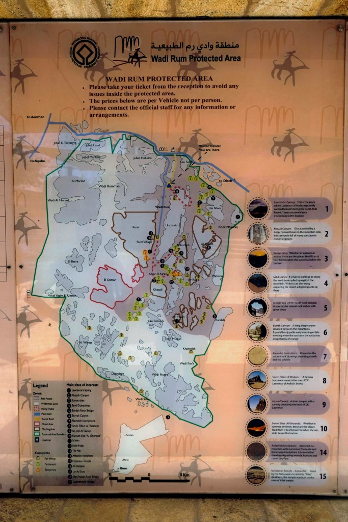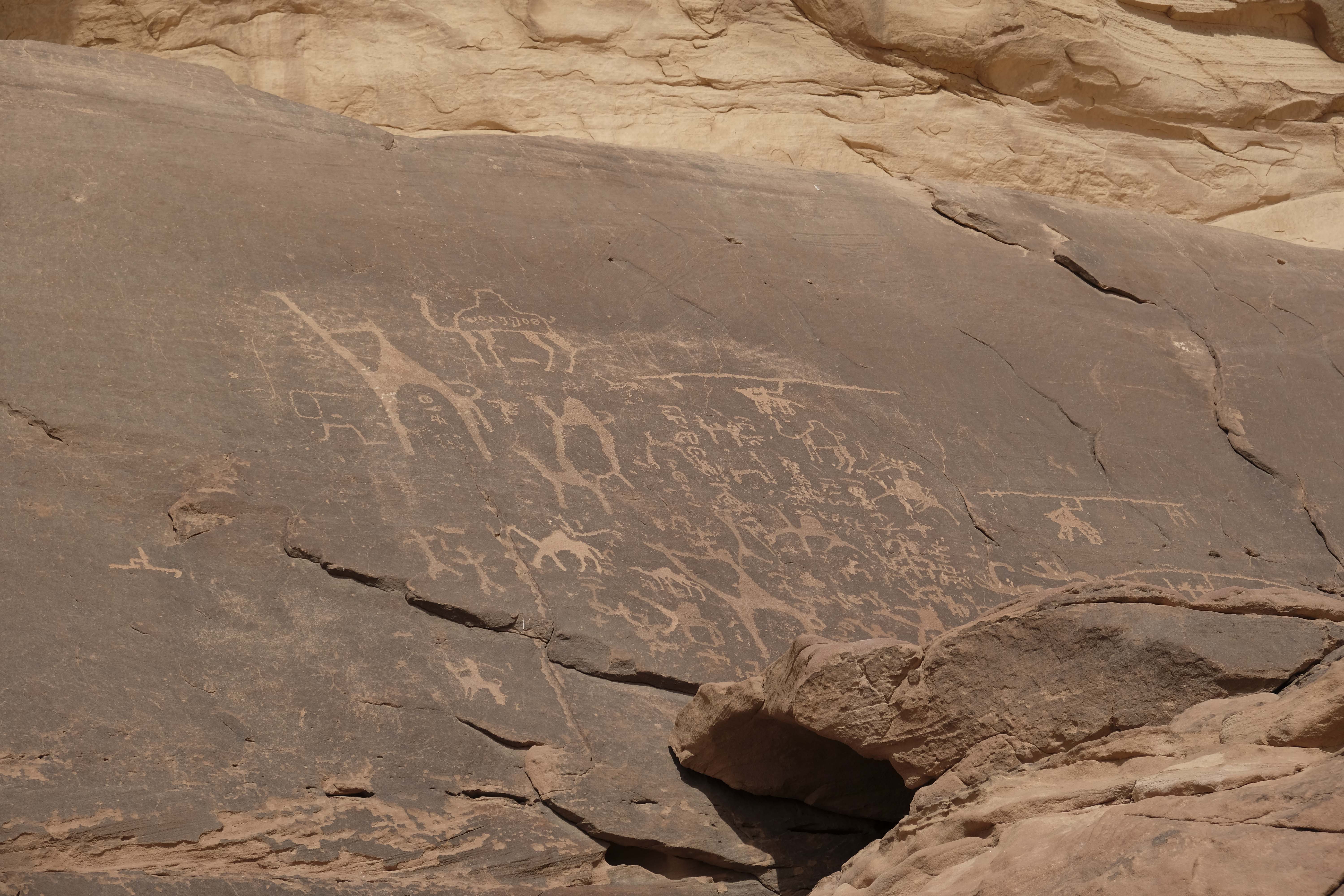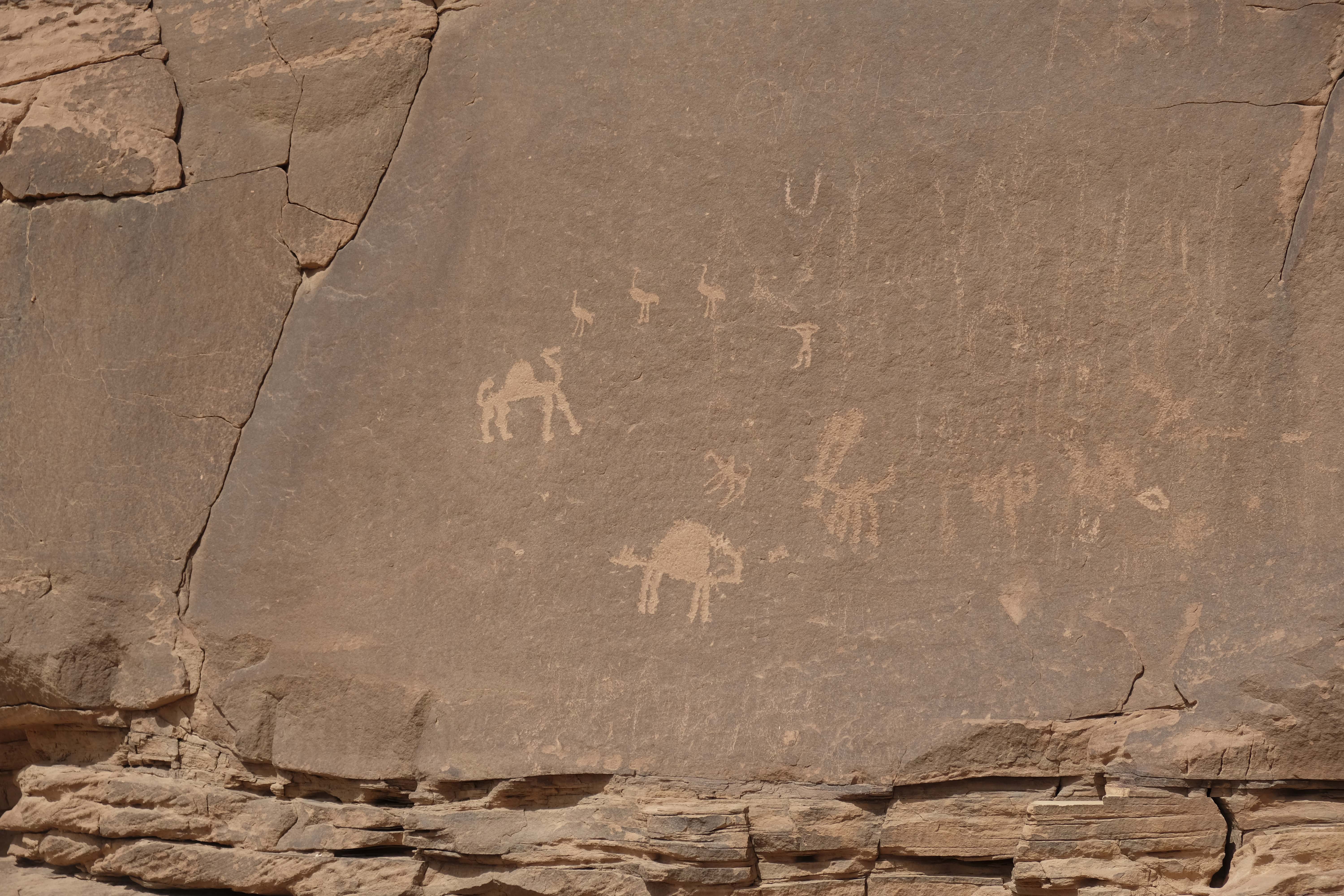 Wadi Rum ist auch Weltkulturerbe. Überall findet man alte Steinzeichnungen von Kamelen und Oryxen und Hinweisen für die Karawanen, wo Wasser zu finden ist.