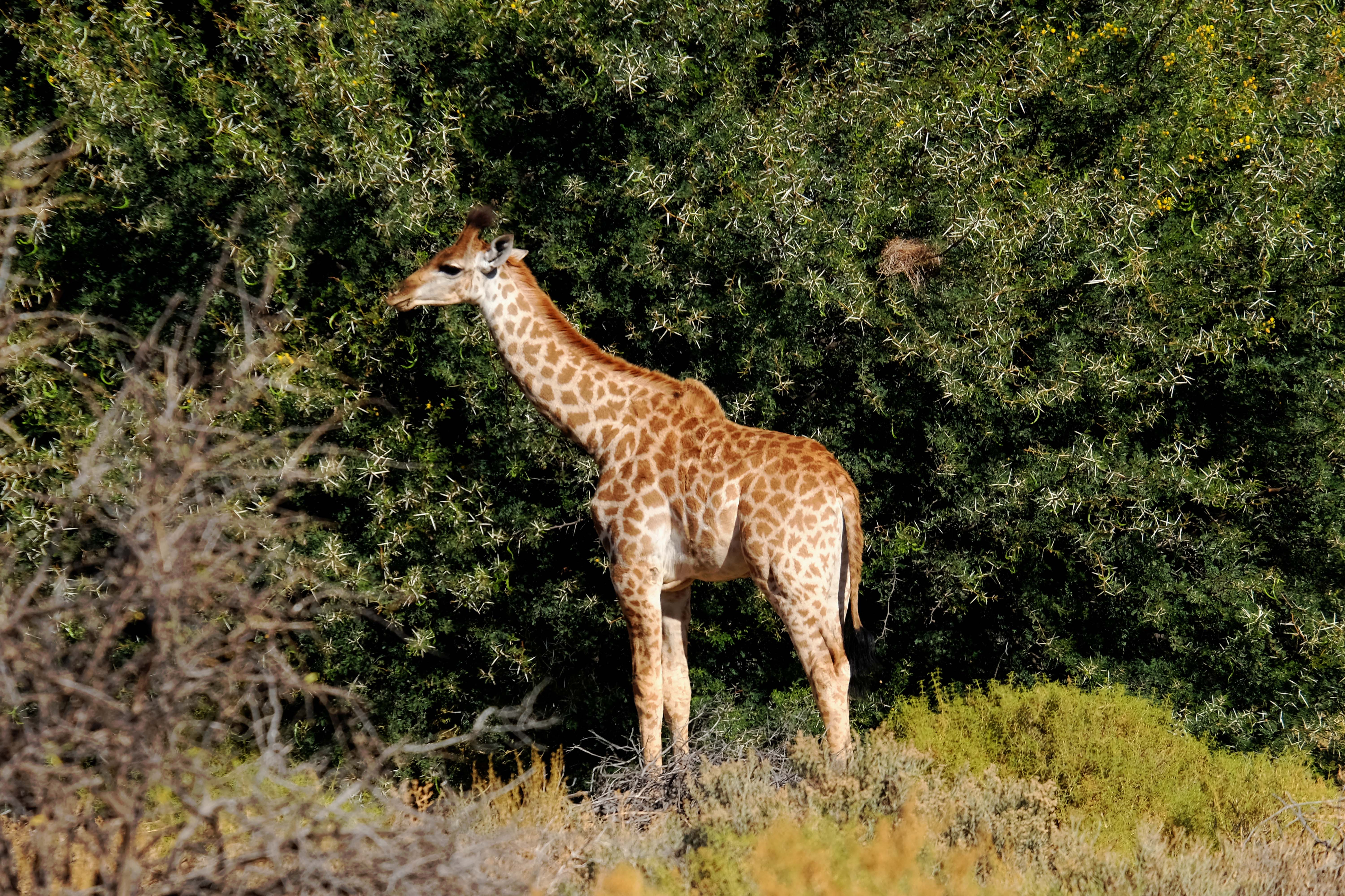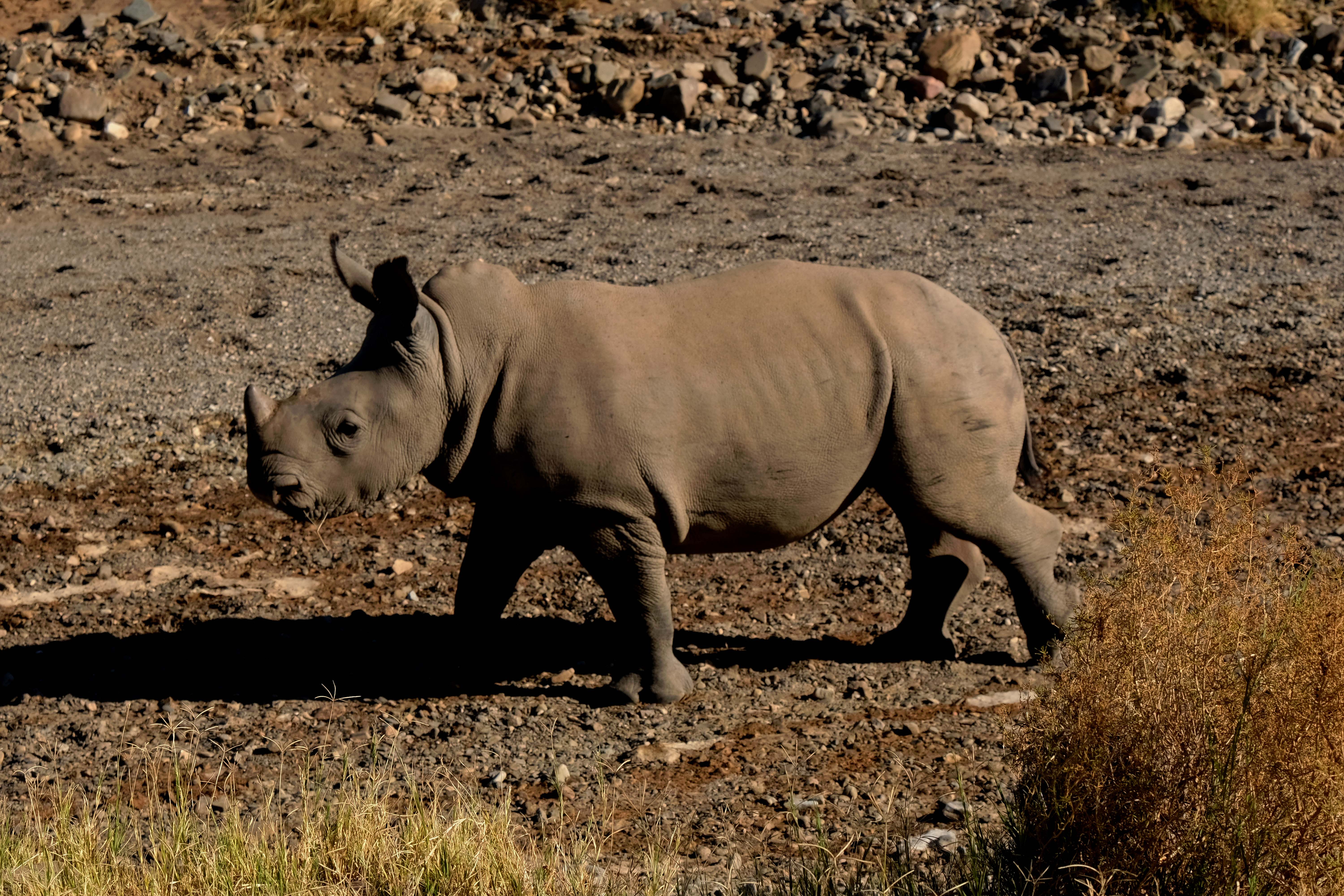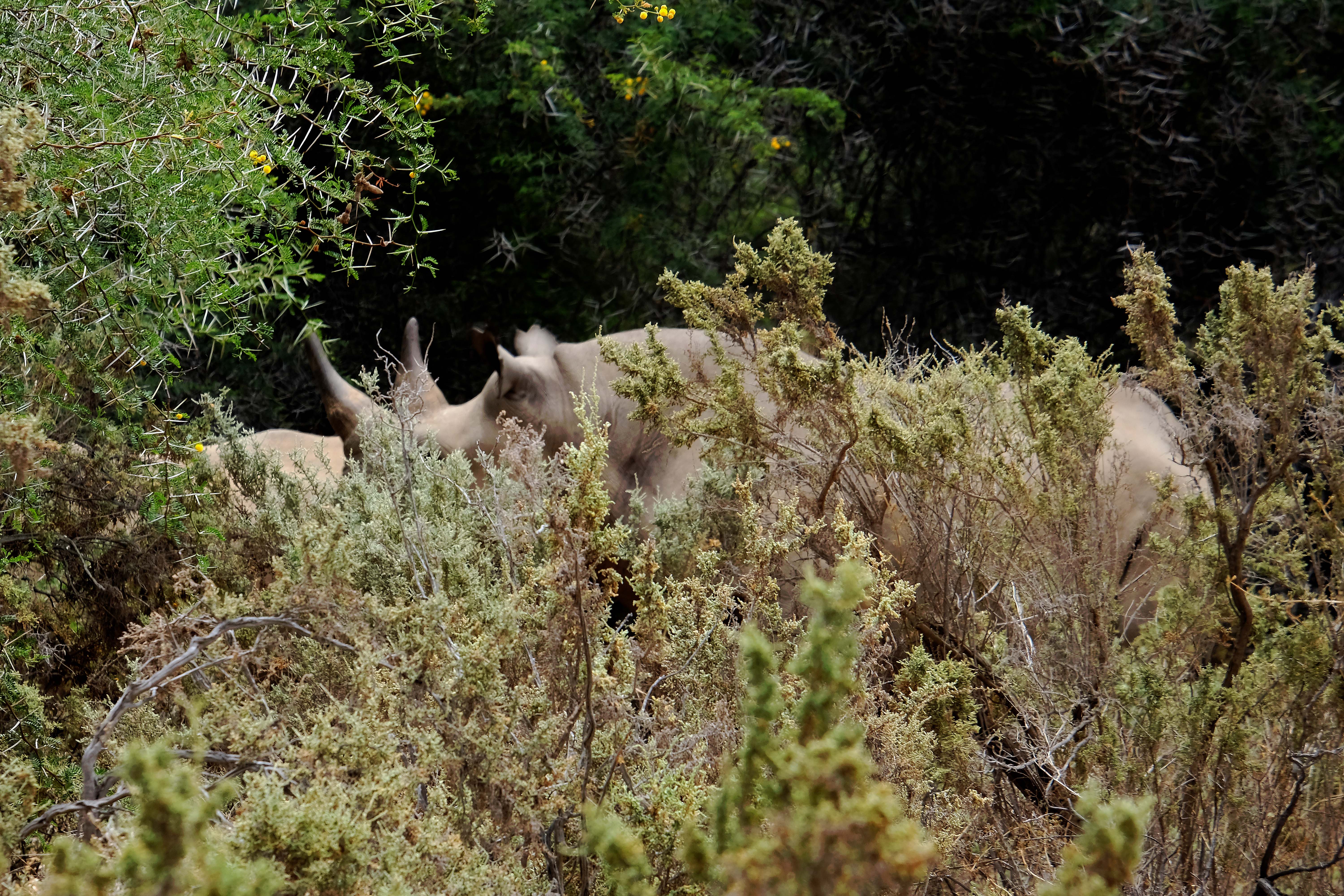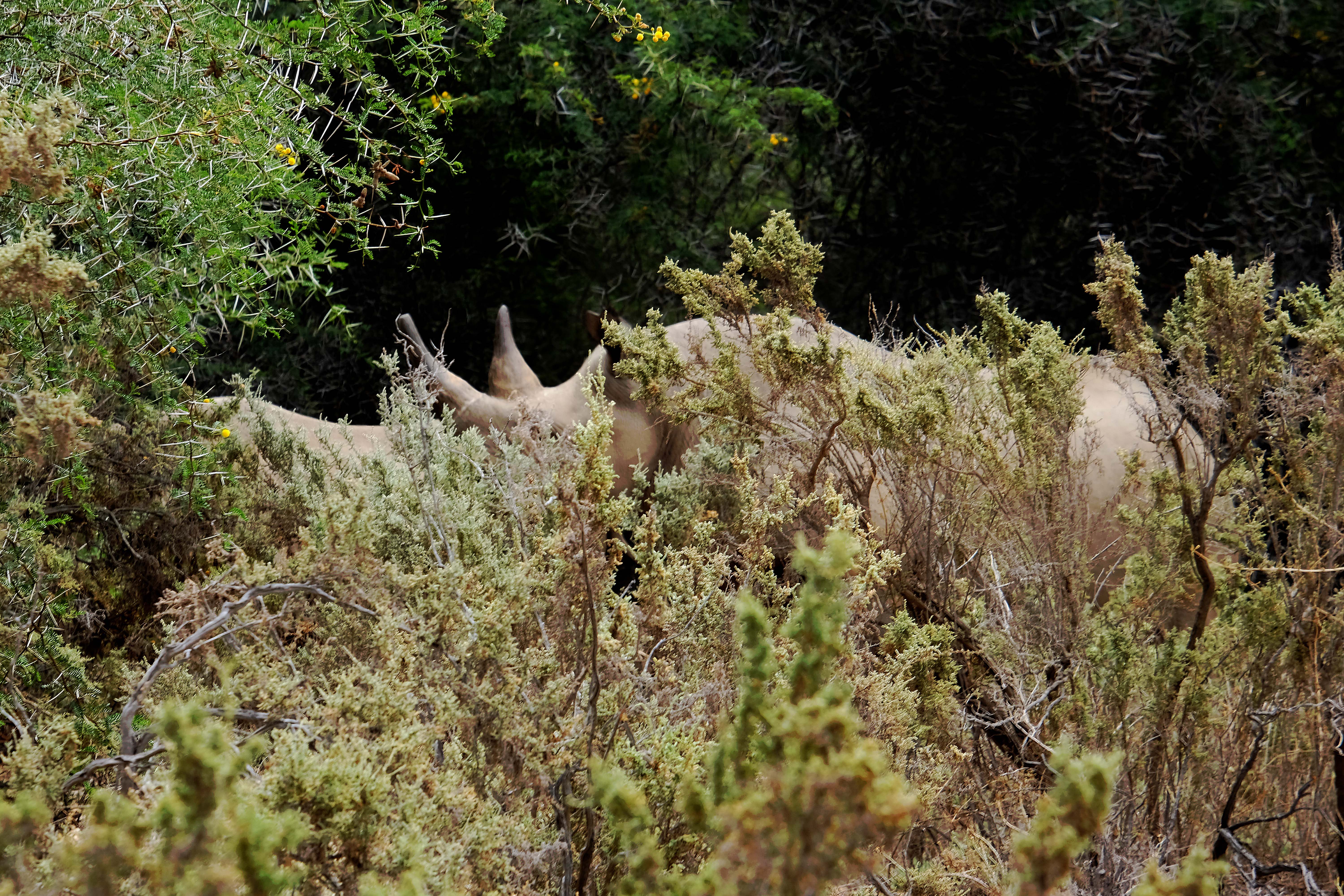 Und dann haben wir Glück. Im Dickicht entdecken wir zwei Spitzmaulnashörner. Sie sind sehr schwer zu finden, da sie im Busch leben und sehr scheu sind. Auch jetzt verstecken sich die beiden im Gebüsch und nehmen ihren Fototermin nur halbherzig wahr. Spitzmaulnashörner hatten wir bisher noch nie gesehen.