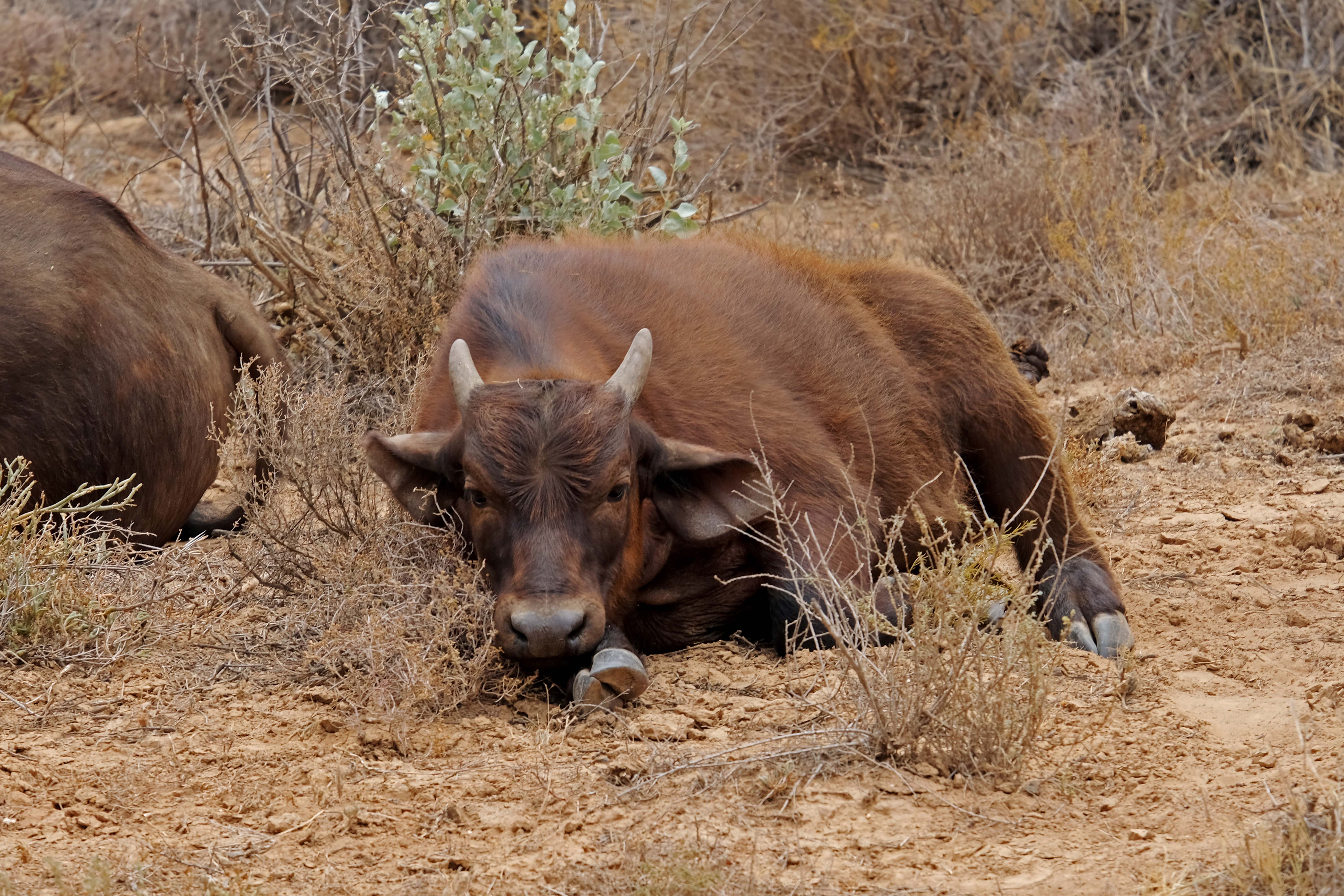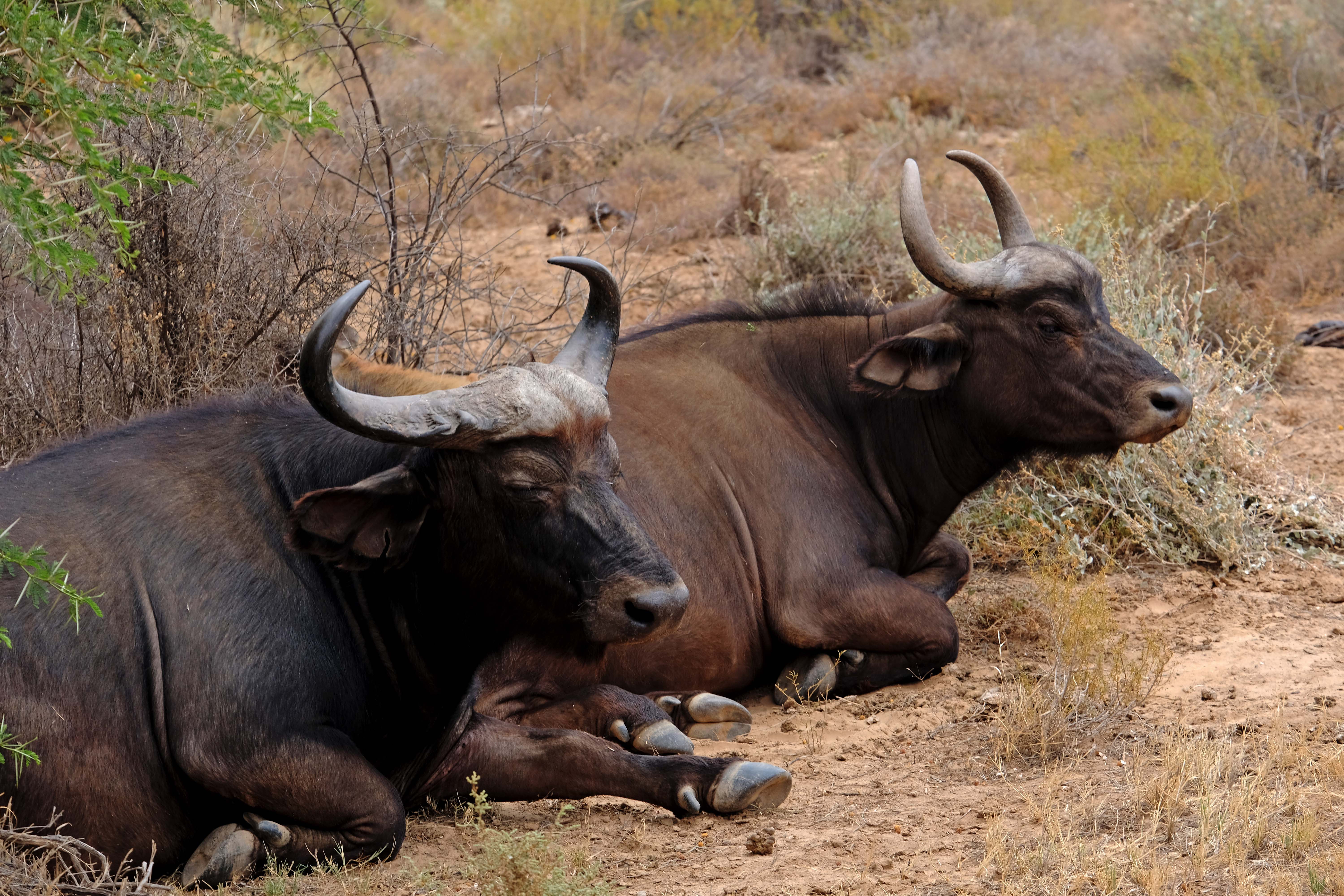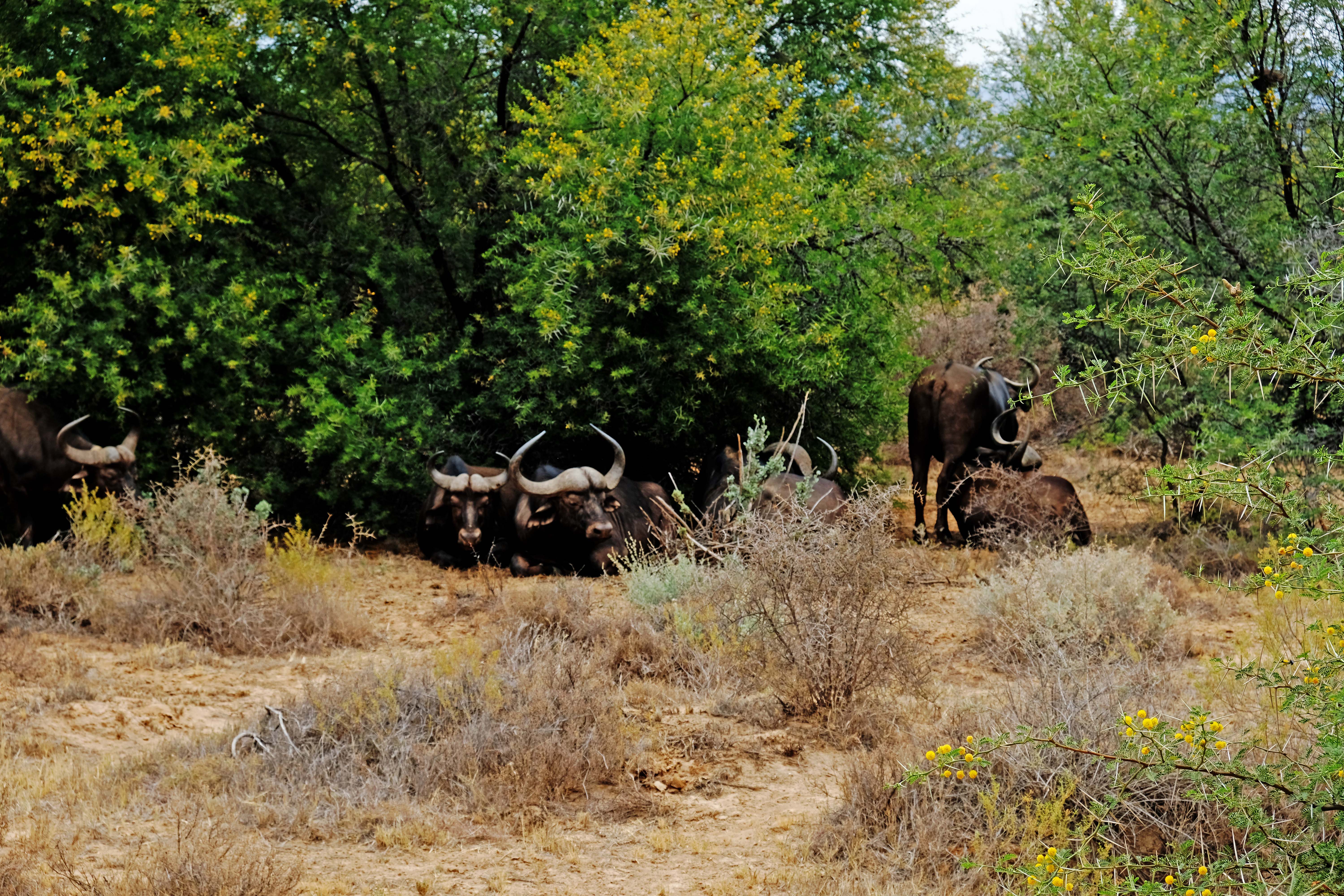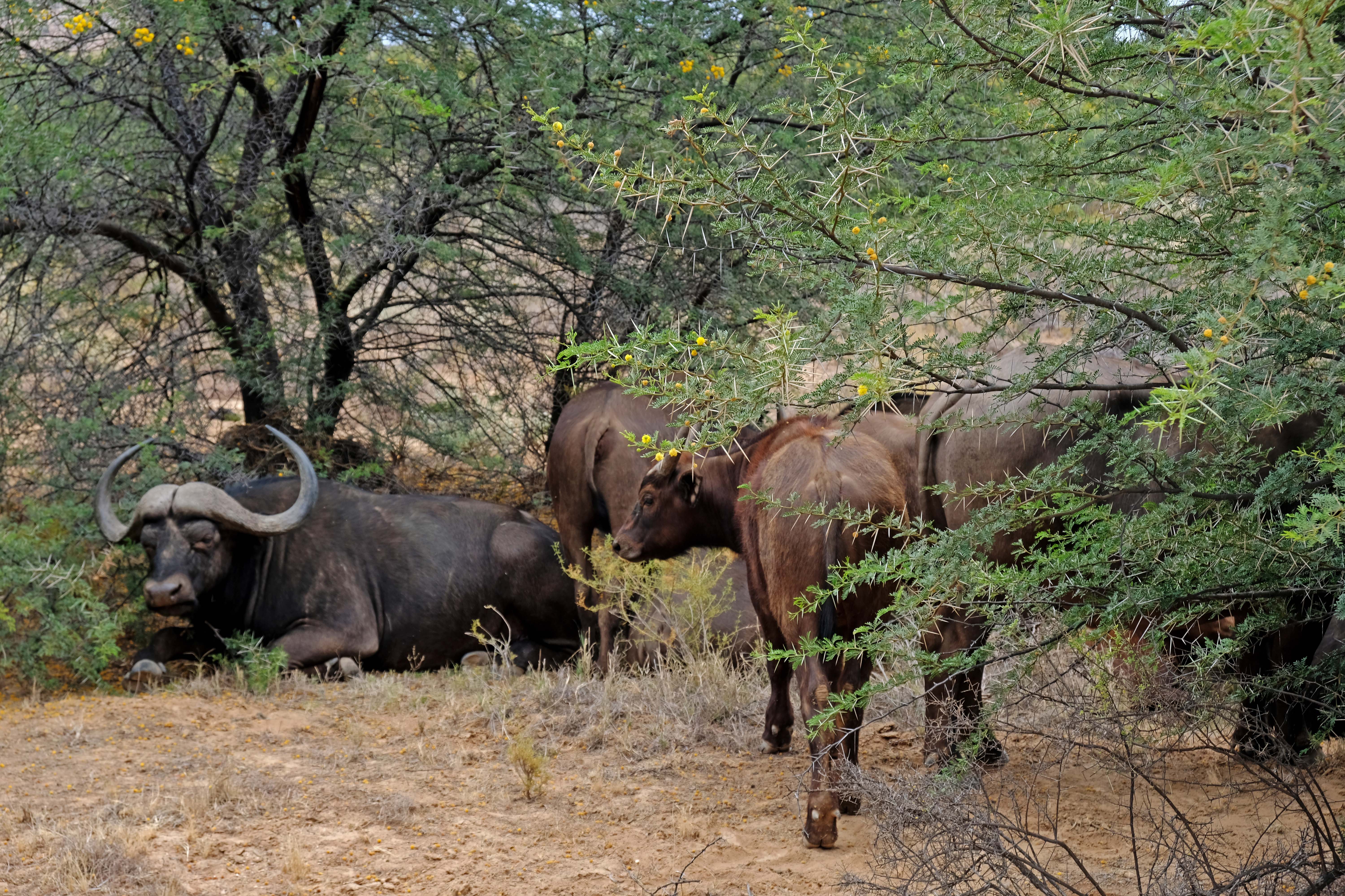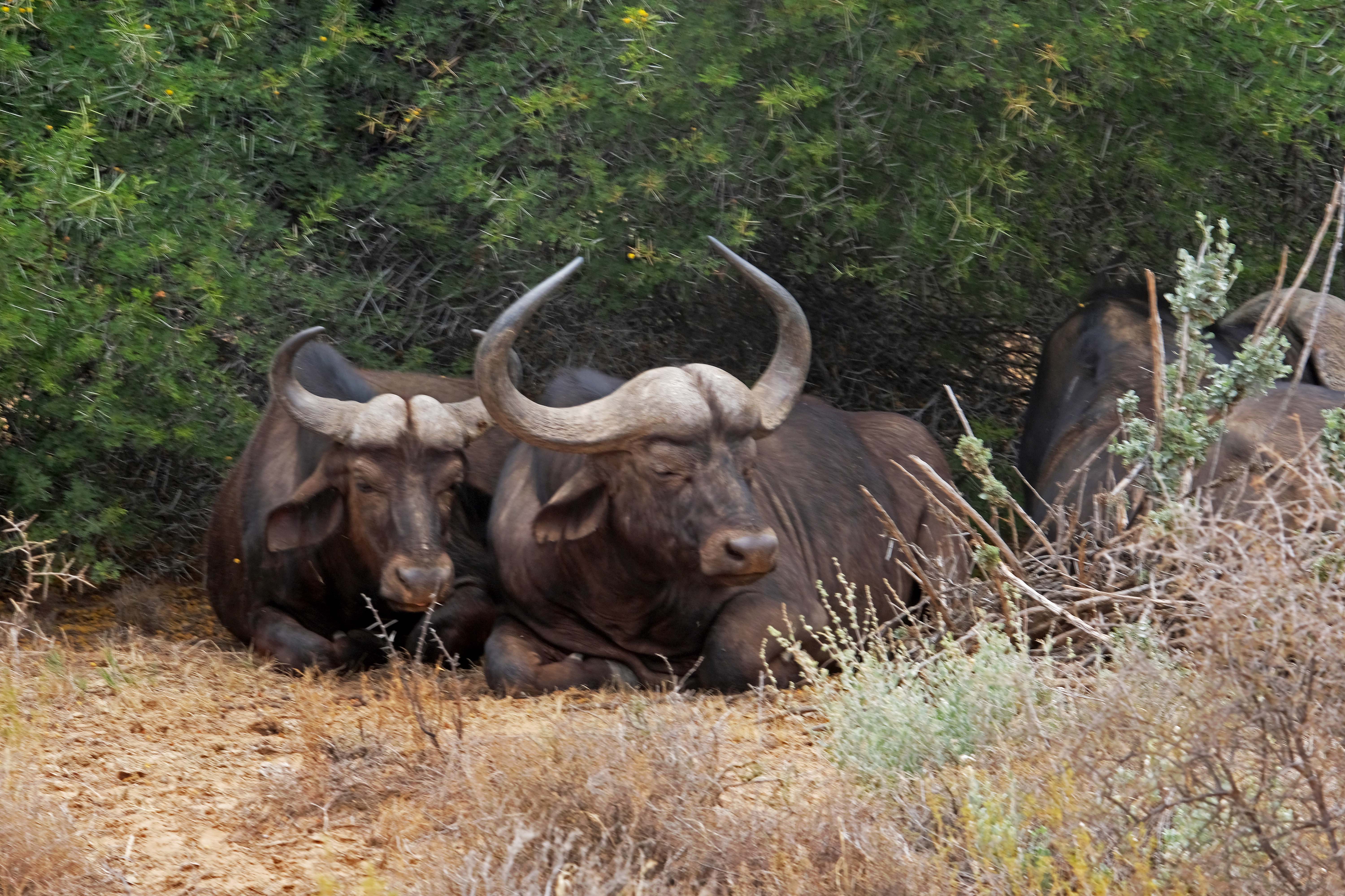 Die Büffel liegen faul im Schatten und verdauen ihre Mahlzeit.