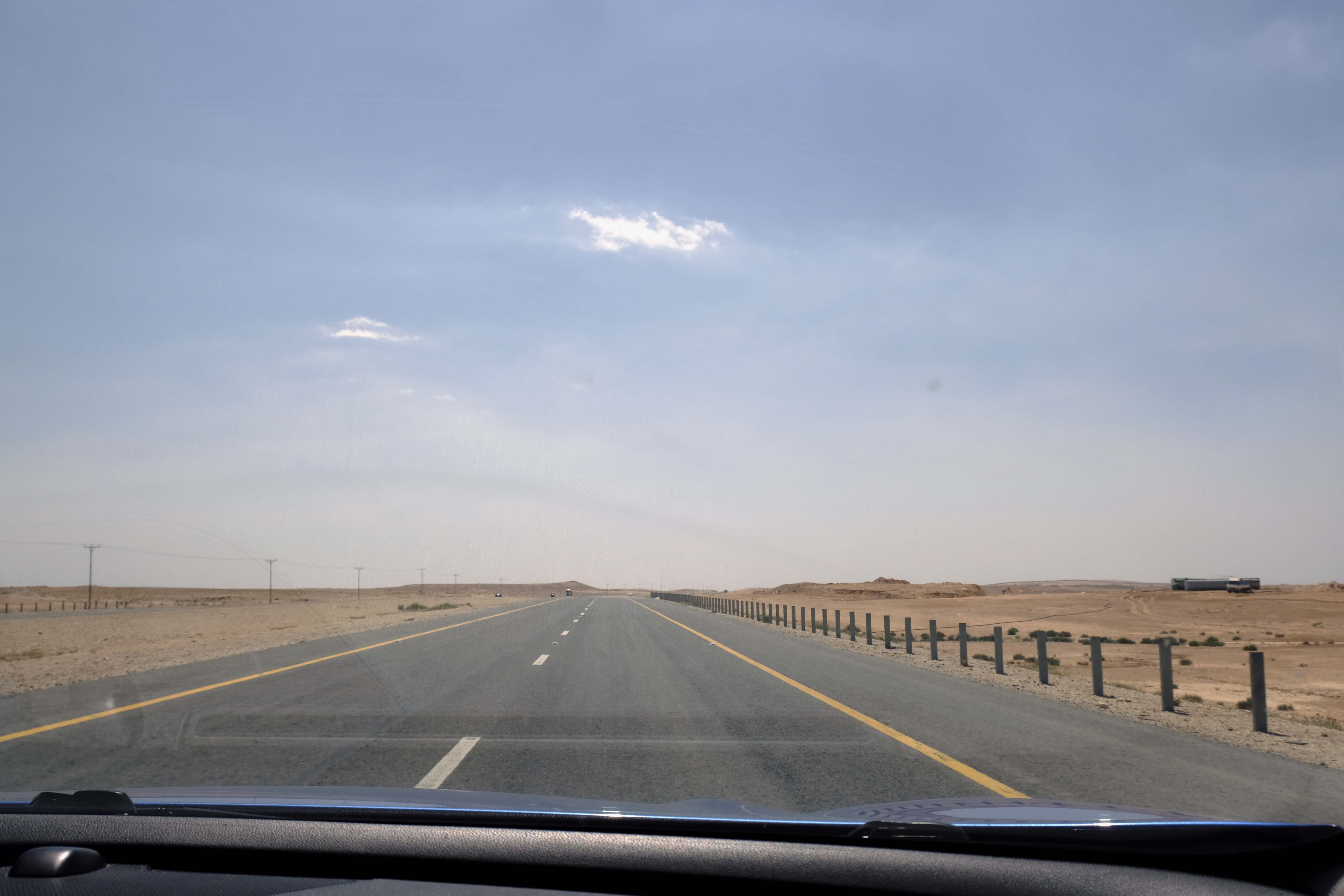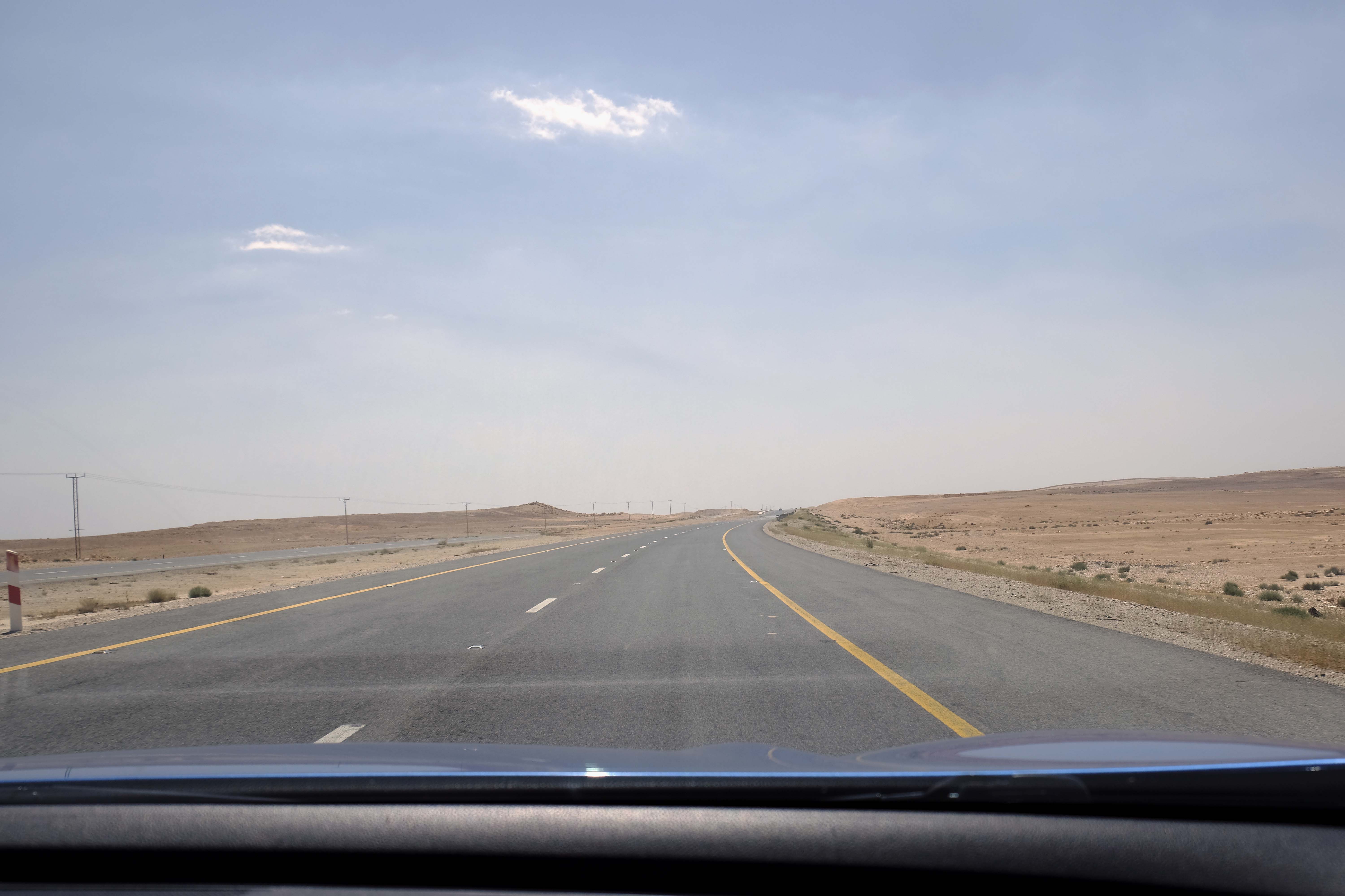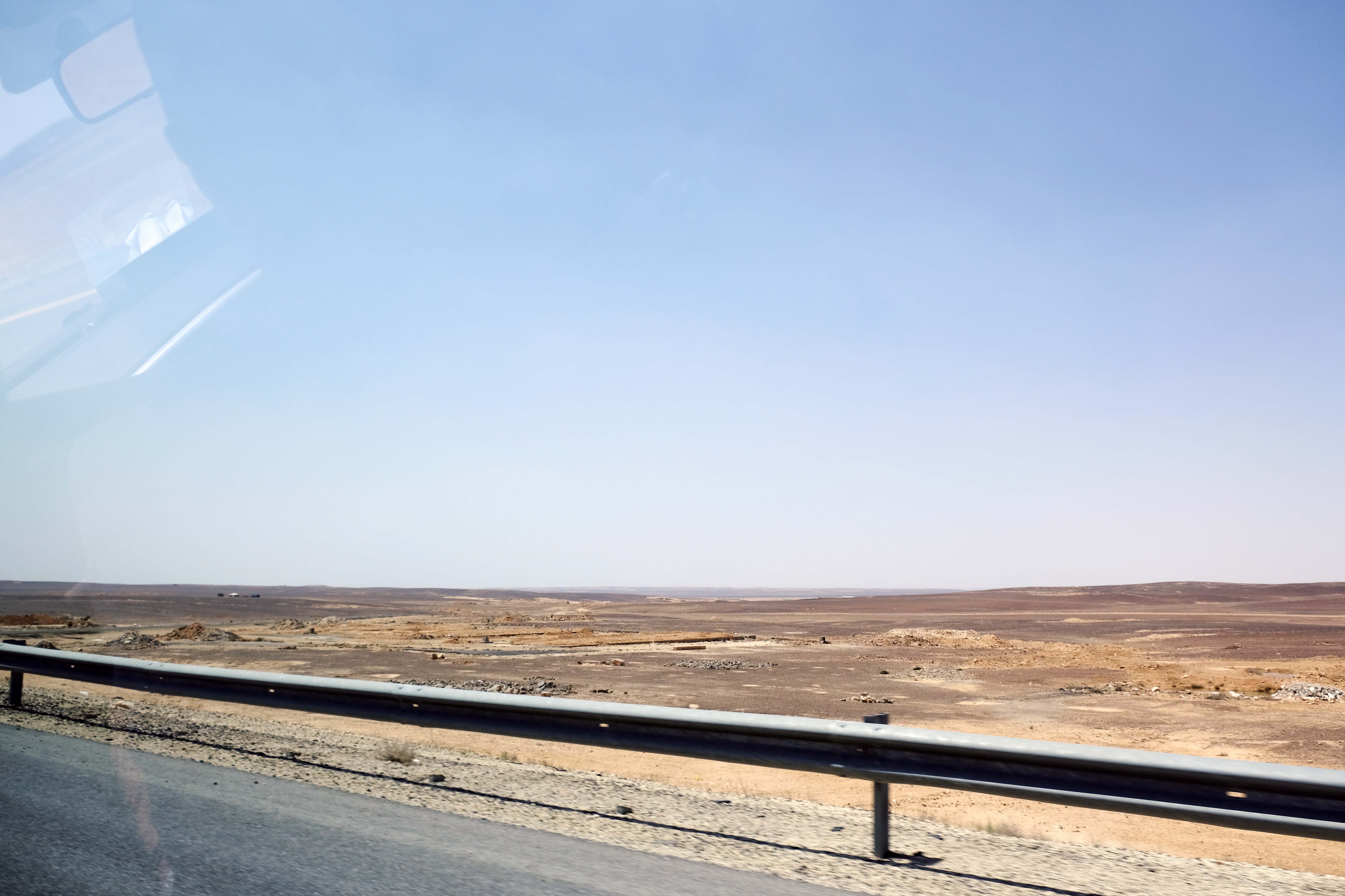 Wir fahren die inzwischen sehr gut ausgebaute Fernstraße von Amman nach Osten und starten in einer savannenähnlichen Landschaft, die sich allmählich zu einer Steinwüste aus Basaltgestein verändert. Uns begleiten hauptsächlich Lastwagen mit Autos und Öl bzw. Benzin beladen, die zwischen Amman, Bagdad und Saudi Arabien verkehren. Einige befördern auch Container aus Jordaniens einzigem Hafen Aqaba.