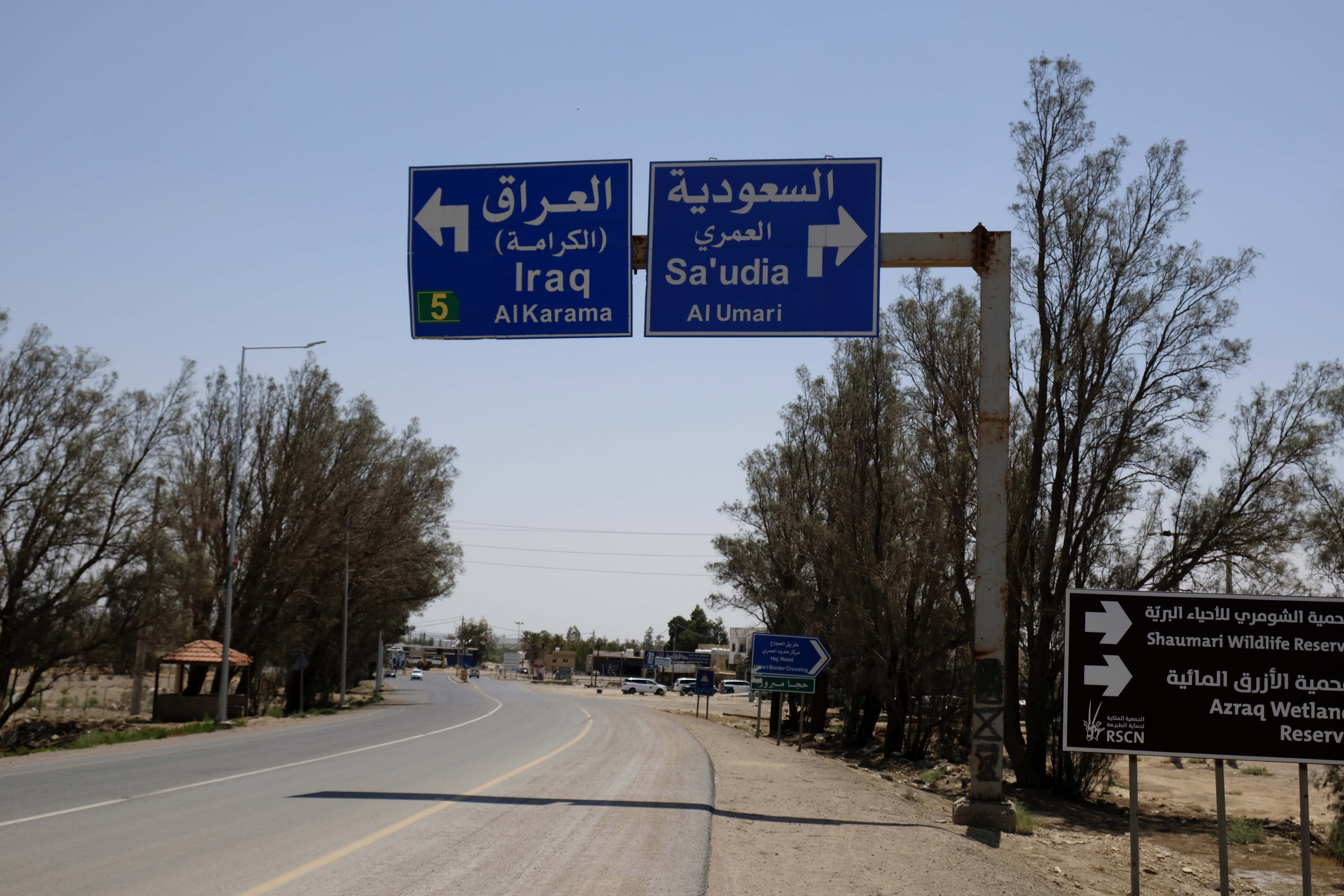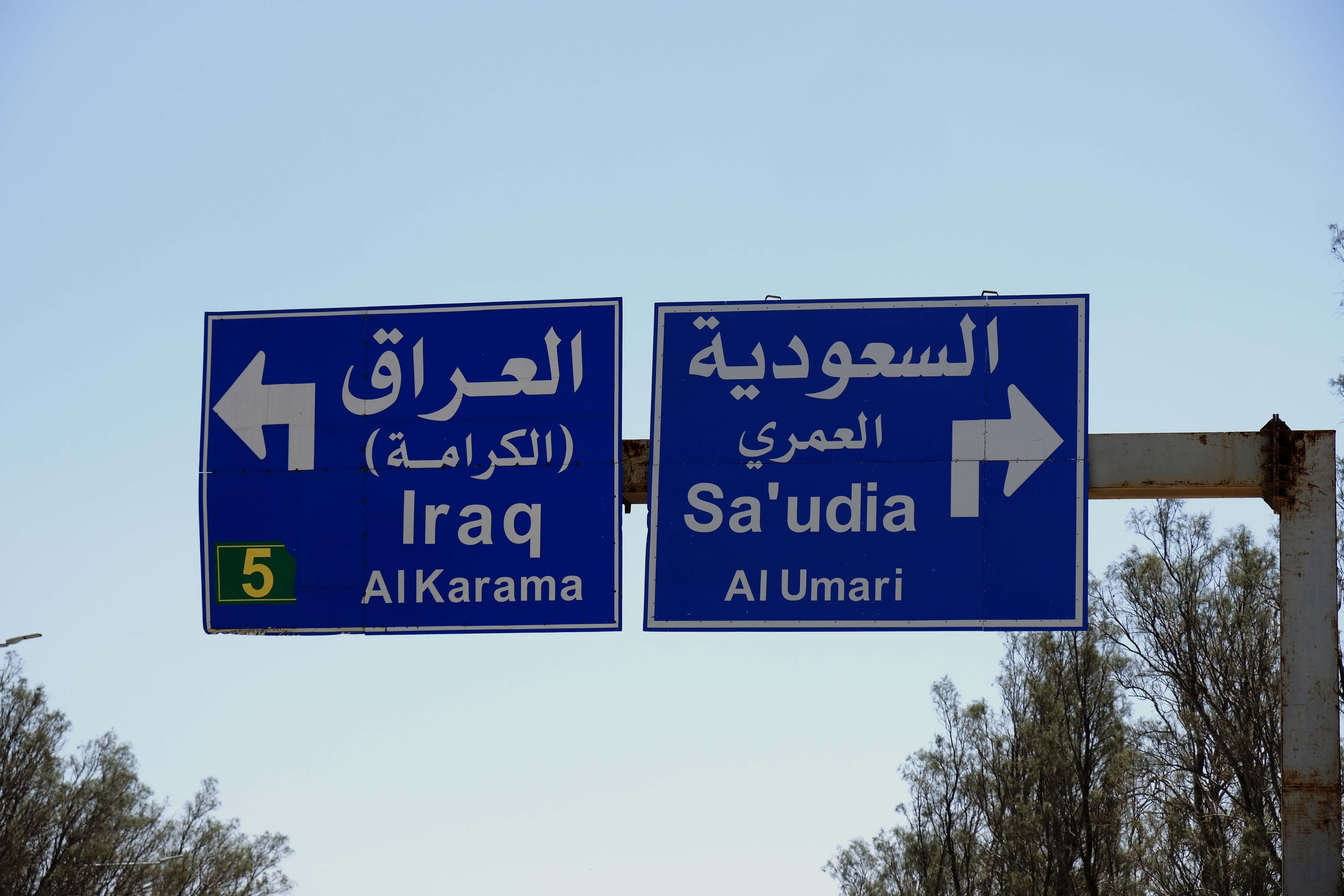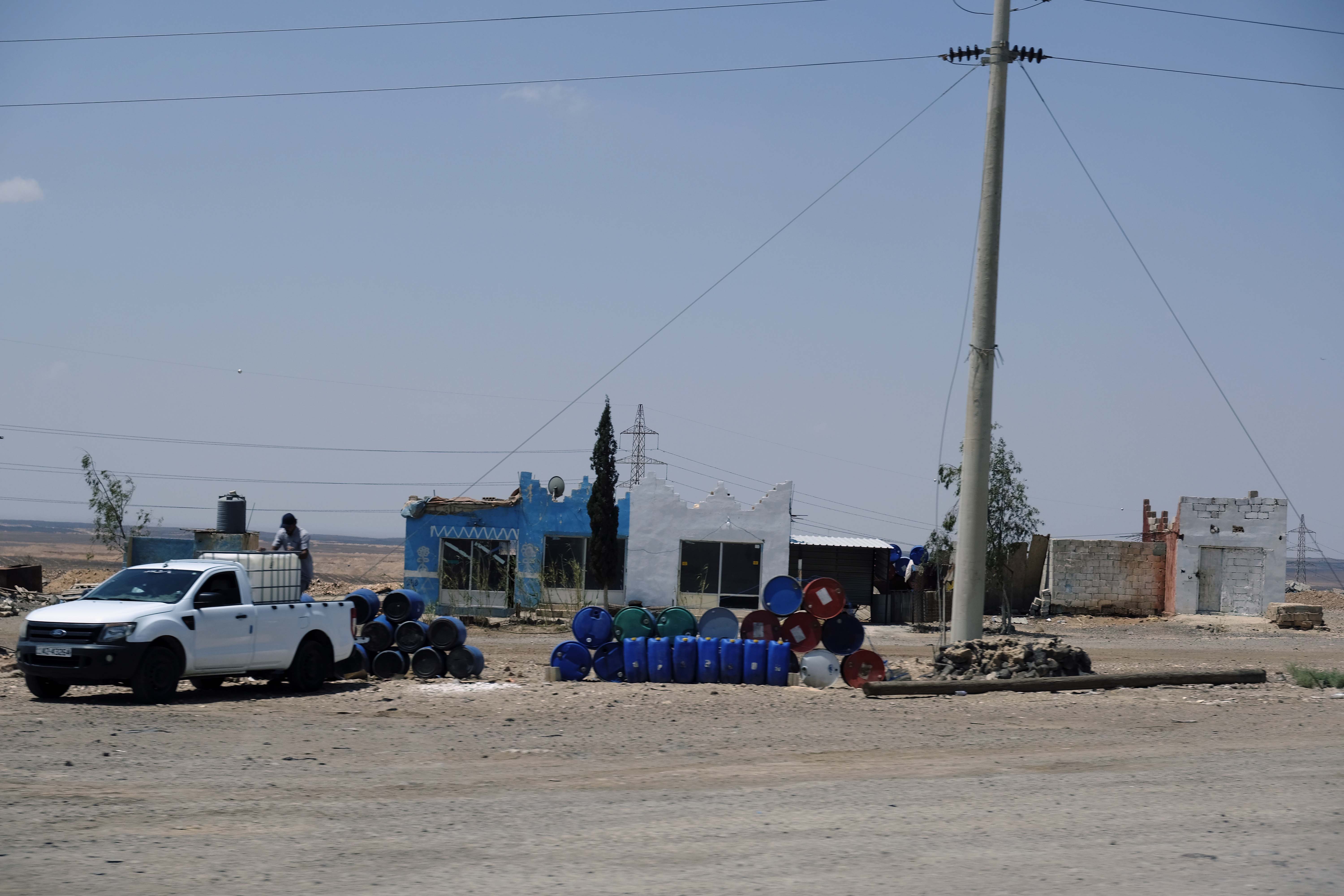 Wir fahren die inzwischen sehr gut ausgebaute Fernstraße von Amman nach Osten und starten in einer savannenähnlichen Landschaft, die sich allmählich zu einer Steinwüste aus Basaltgestein verändert. Uns begleiten hauptsächlich Lastwagen mit Autos und Öl bzw. Benzin beladen, die zwischen Amman, Bagdad und Saudi Arabien verkehren. Einige befördern auch Container aus Jordaniens einzigem Hafen Aqaba.
